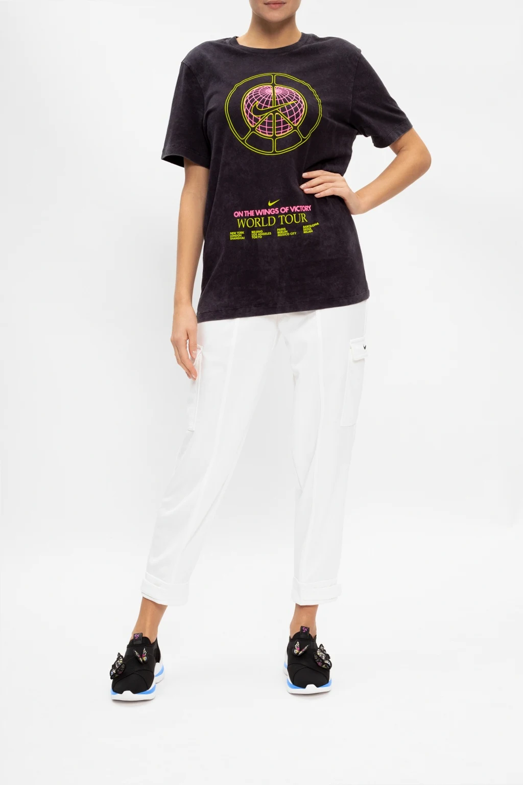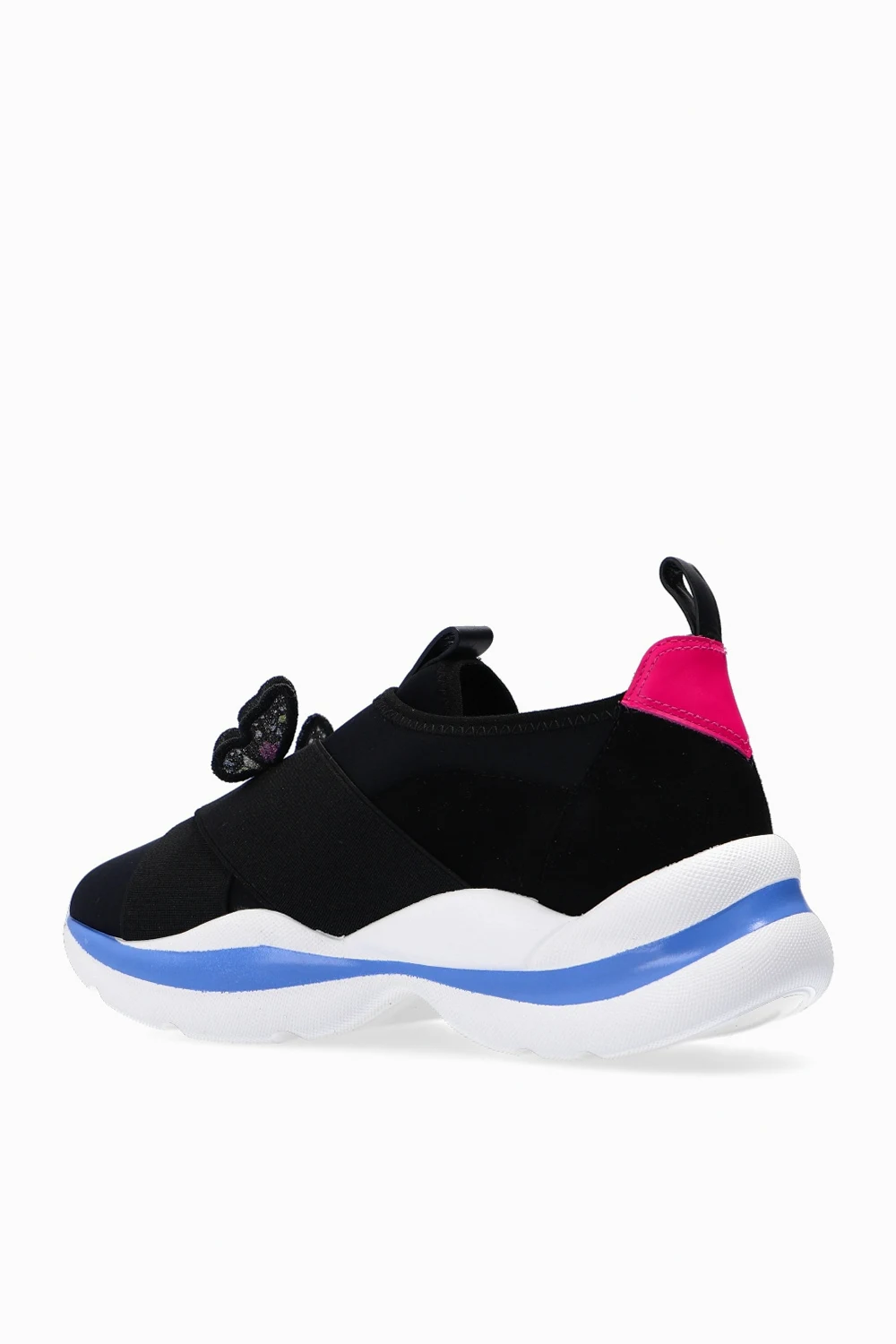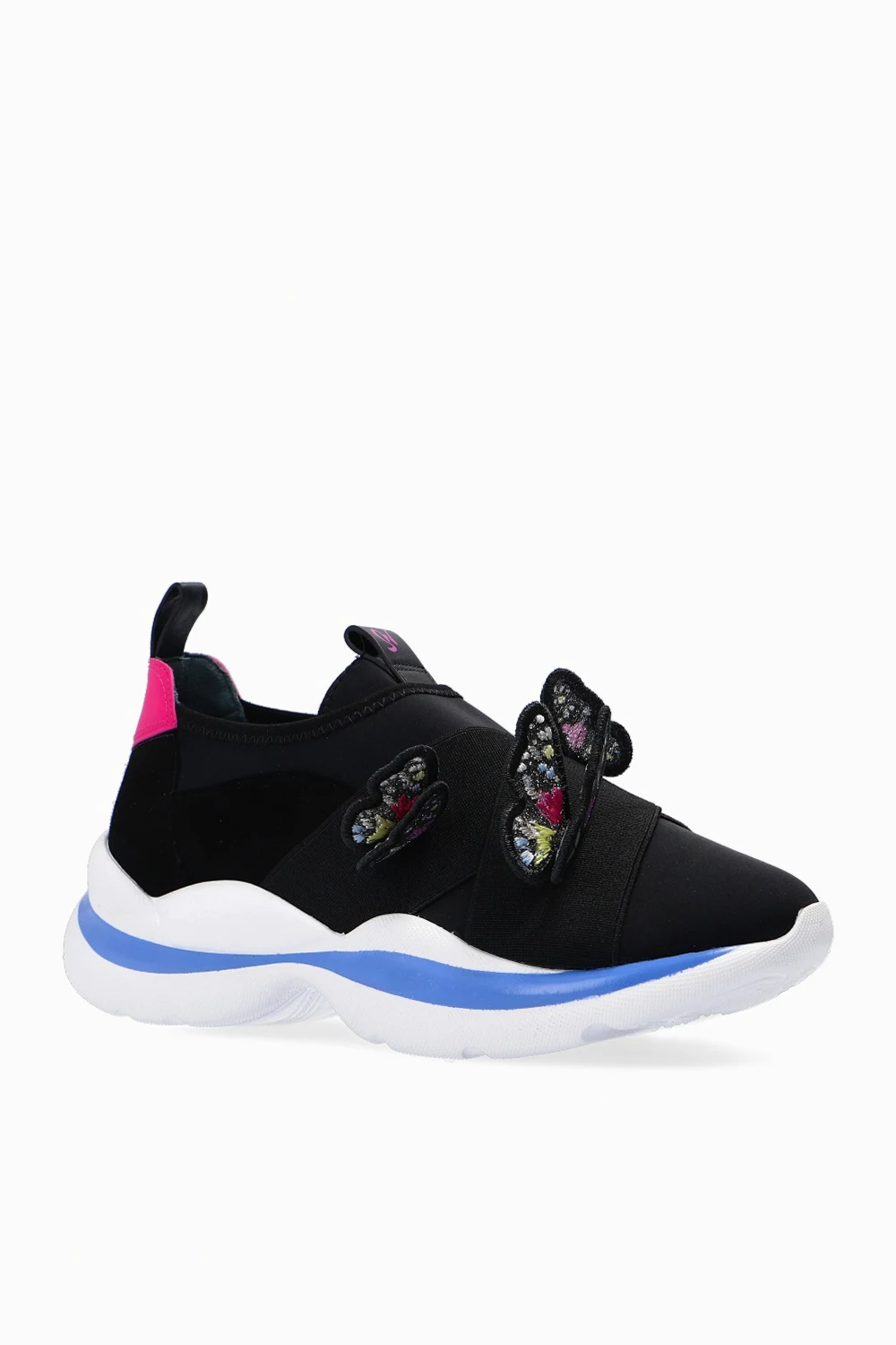 Black ‘Riva’ sneakers from Sophia Webster. Set on a white rubber sole, this slip-on design is enriched with the signature butterfly motif and inserts in pink and blue.
