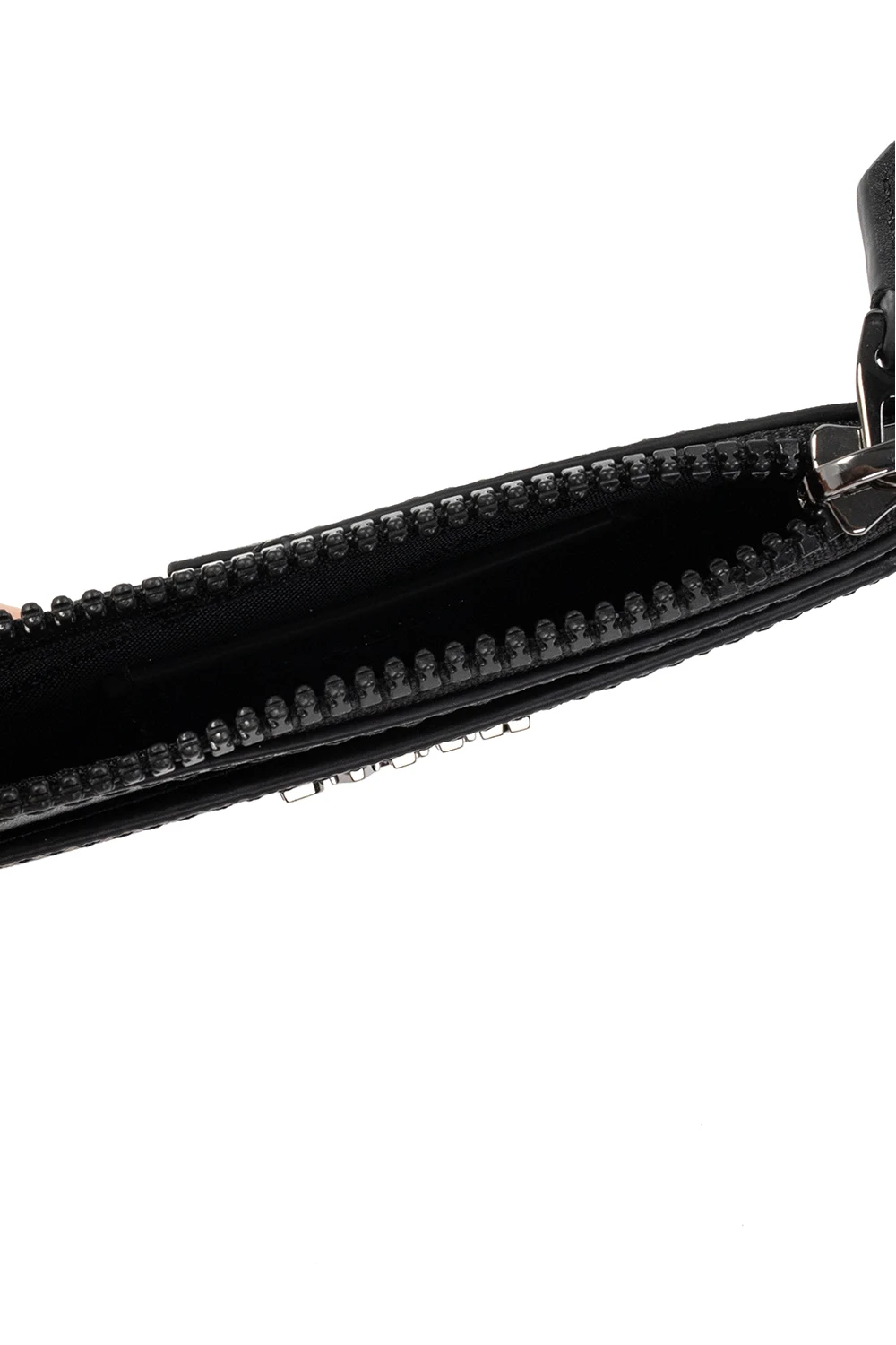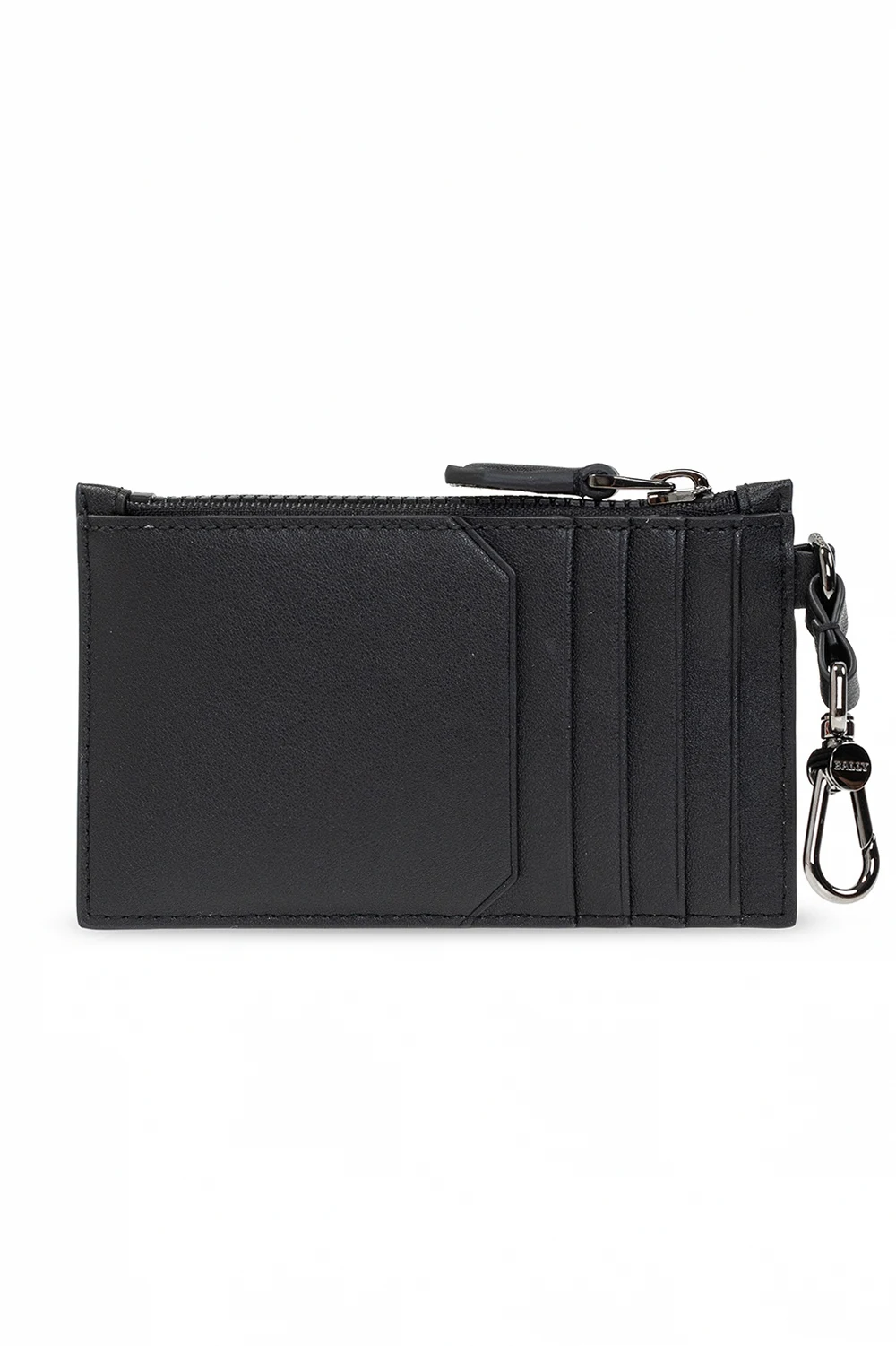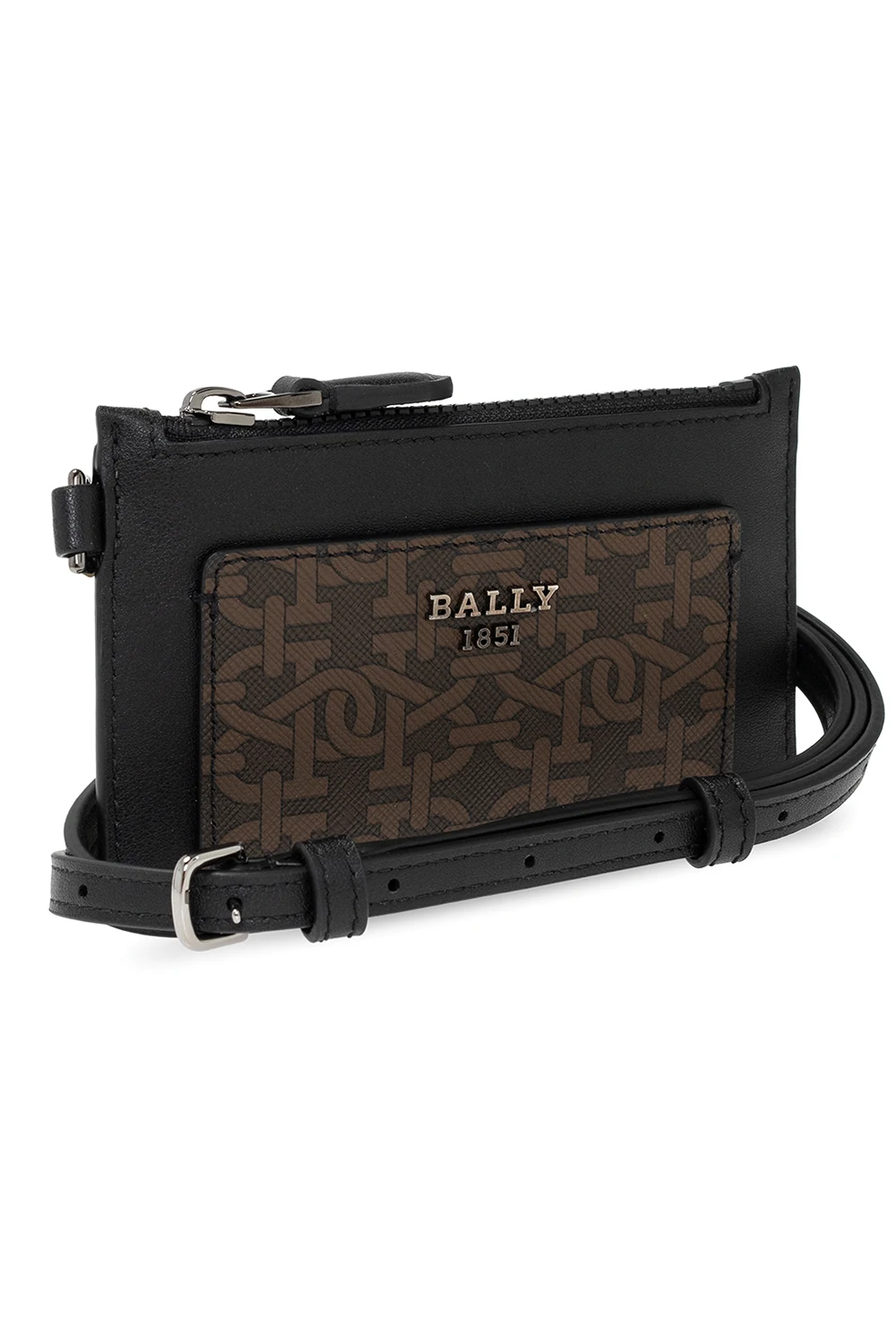 Black and brown card holder with a strap from Bally. Crafted from leather and canvas decorated with a logo motif, this item features a metal logo, detachable and adjustable strap, one zip pocket and six card slots.