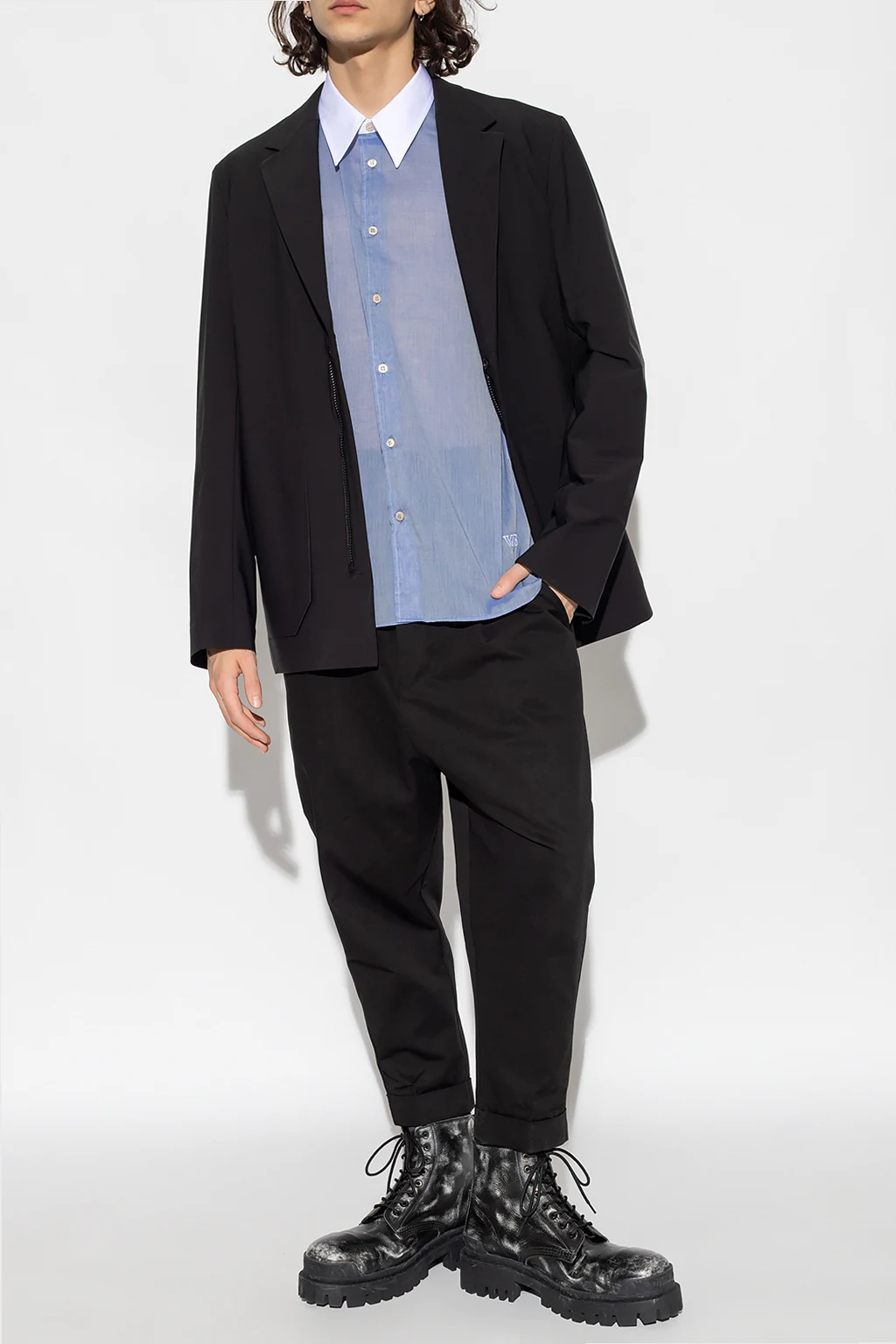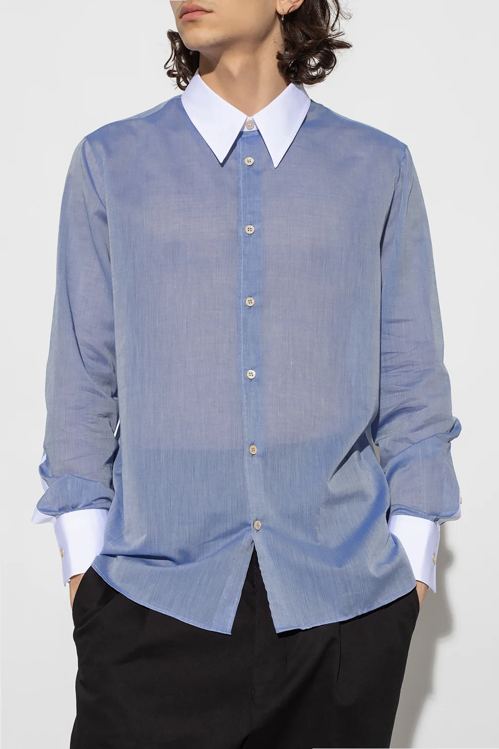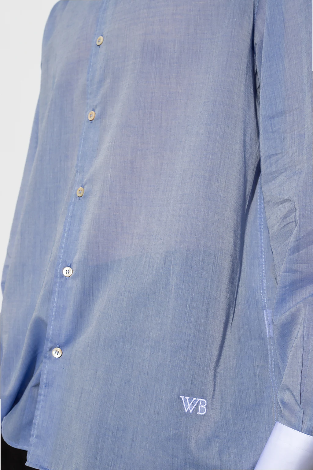Blue ‘Market’ shirt from Wales Bonner. Made of partially sheer cotton, this garment features button fastenings, logo embroidery, white collar and long sleeves with buttoned cuffs.