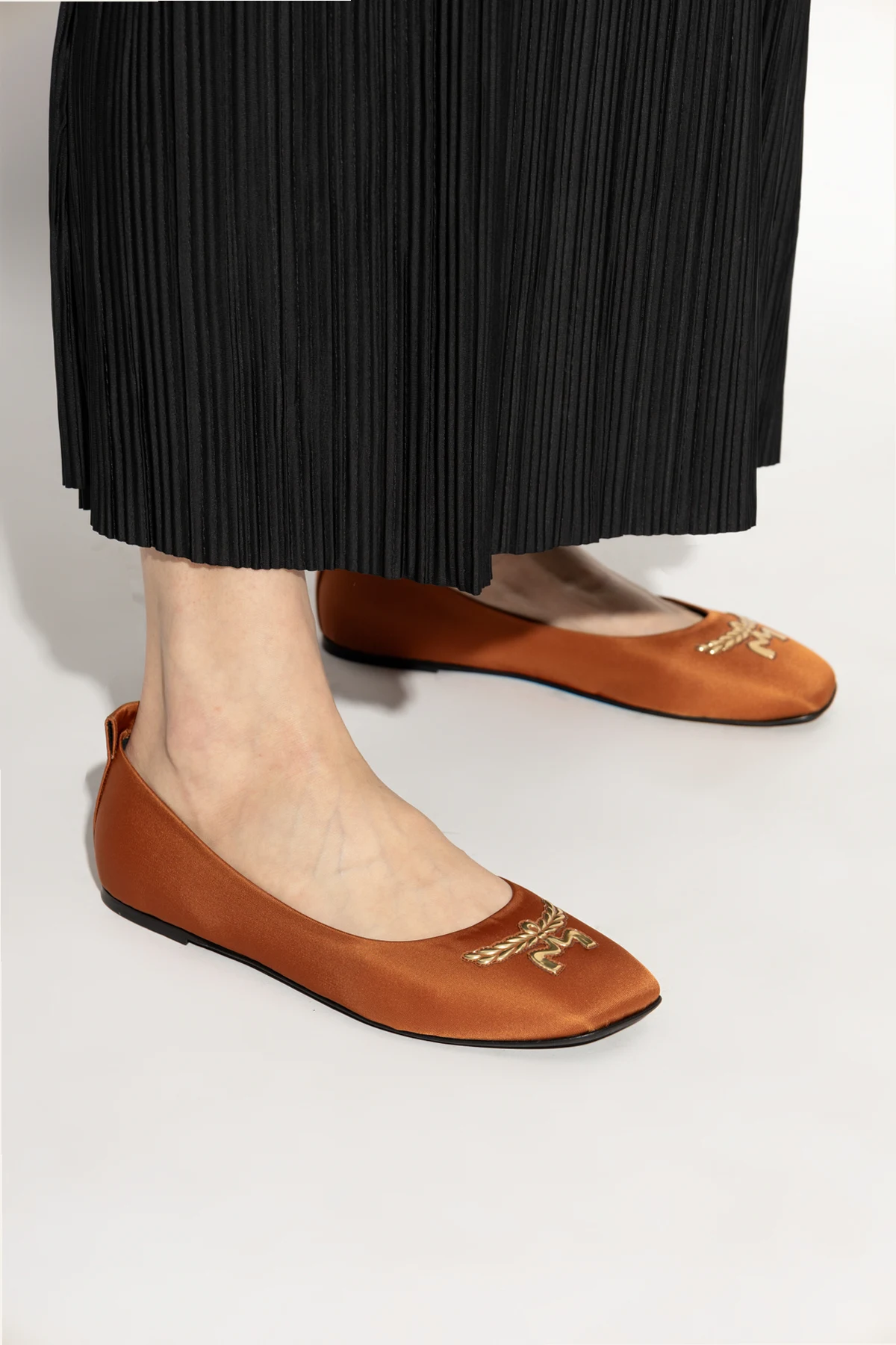 Wir präsentieren Ihnen BALLET FLATS aus der exklusiven Kollektion Mode Creation Munich, die Komfort mit unverwechselbarem Stil perfekt verbinden. Das klassische Design mit abgerundeter Spitze wird durch ein goldenes Detail in Form von Lorbeerblättern bereichert, was den Schuhen subtile Eleganz verleiht.