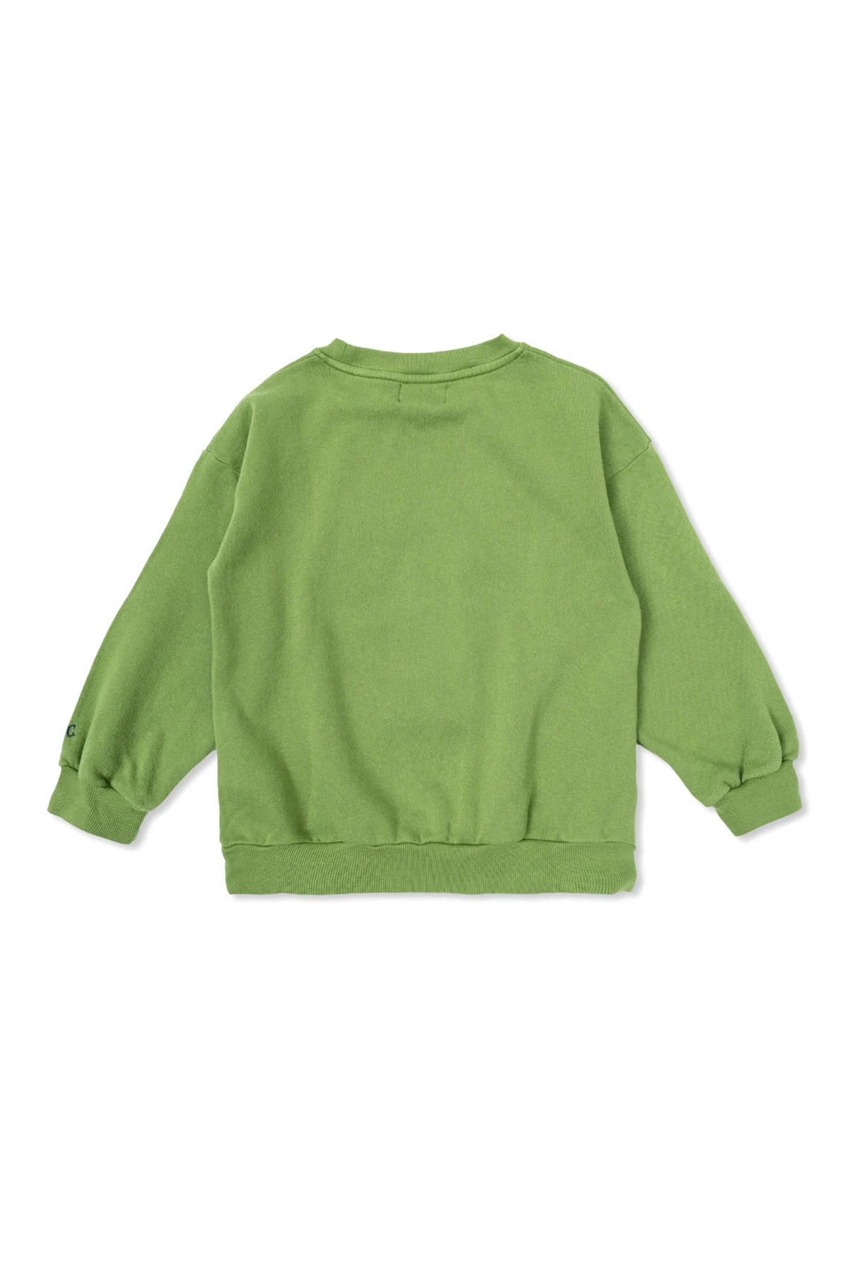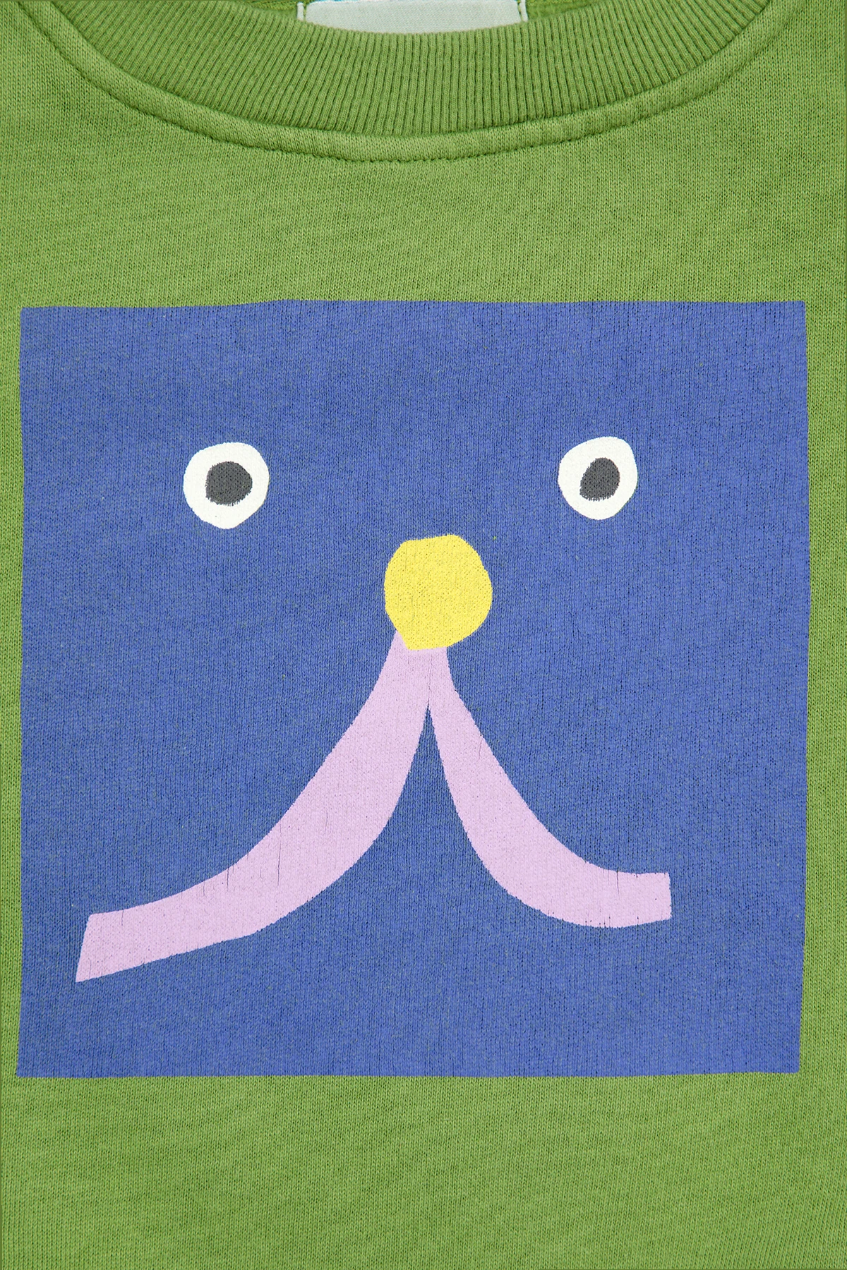 Wir präsentieren einen äußerst eleganten Baumwollpullover für Kinder aus der exklusiven Bekleidungskollektion der Marke Bobo Choses . Der Pullover in dominierendem Grün ist auf der Vorderseite mit einem großen, quadratischen Aufdruck in Blautönen verziert, der eine vereinfachte Grafik eines Tiergesichts mit weißen Augen, gelber Nase und einem rosa Akzent, der an Lippen oder Schnurrhaare erinnert, darstellt.