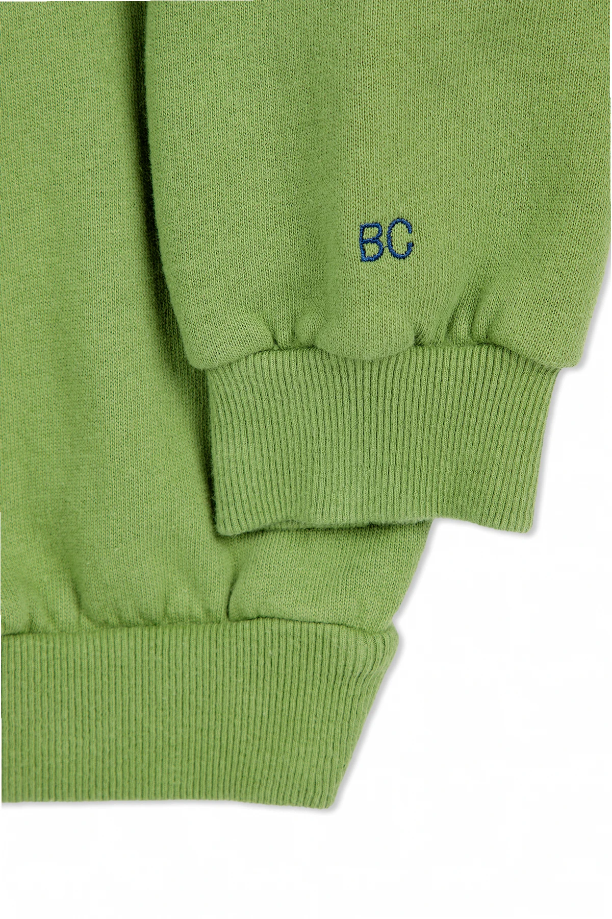 Die Rückseite des Pullovers bleibt vollständig grün und betont seinen minimalistischen, aber dennoch eleganten Charakter. Hergestellt aus 100% Bio-Baumwolle, bietet er außergewöhnliche Weichheit und Tragekomfort. Ein Detail, das diesen Pullover auszeichnet, ist die dezente Stickerei mit den Initialen "BC" in Blau, die auf der Manschette eines Ärmels platziert ist.