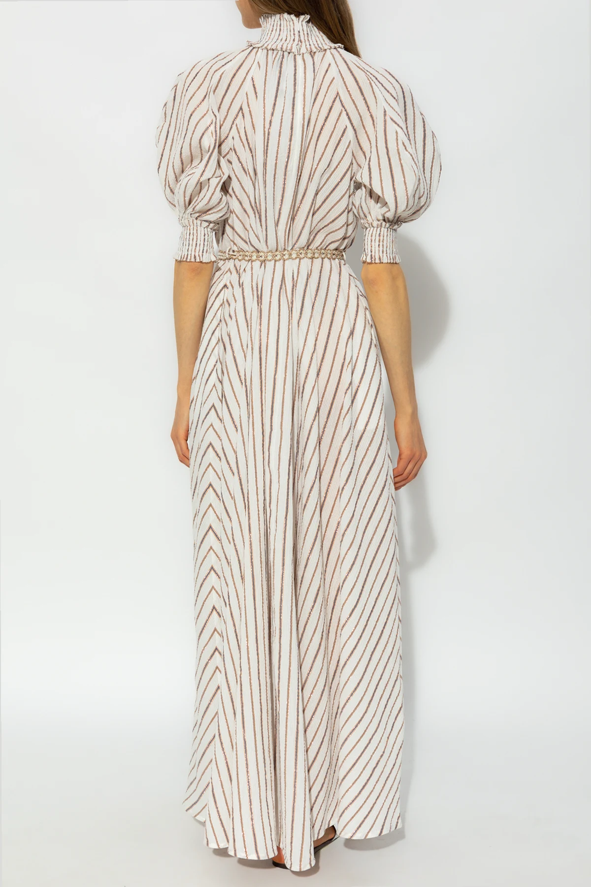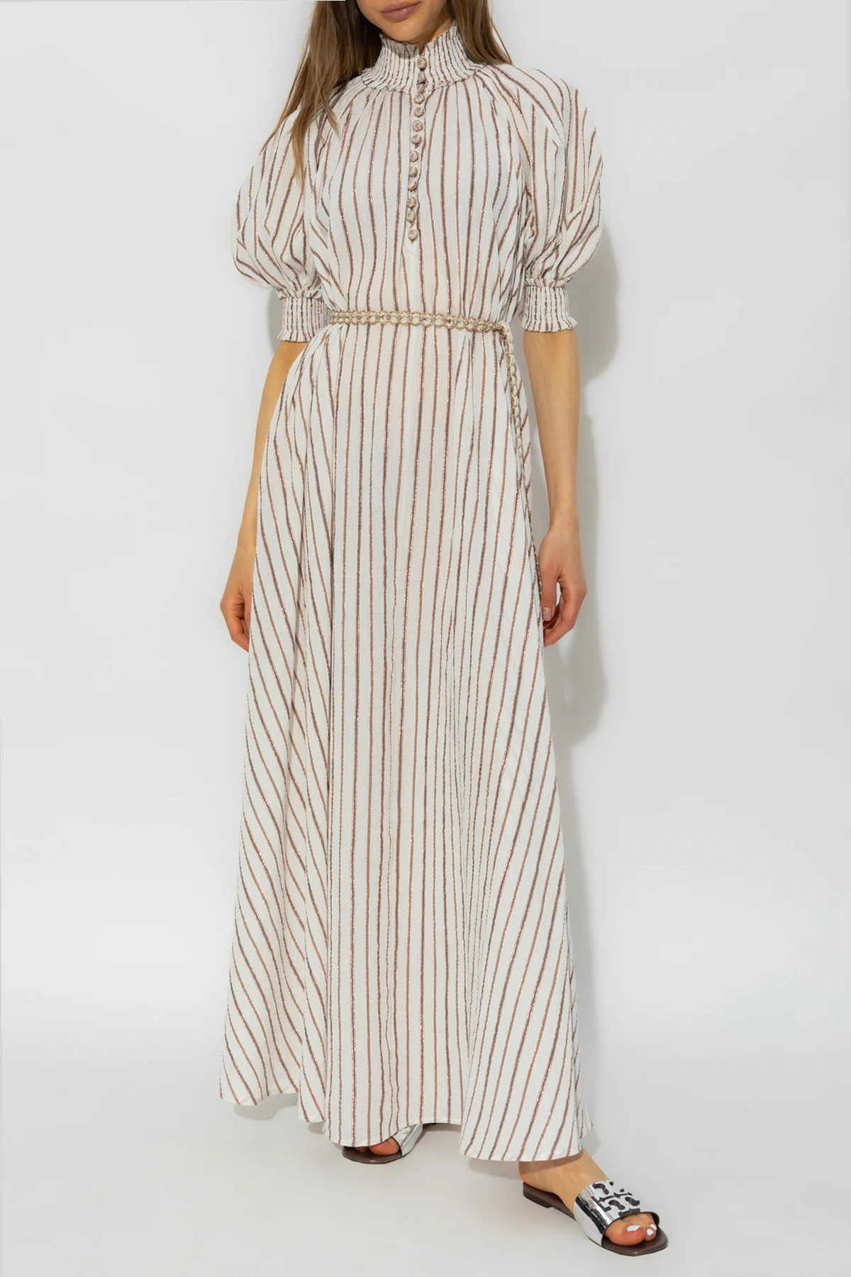 White maxi dress from Zimmermann. Crafted from cotton and inlaid with copper-coloured lurex yarn, this style fastens with buttons on the front and hidden zipper at the back and features a colourful pattern with vertical stripes. It is complete with a ruched standing collar, woven belt with a glossy trim and fringes, puff short sleeves with elasticated cuffs and a flared hem with two slip pockets.