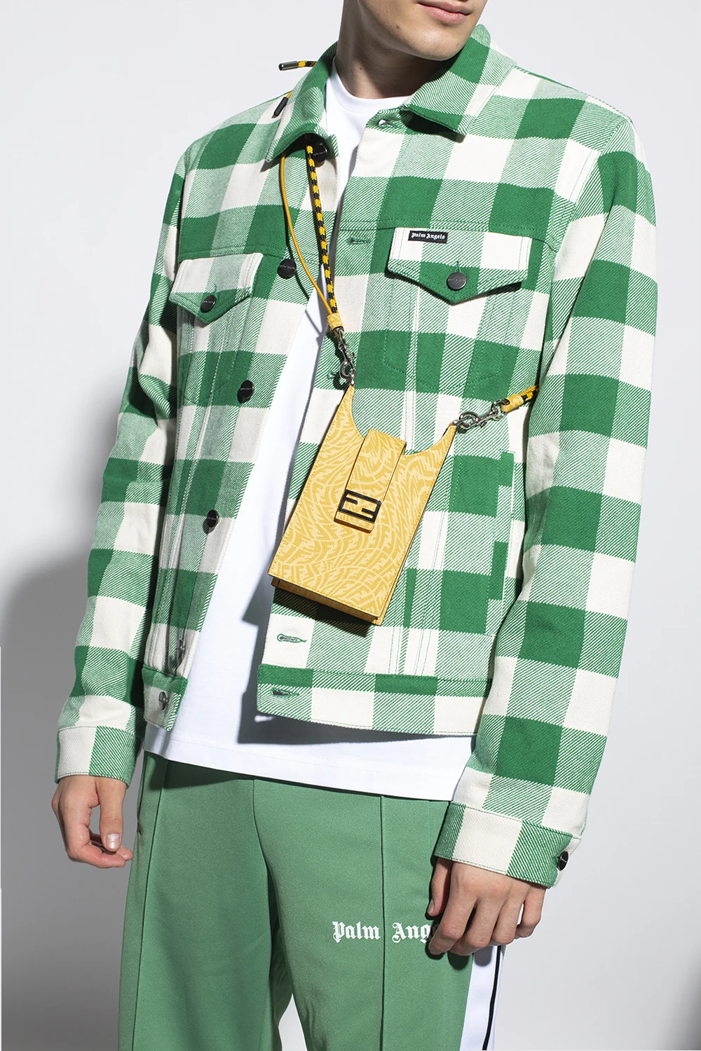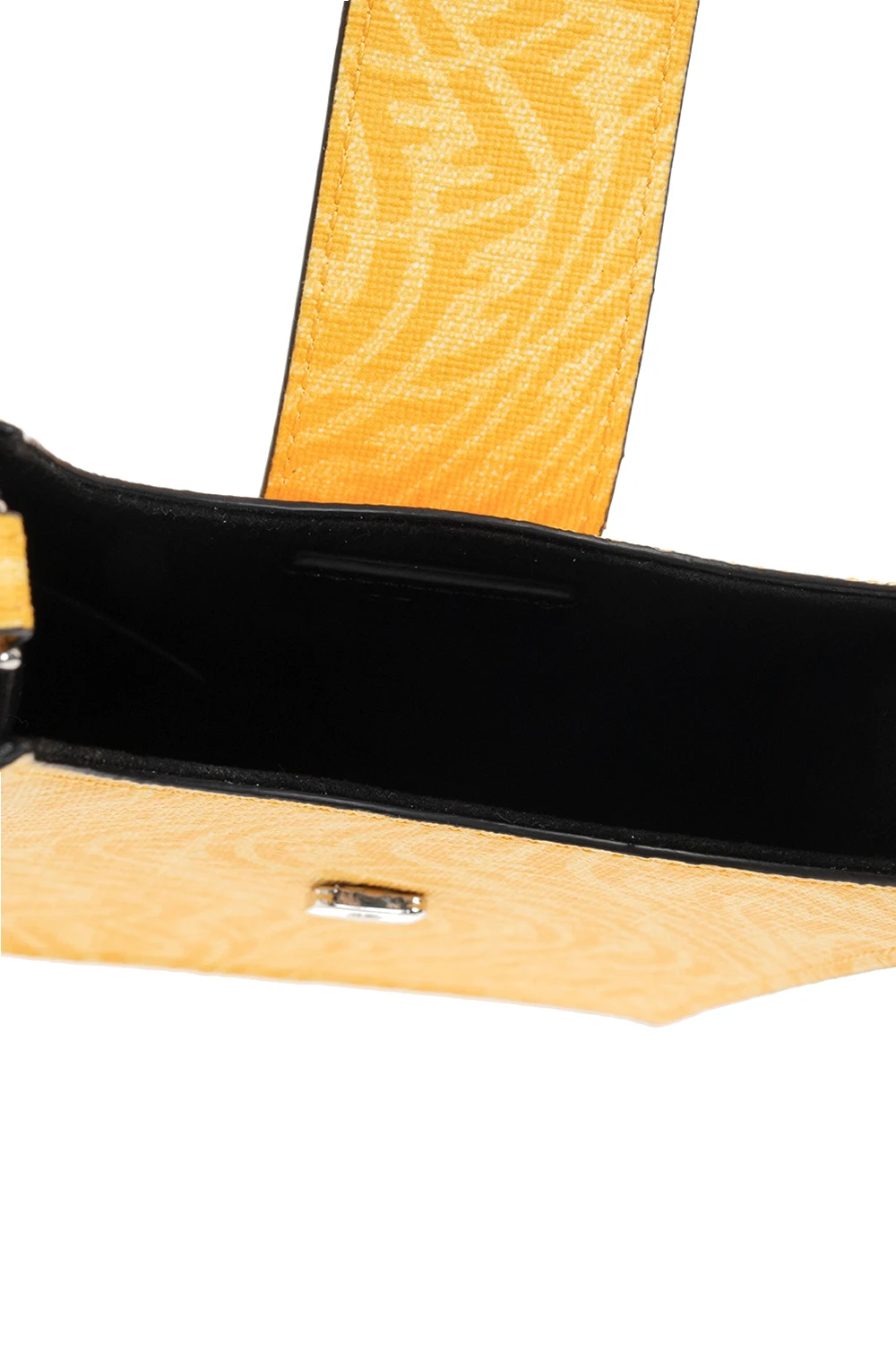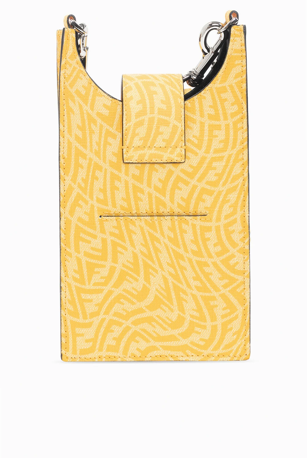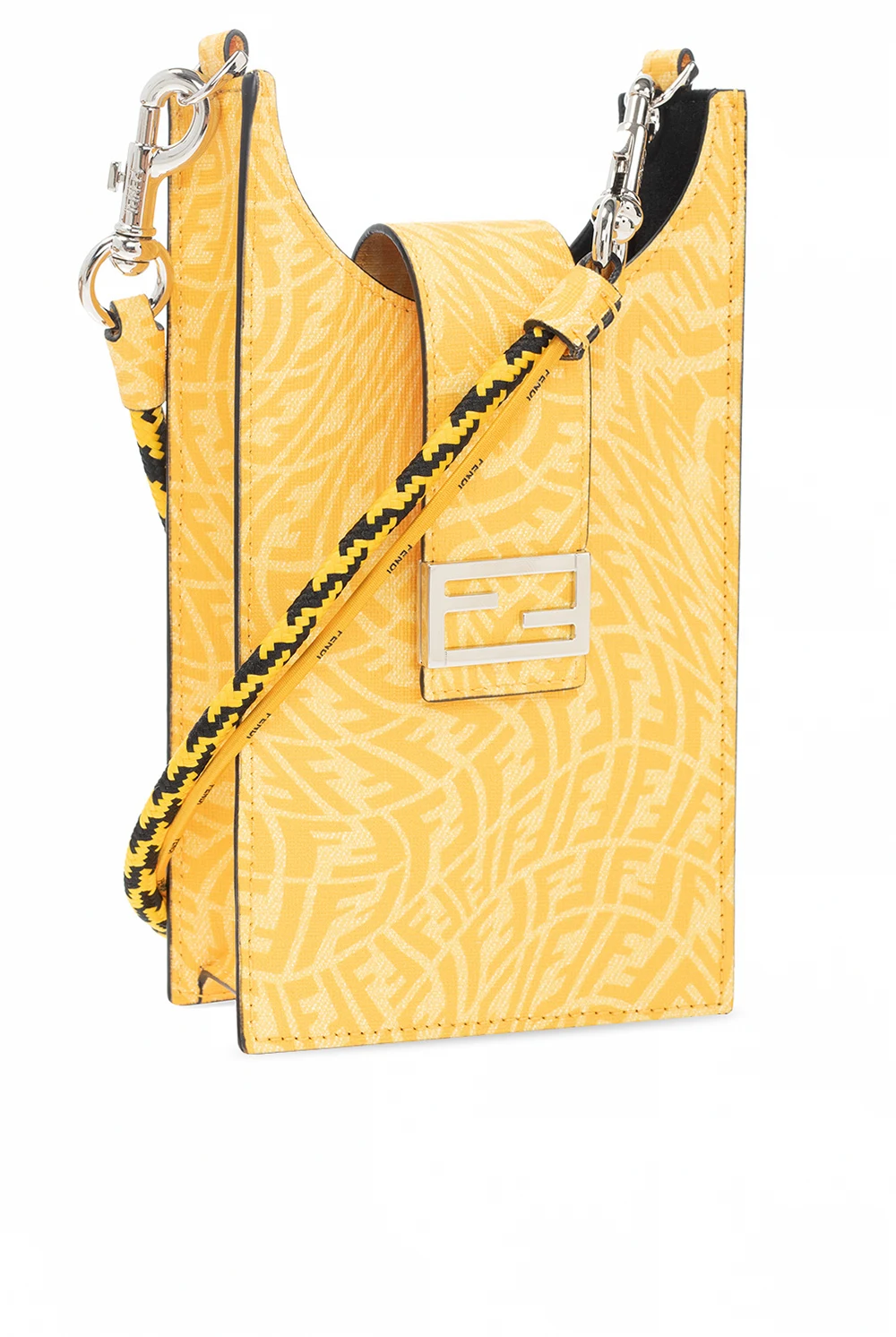 Yellow phone holder from Fendi. Emblazoned with the ‘F’ monogram, this design fastens via a zip and features a shoulder strap, silver-tone metal hardware and one internal compartment.
