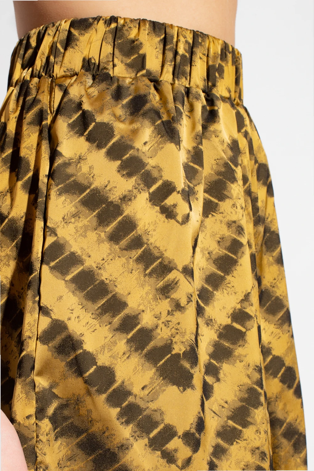 Gold-tone and black shorts from Oseree. Made of satin and decorated with a graphic pattern, they feature a high-waisted silhouette with an elasticated waistband and lurex trimming.