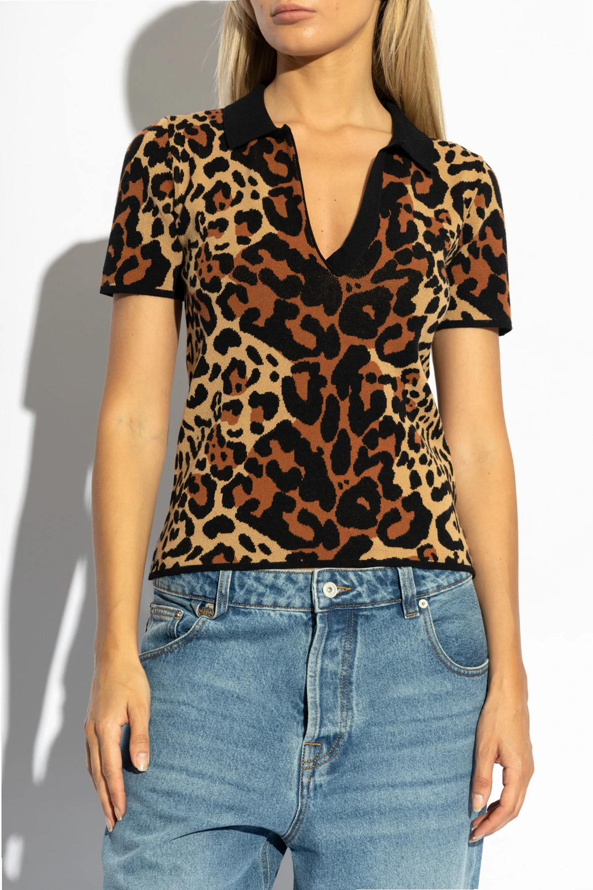 Das Shirt verfügt über einen klassischen Schnitt mit kurzen Ärmeln und einem schwarzen Polokragen, der einen harmonischen Kontrast zum restlichen Muster bildet. Der tief ausgeschnittene V-Ausschnitt verleiht ihm einen eleganten Charakter.