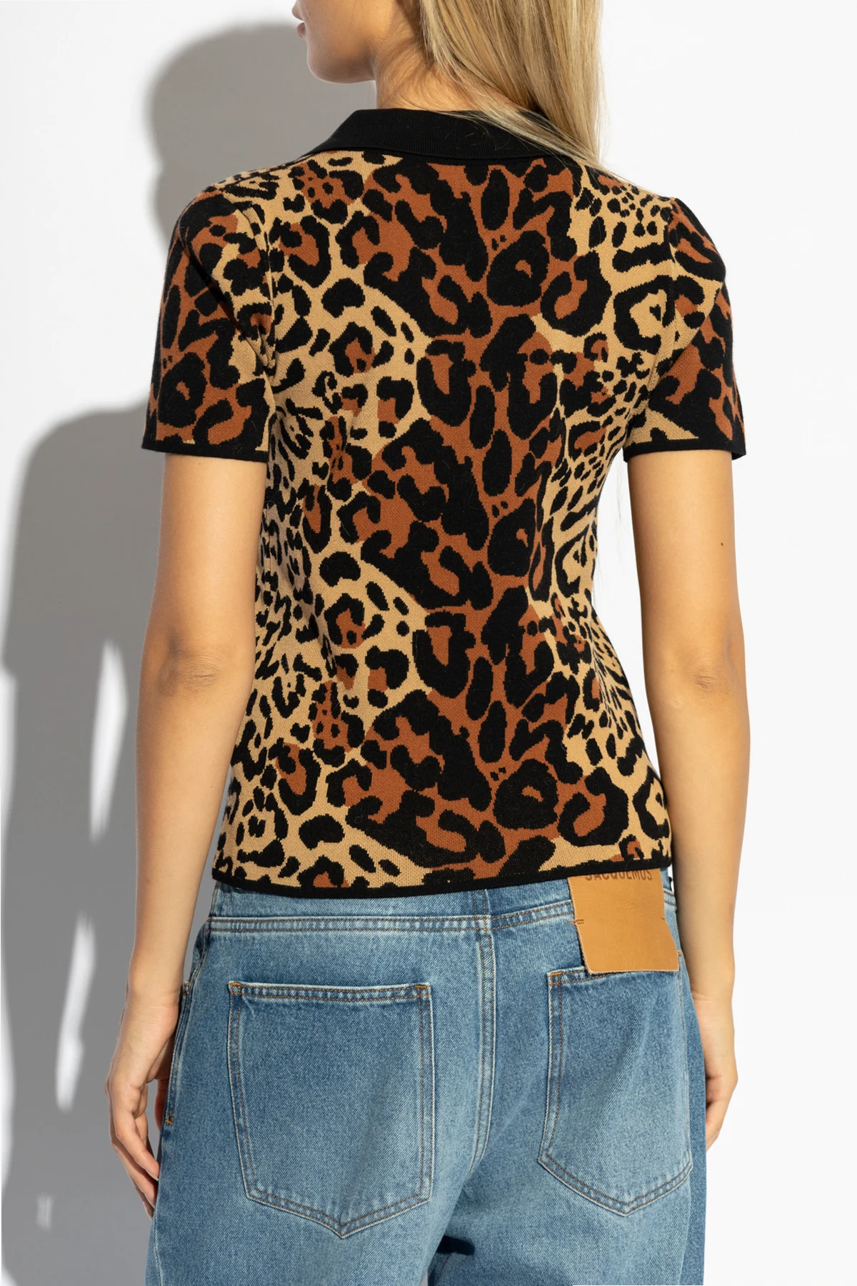Das exklusive Kurzarm-Poloshirt von Blumarine ist die Quintessenz von Eleganz und markantem Stil. Das Produkt besticht durch ein einzigartiges Tiermuster, das an ein Panthermuster erinnert, in dominierenden Brauntönen, Schwarz und Beige.
