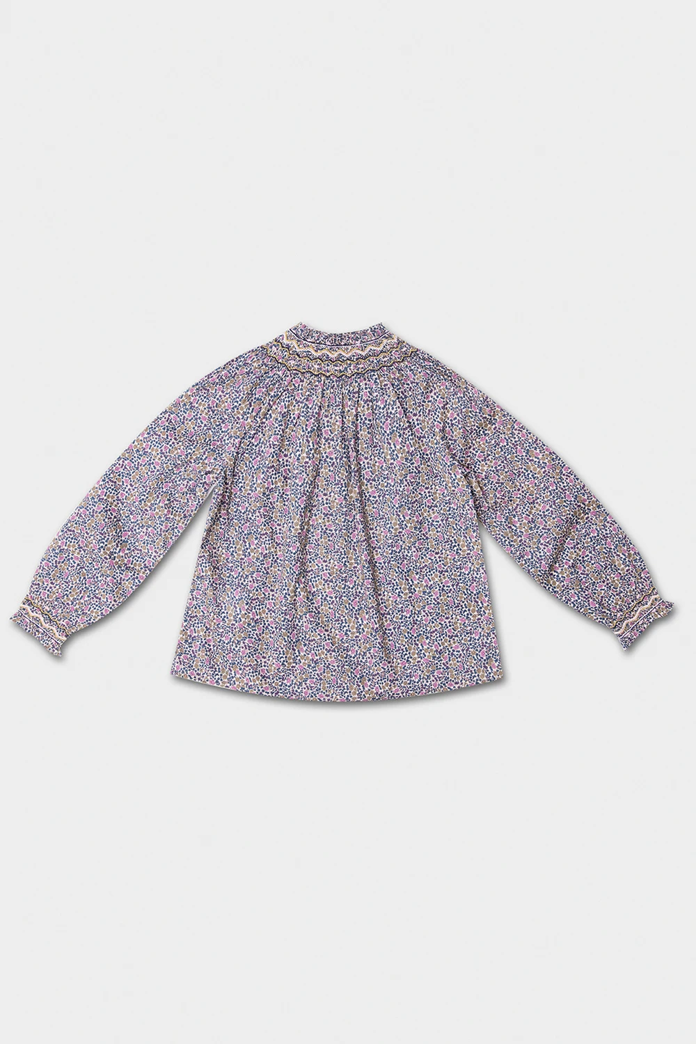 Multicolored top from Bonpoint. Made of Liberty cotton, this long sleeve design features a multicolored embroidery, floral print and stand collar with buttons.