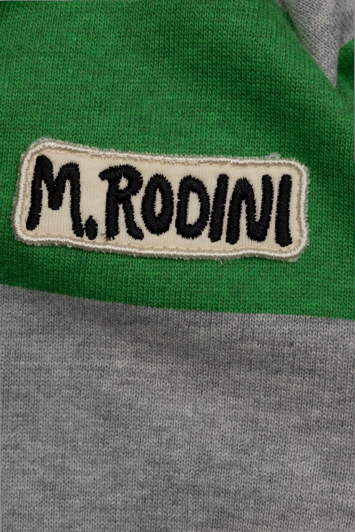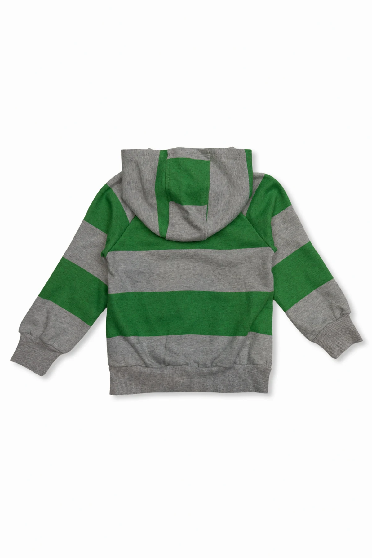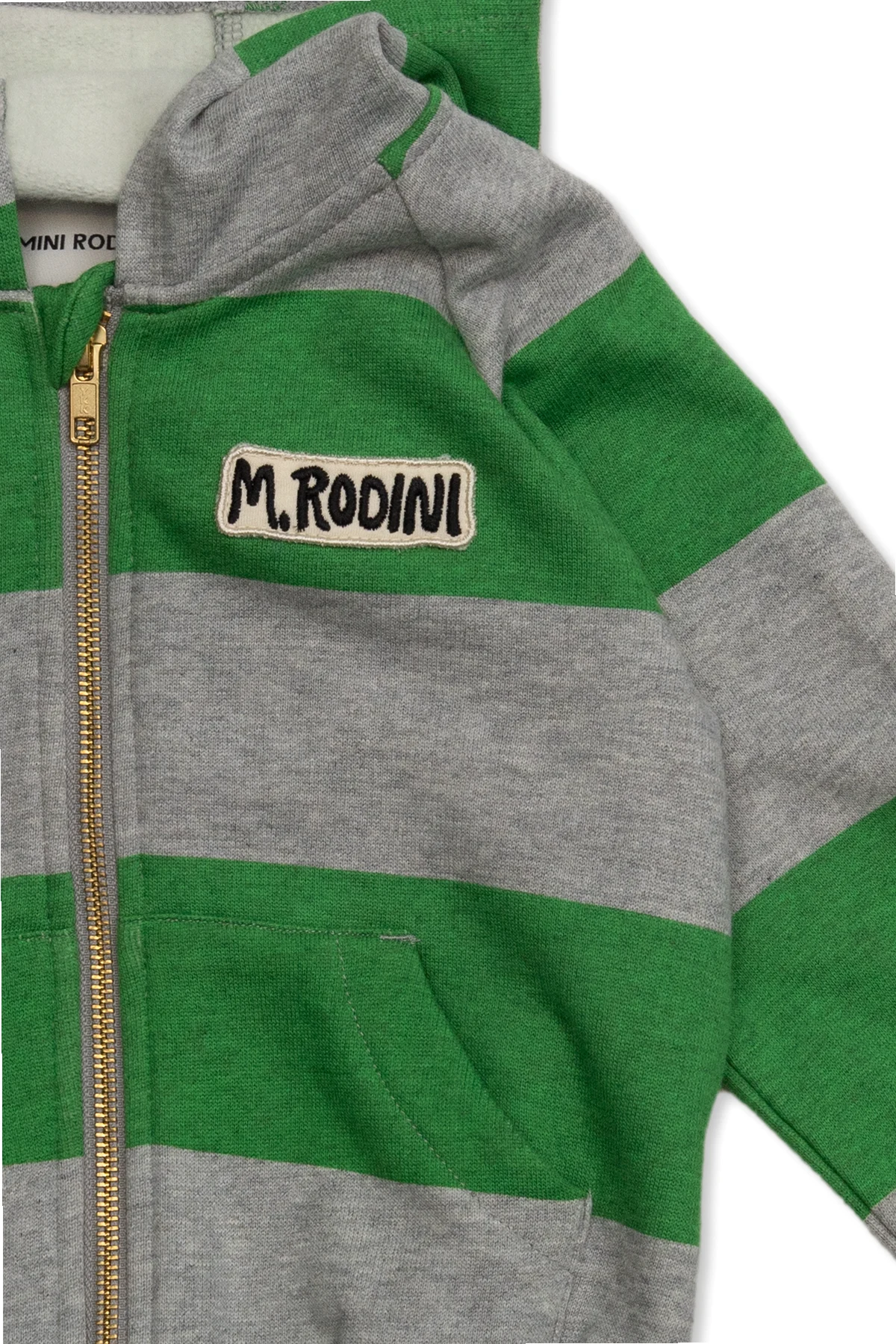 Grey and green hoodie from Mini Rodini. Crafted from organic cotton with the GOTS certificate, this item fastens via a zip and features a logo patch and stripe pattern. It is complete with two slip pockets and ribbing on the bottom hem and cuffs.