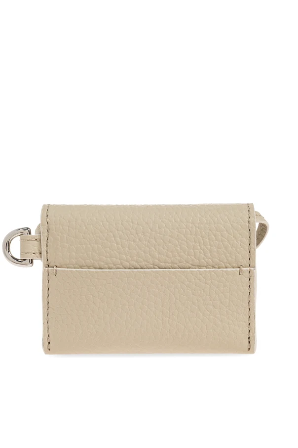 Die Brieftasche ist aus natürlichem, geprägtem Rindsleder mit markanter, grobkörniger Struktur gefertigt. Die dominierende cremefarbene Nuance verleiht subtile Eleganz und Vielseitigkeit und erleichtert das Kombinieren mit unterschiedlichsten Outfits. Auf der Vorderseite ist dezent das geprägte Designer-Logo platziert – ein feiner Akzent von Luxus.