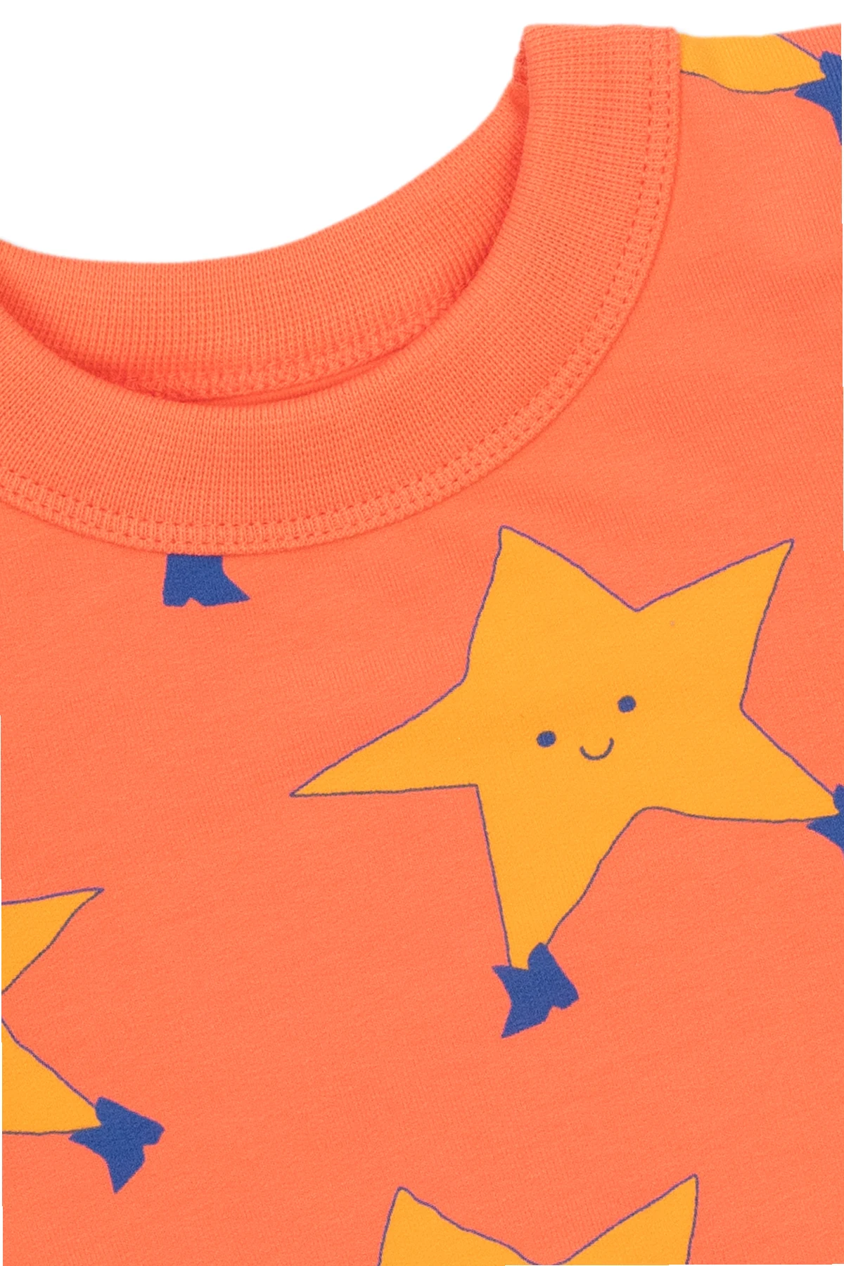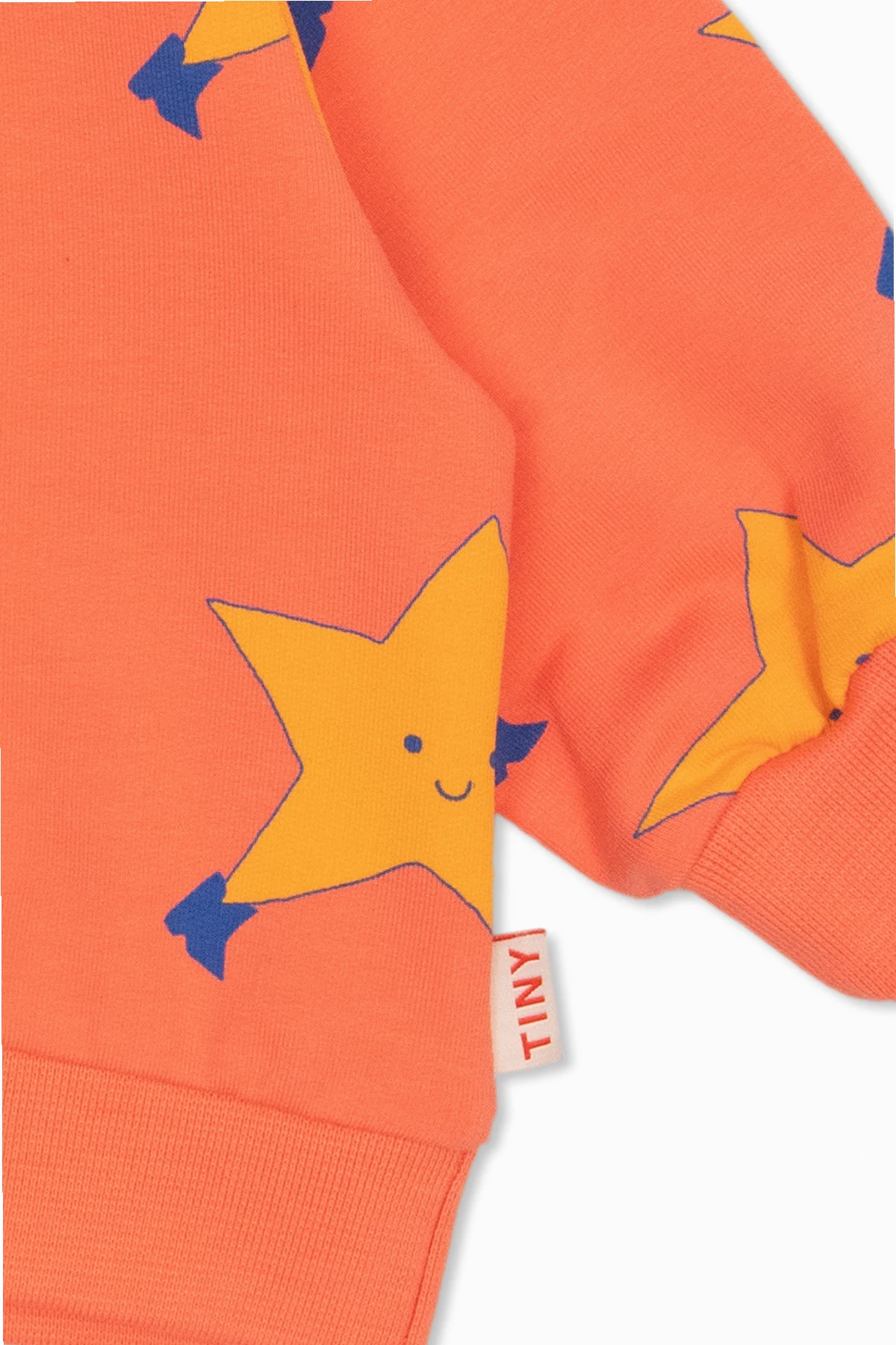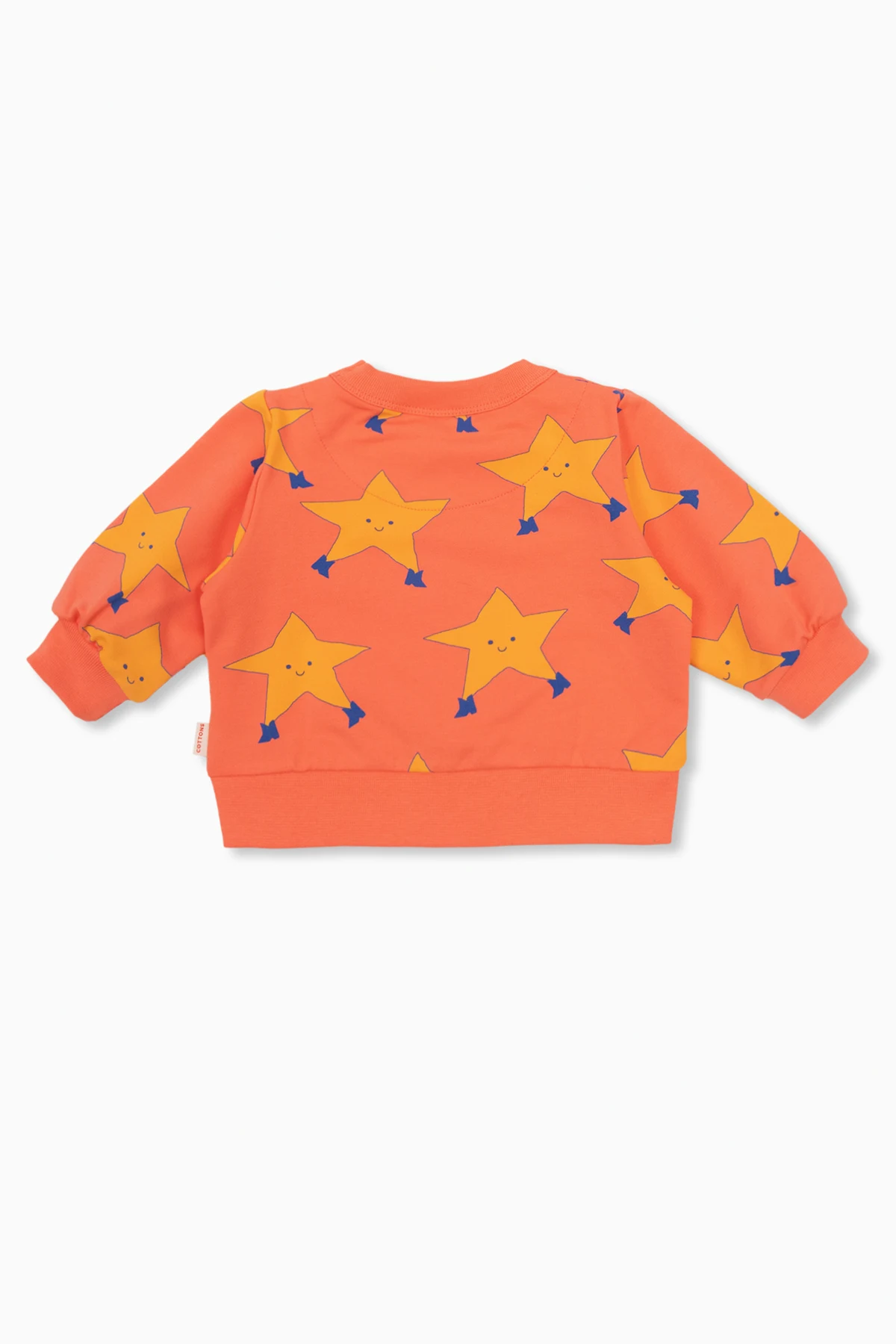 Pinkish orange crewneck sweatshirt from Tiny Cottons. Made of Pima cotton, this long sleeve design features an orange and blue dancing star motif and ribbed trims at the crew neck, hem and cuffs.