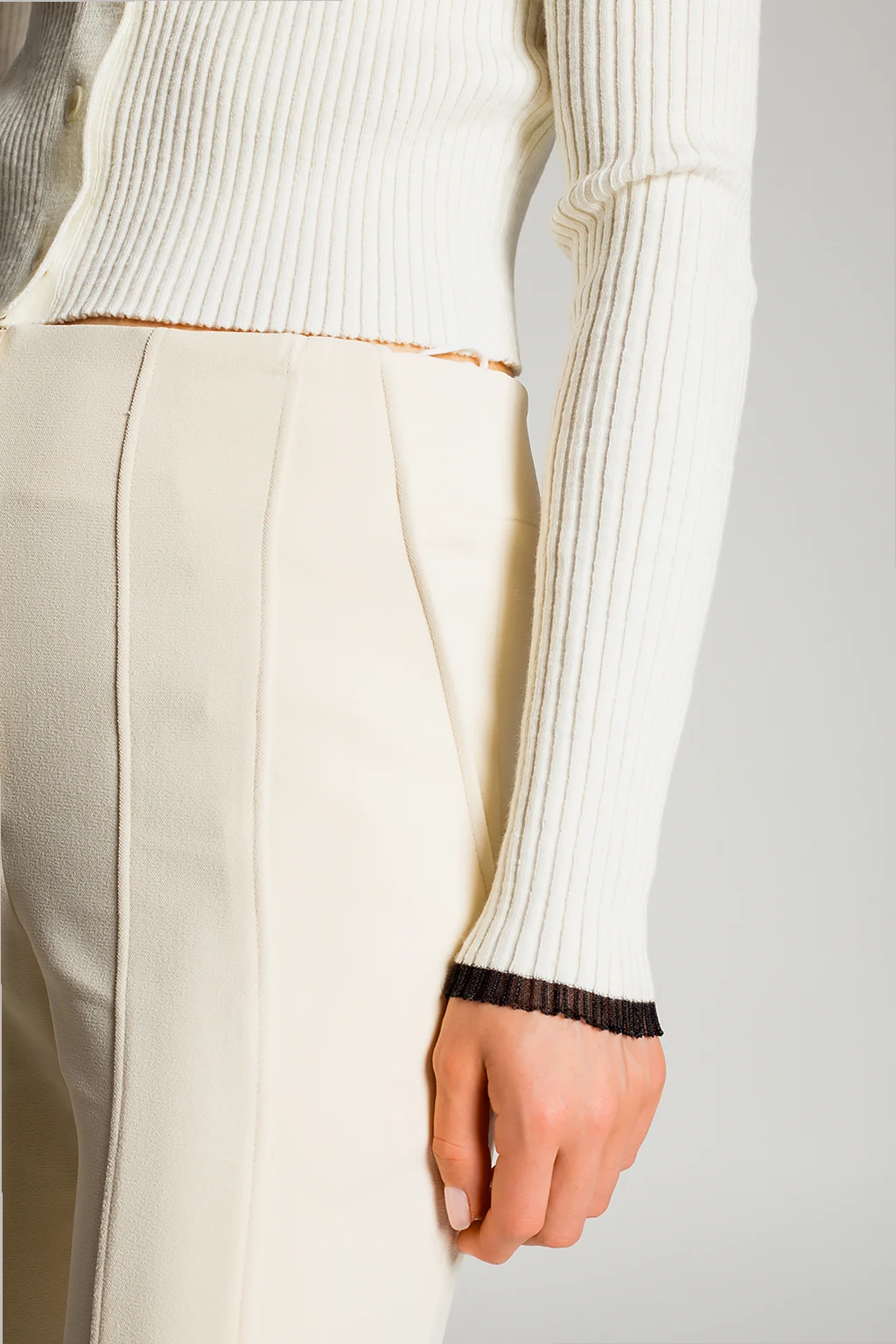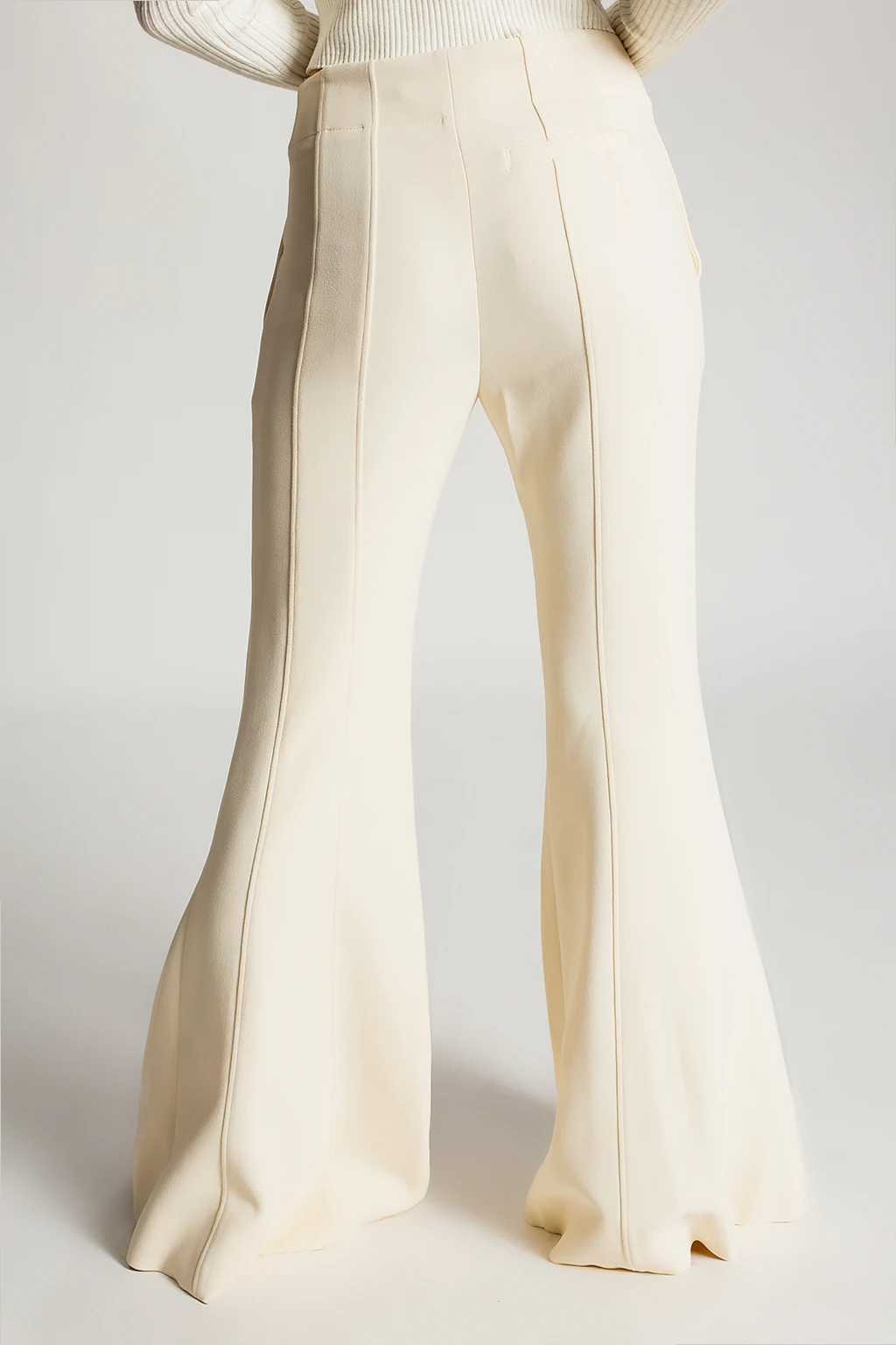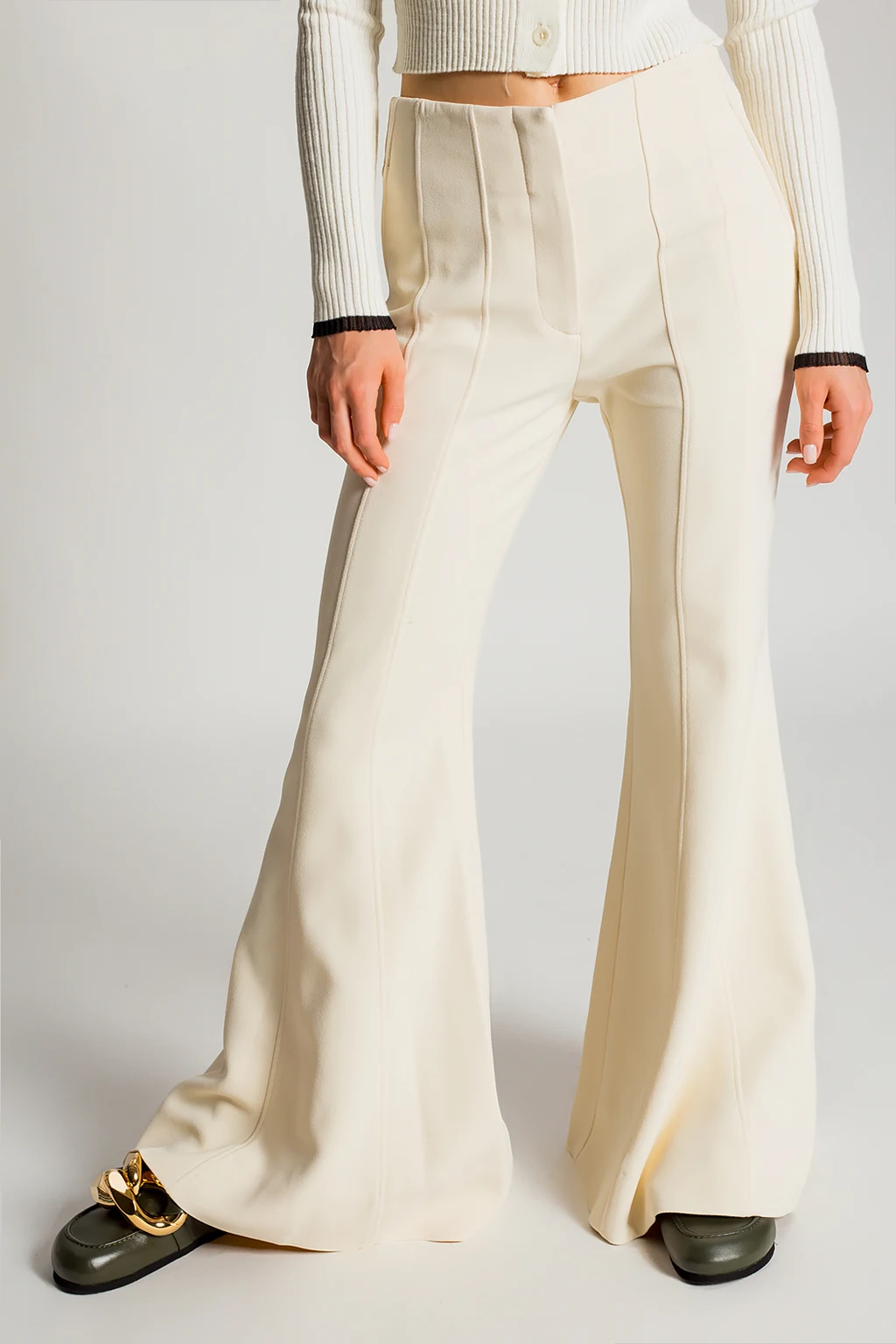 Cream trousers from Proenza Schouler. Falling down with flared legs, this pair features a zip fly with hook & eye closures, three slip pockets and distinctive stitching details.