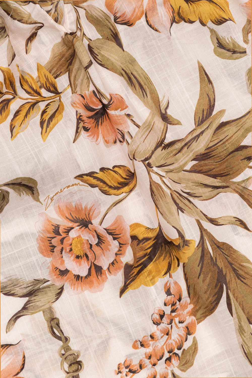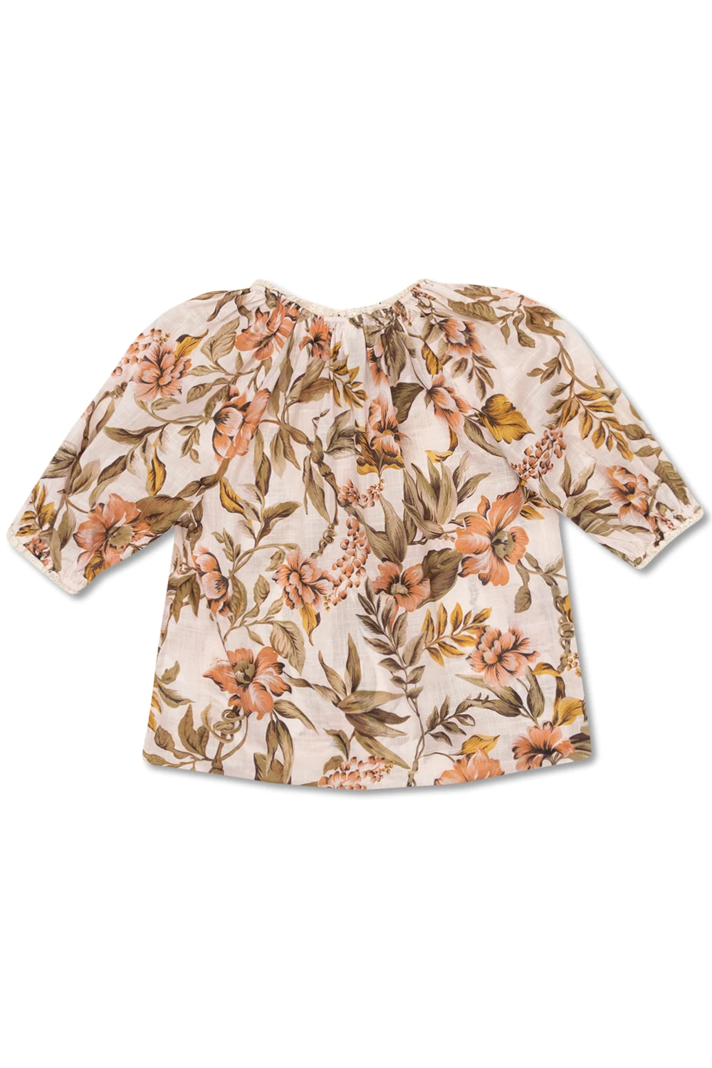 Cream top from Zimmermann Kids. Made of cotton, this style showcases a colourful floral motif. It is complete with a split neckline with drawstring ties and short sleeves with elastic trims and cream lace accents.