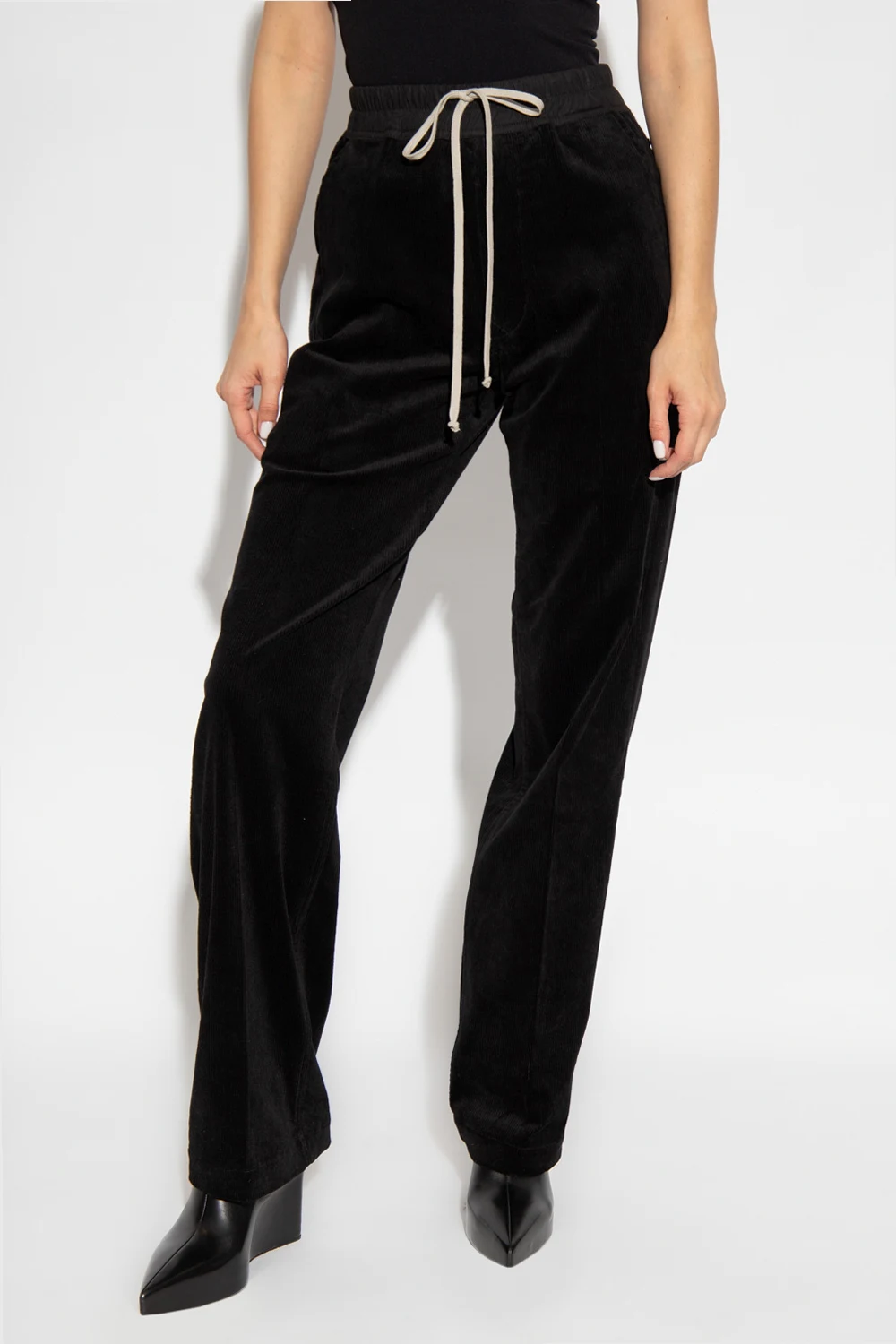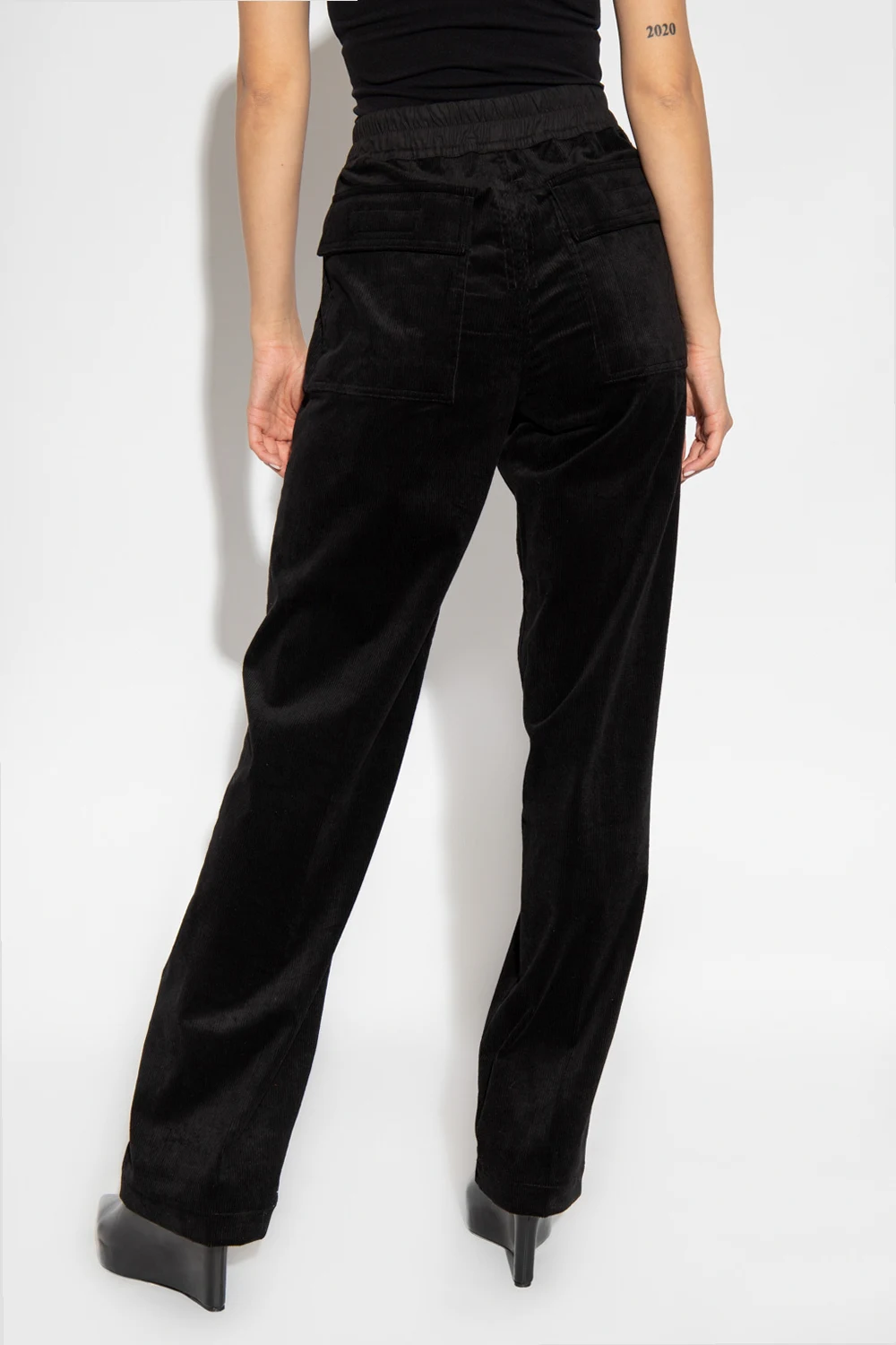 Black corduroy trousers from Rick Owens DRKSHDW. Falling with wide straight legs, this pair features a drawstring waist, two slip pockets on the front and two velcro-fastened flap pockets at the back.