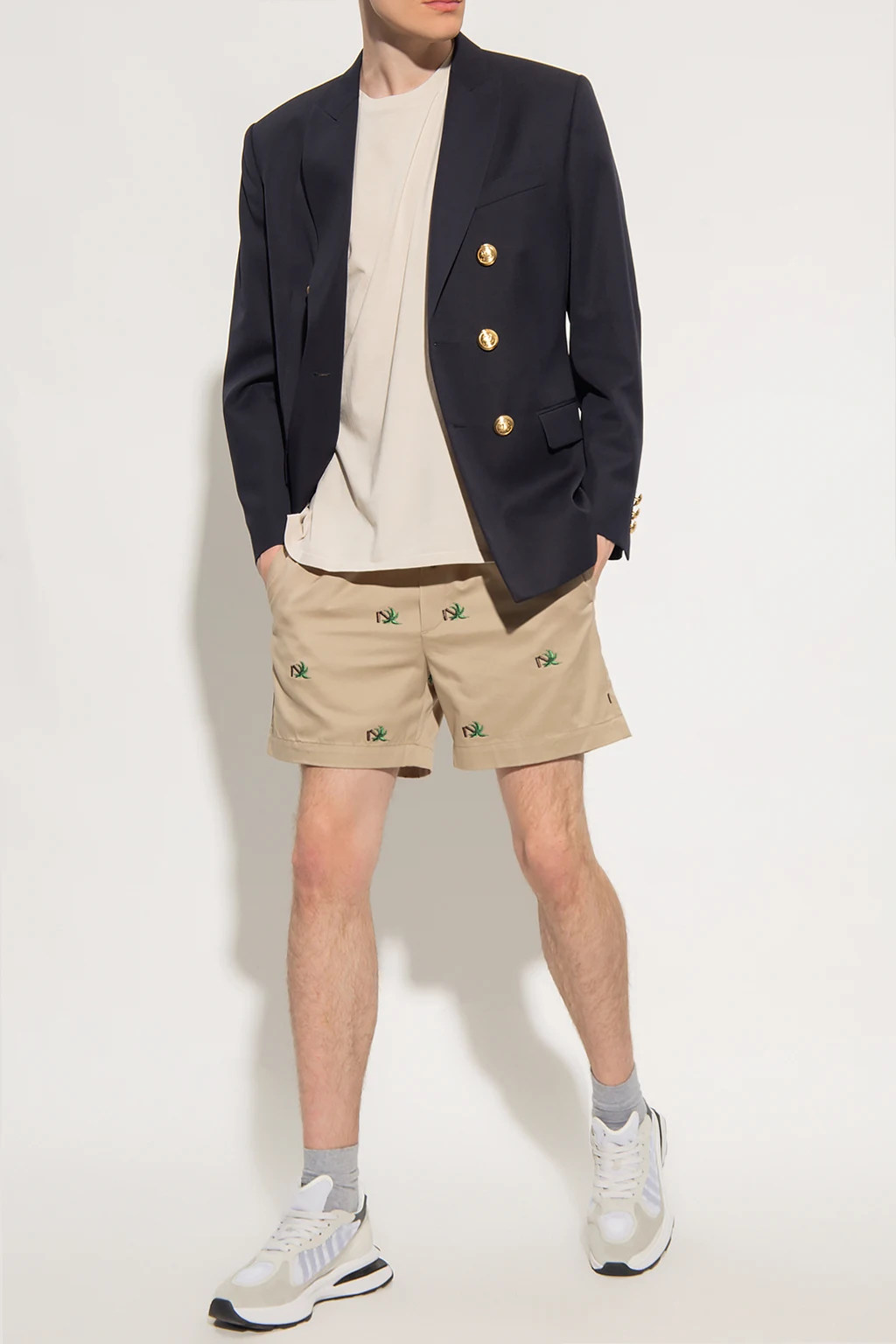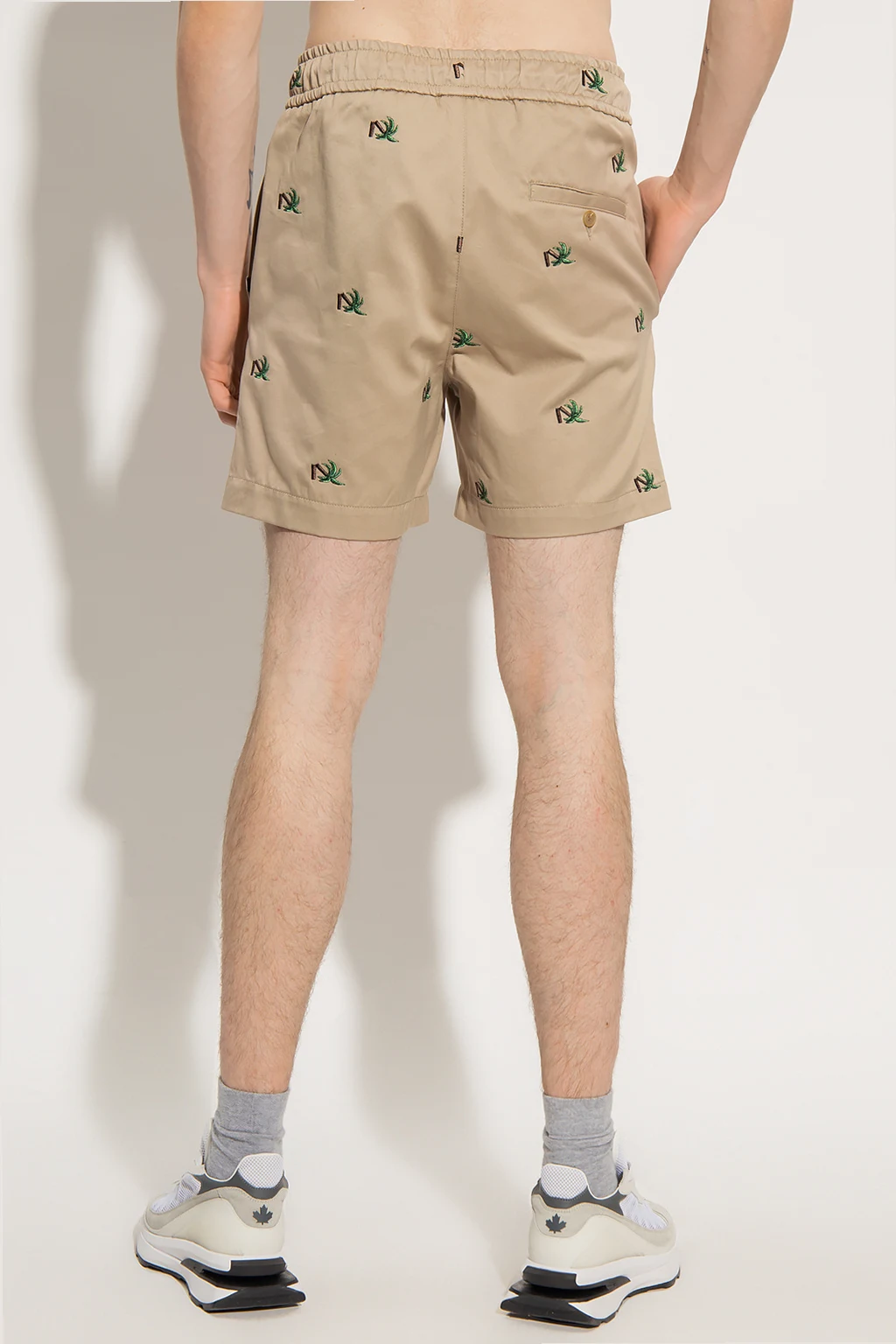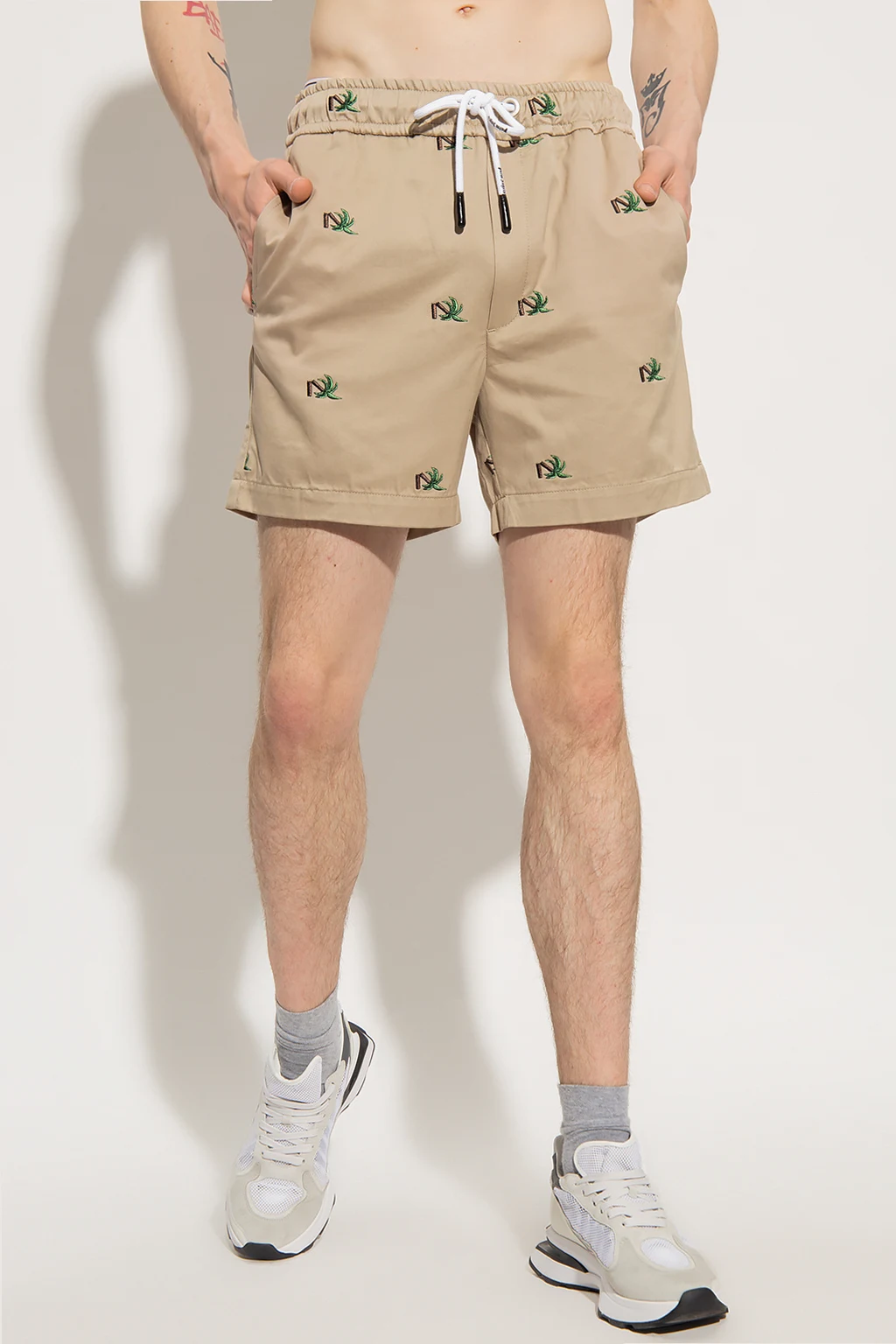 Beige shorts from Palm Angels. Made of cotton, this pair showcases floral embroidery, a drawstring waistband, two slip pockets and one button pocket.