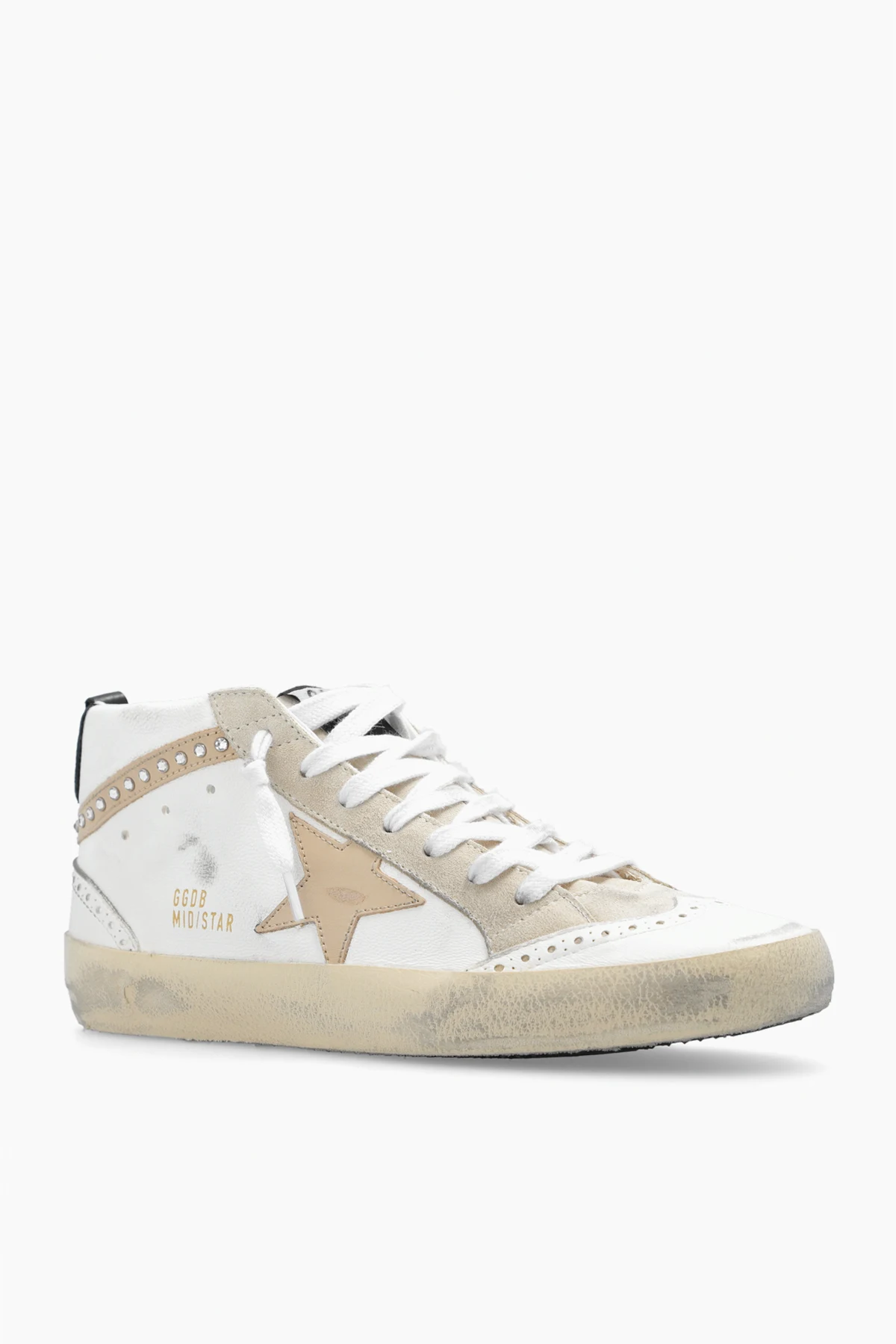 White and beige ‘Mid Star Classic’ high-top sneakers from Golden Goose. Made from leather, this lace-up model sits on a beige rubber sole and showcases an embossed logo, time-worn effects, distressed details and the brand's signature star.