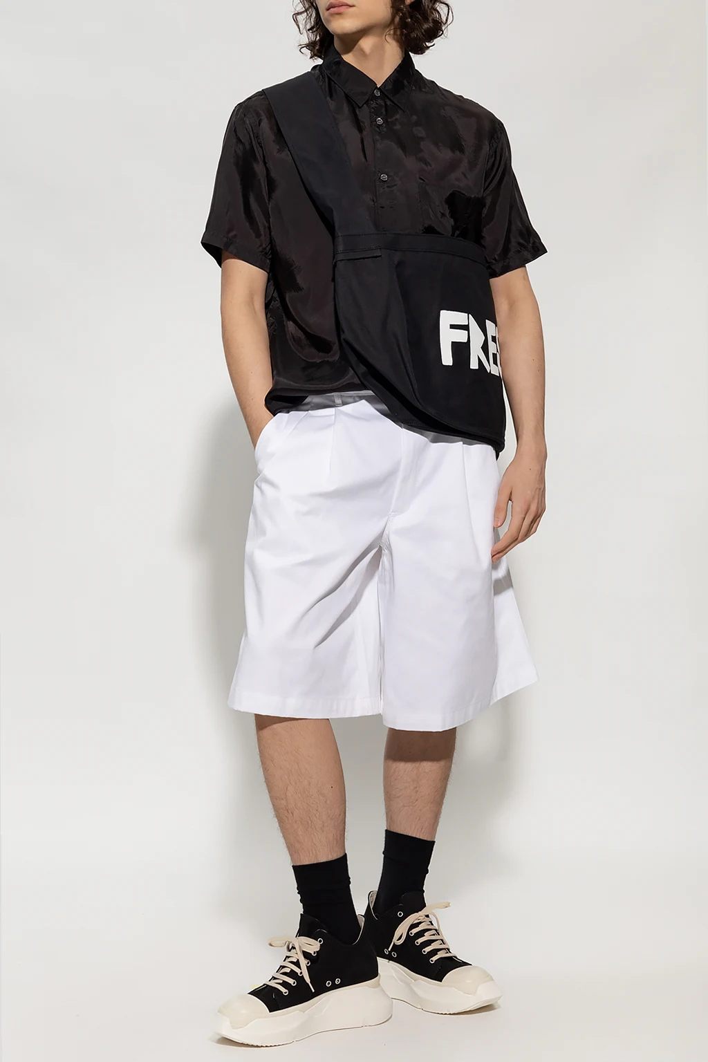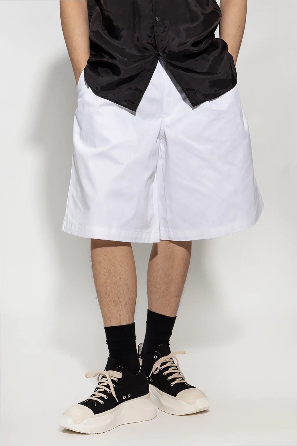 White shorts from Comme des Garcons Shirt. Made of cotton, this pair features a zip fly with a button, press pleats and four pockets – one has a buttoned flap.