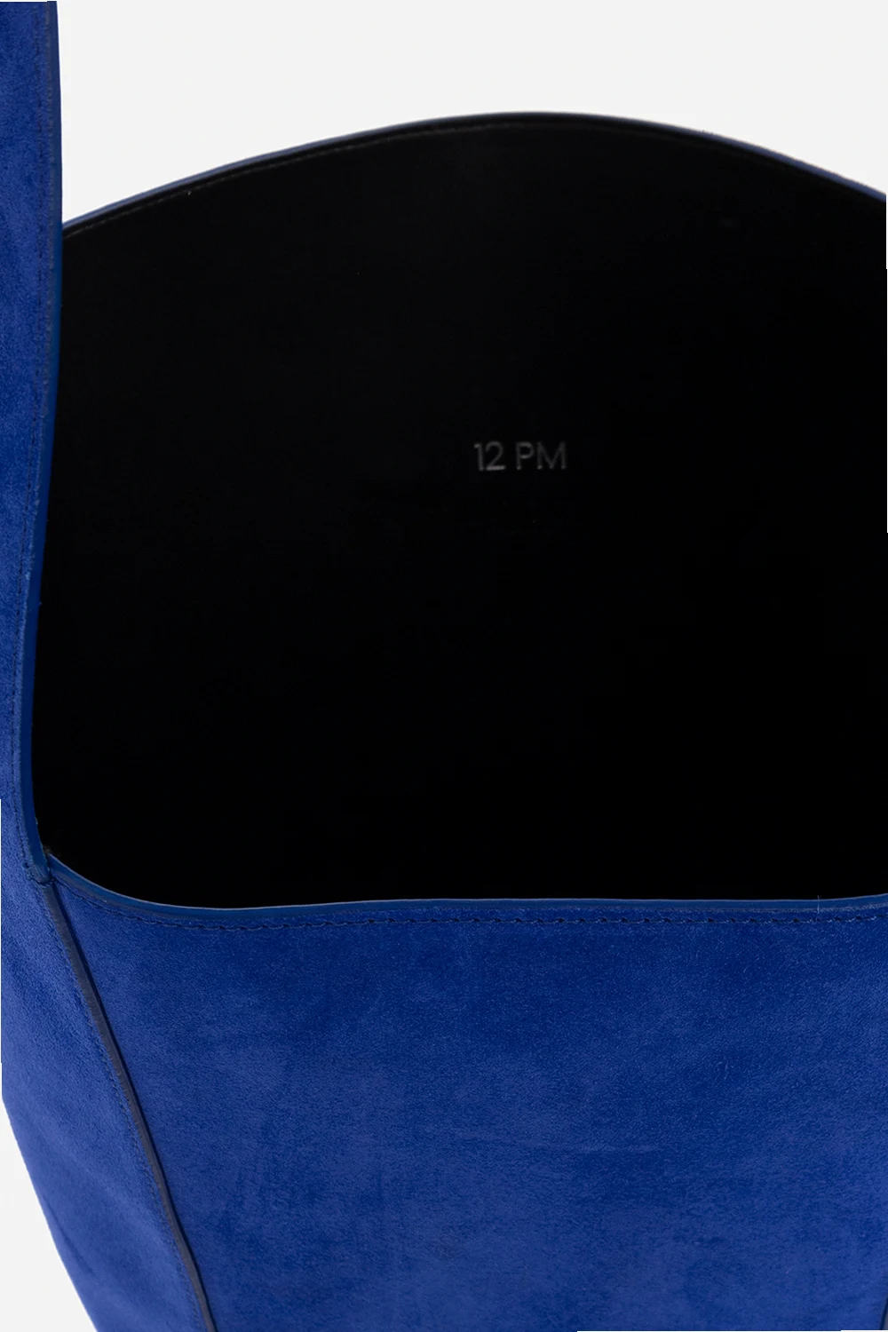 Dark blue ‘12PM’ shopper bag from The Attico. Crafted from calf suede, this design showcases the brand's logo on the front, an adjustable shoulder strap, silver-tone metal hardware and one internal compartment with a removable strapped pouch with a snap closure.