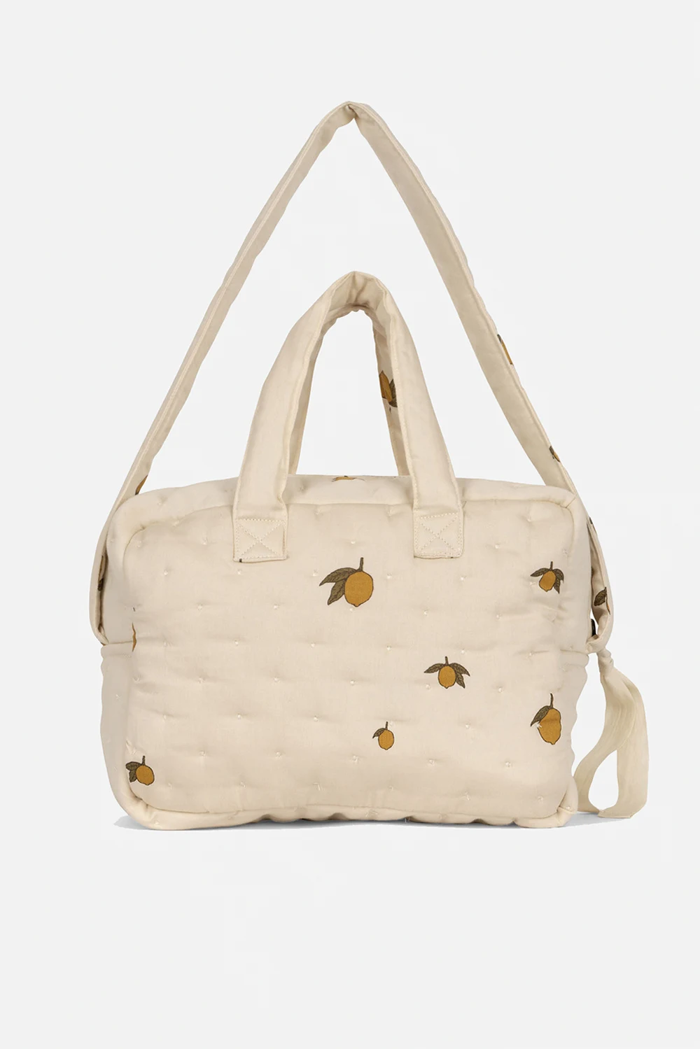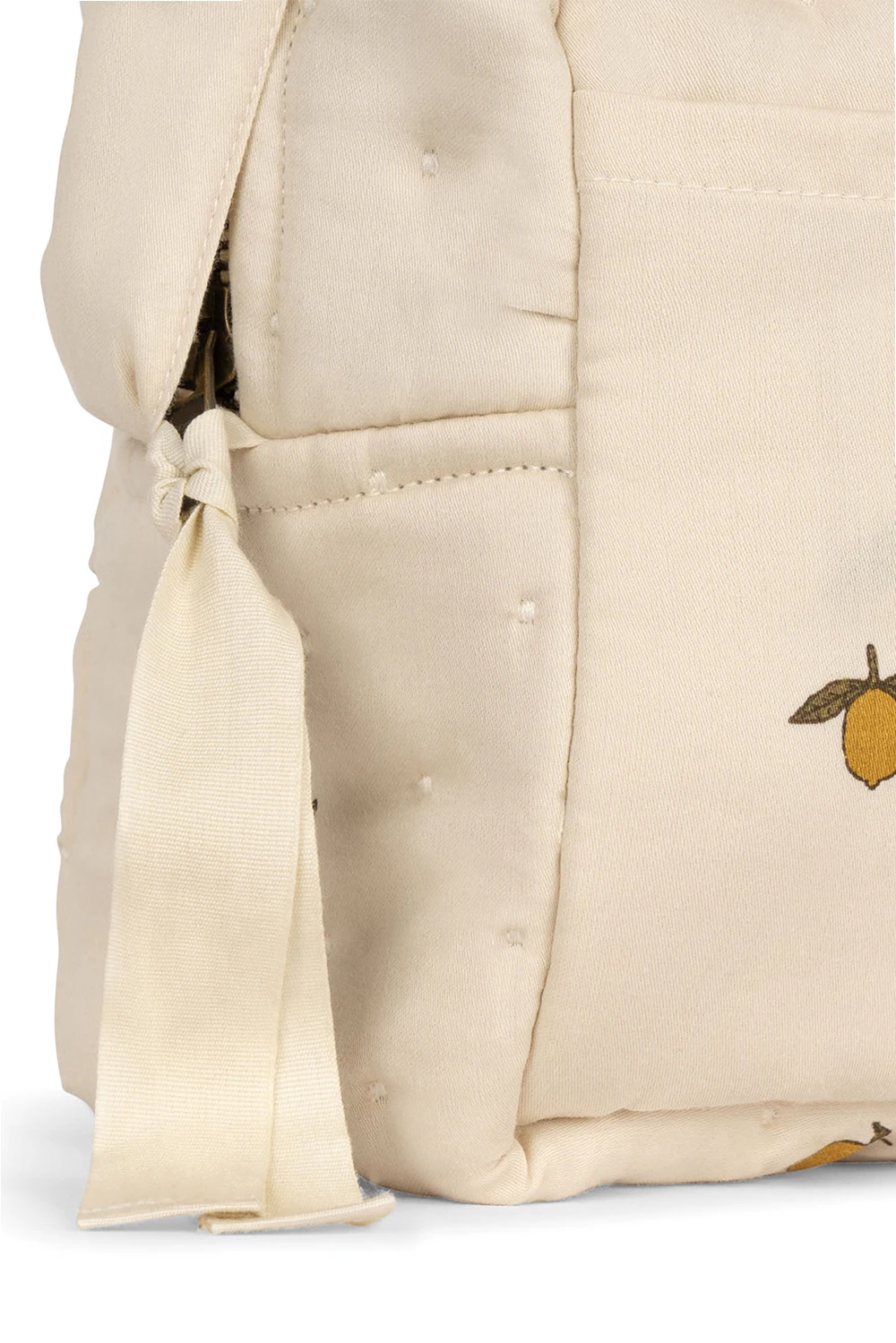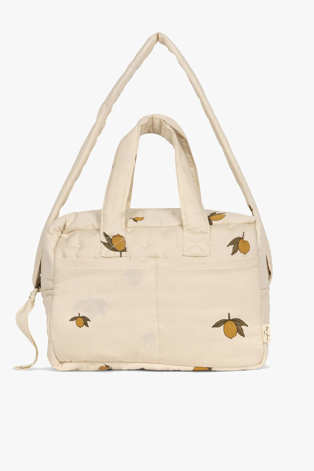 Cream shoulder bag for children from Konges Slojd. Made from organic cotton, this model is complete with a zip fastening, lemon pattern, two front pockets, two half-round handles, shoulder strap, one internal compartment and metal hardware in antique gold-tone.