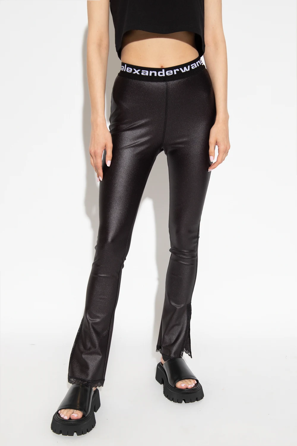 Black trousers from Alexander Wang. Crafted with glistening fabric, this pair falls with flared legs and features an elasticated waistband with white logo embroidery and split hems with lace accents.