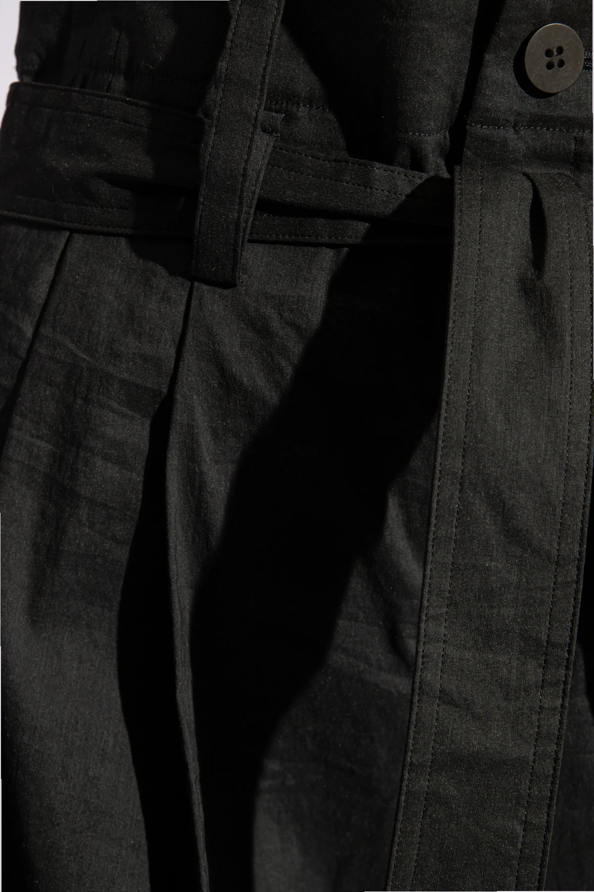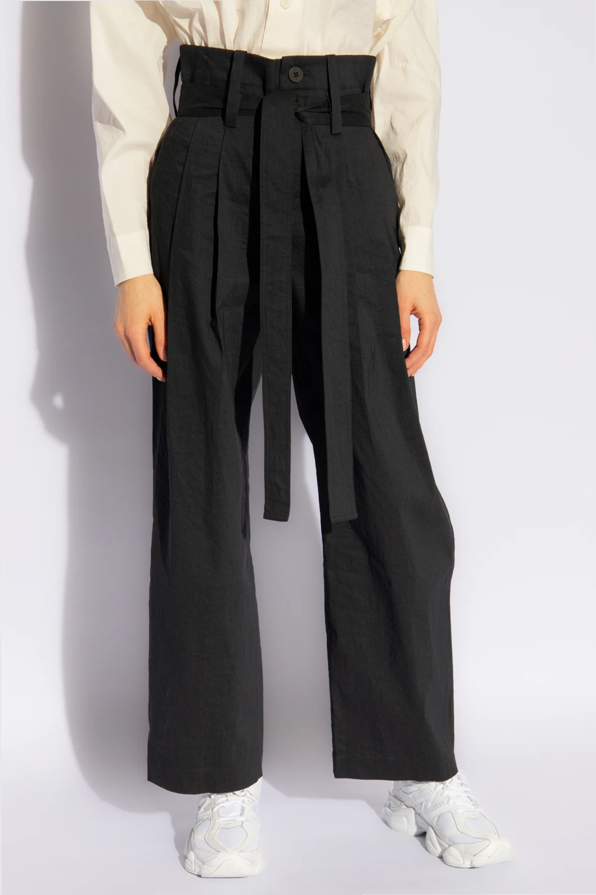 Black high-waisted trousers from Issey Miyake. Made from a paper and linen blend with a crinkle effect, this design features a zip and button fastening, removable belt, four slip pockets and straight, wide legs.