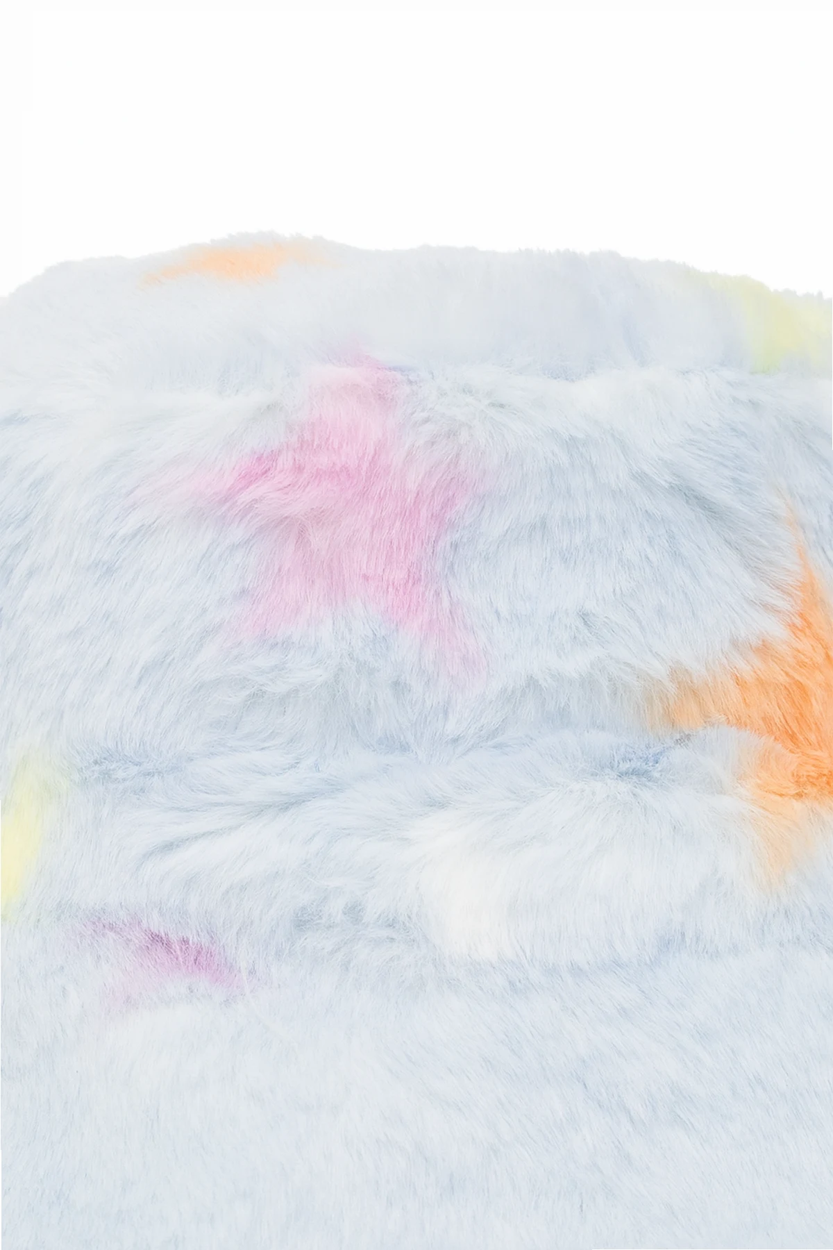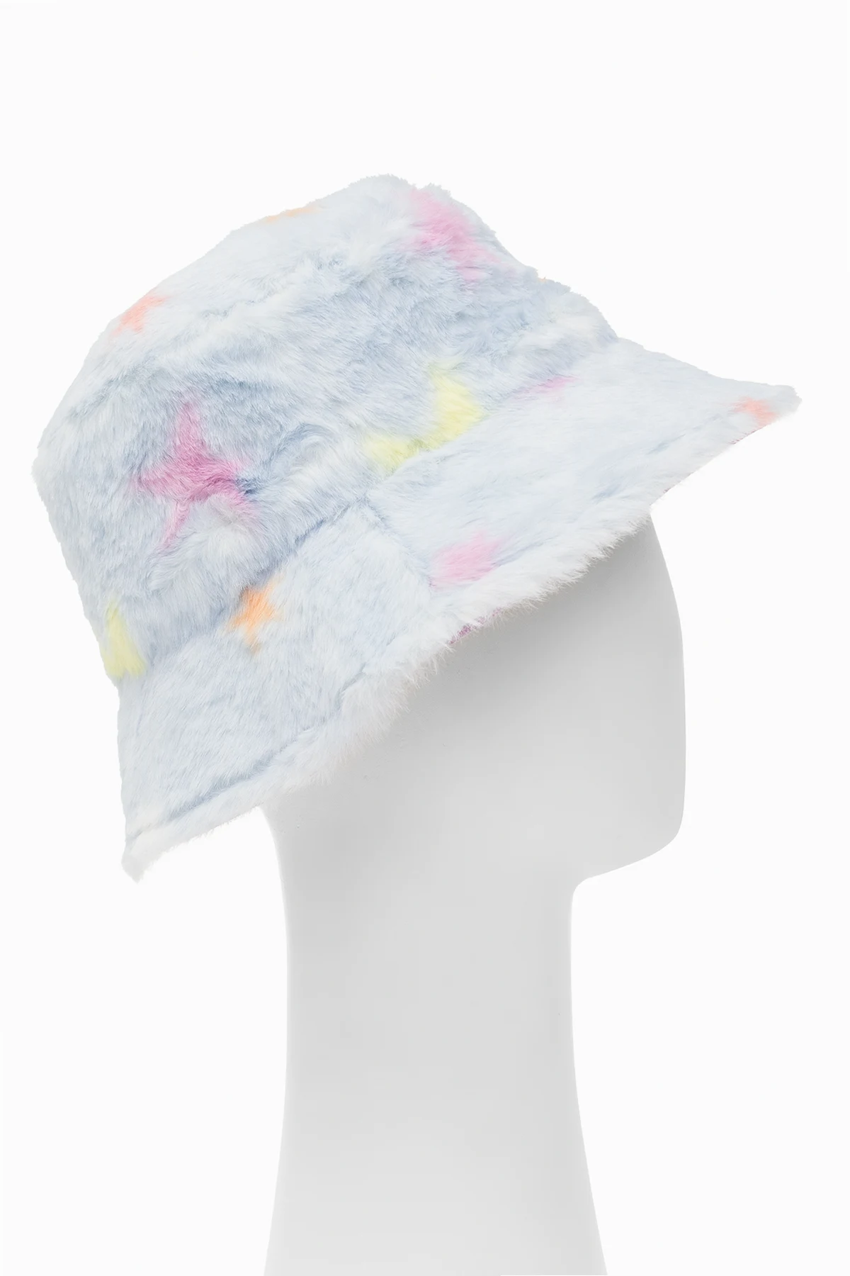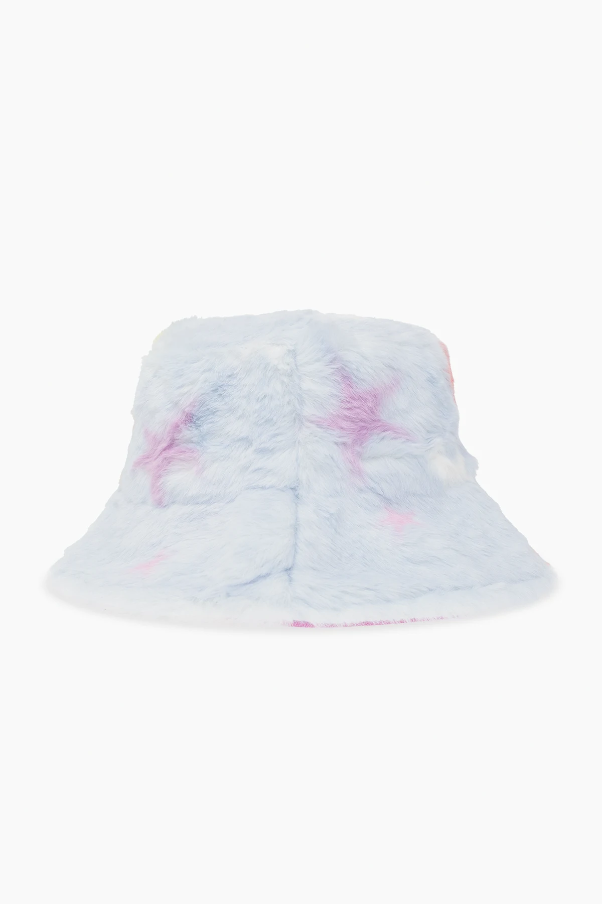 Light blue bucket hat from Stella McCartney Kids. Made of faux fur, this design is decorated with a multicolored star pattern.