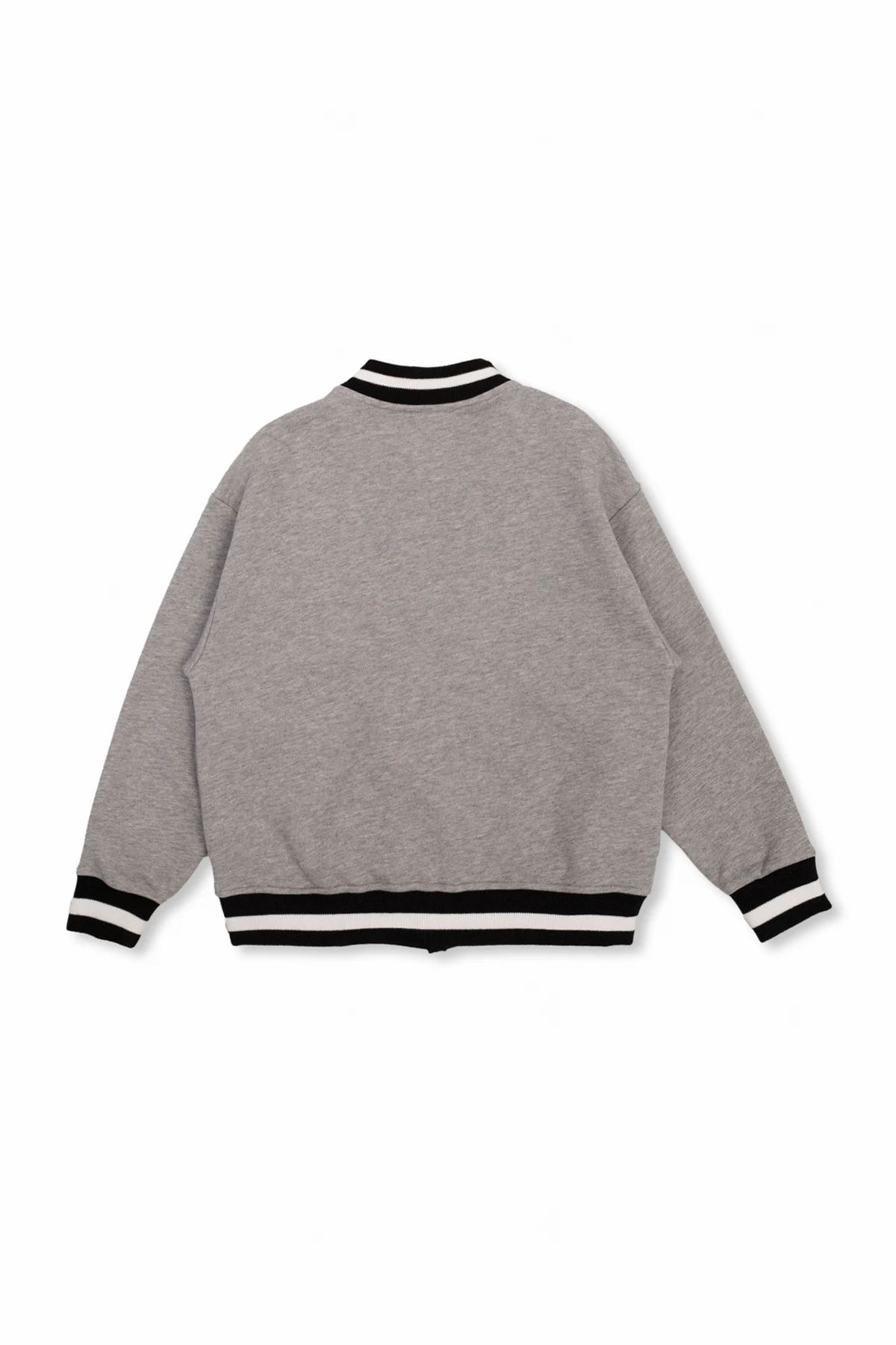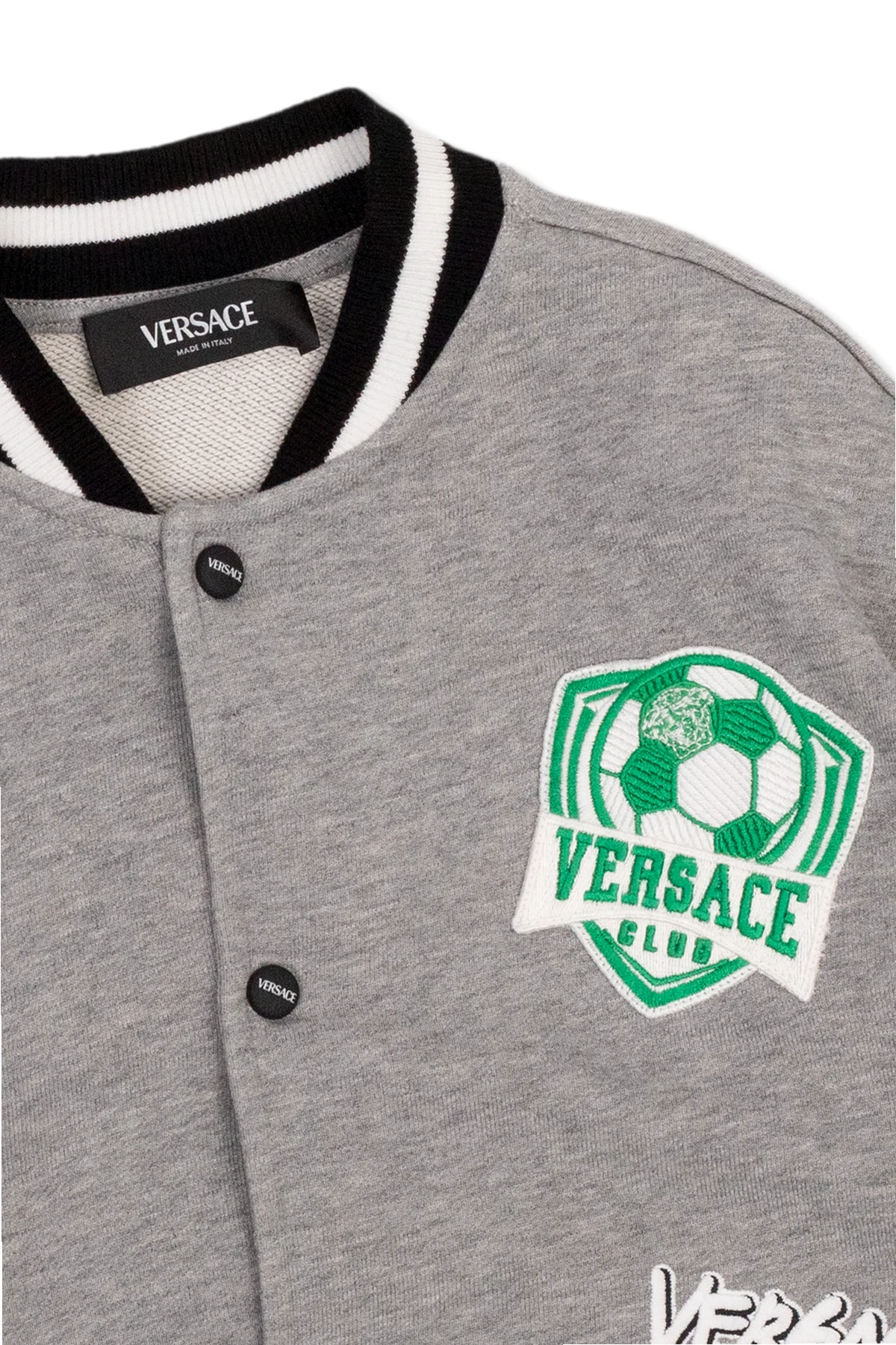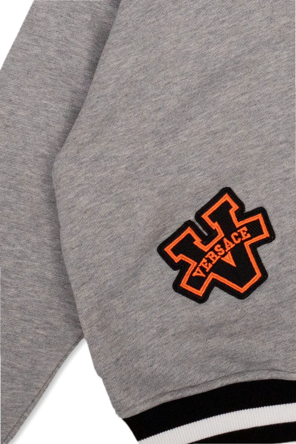 Grey sweatshirt from Versace Kids. Made of cotton. Fastened with snap buttons, this design features multicolored logo patches, two slip pockets and ribbed trims with black and white stripes at the collar, hem and cuffs.