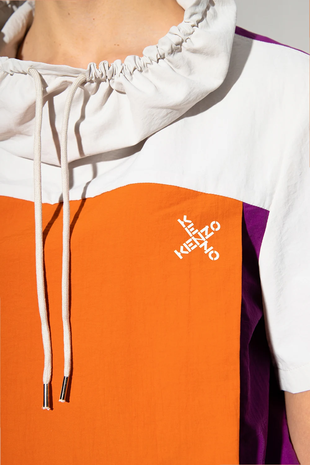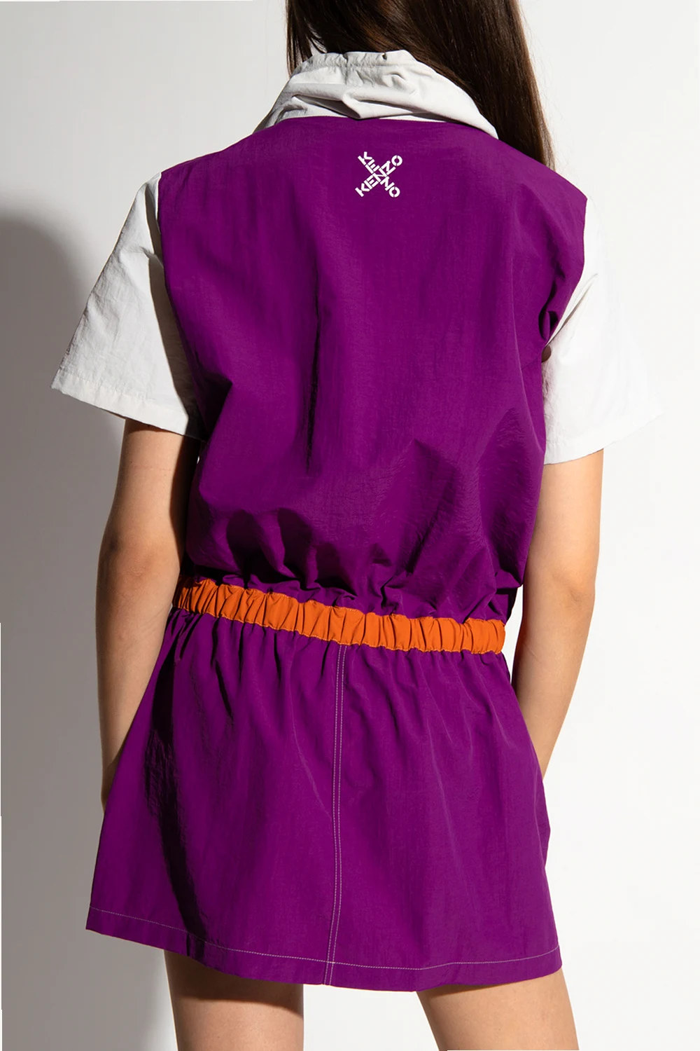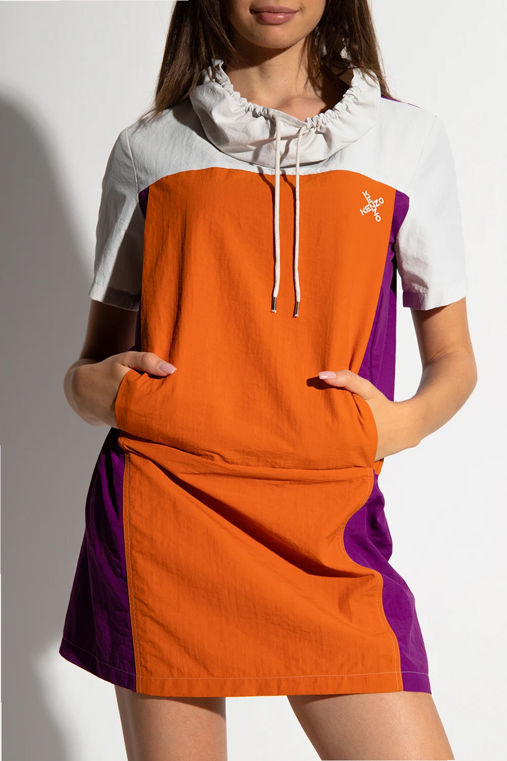 Orange, purple and cream nylon dress from Kenzo. Printed with the brand's logo in white, this style features a decorative collar with a cinching drawcord, two slip pockets, an elasticated waistband and short sleeves.