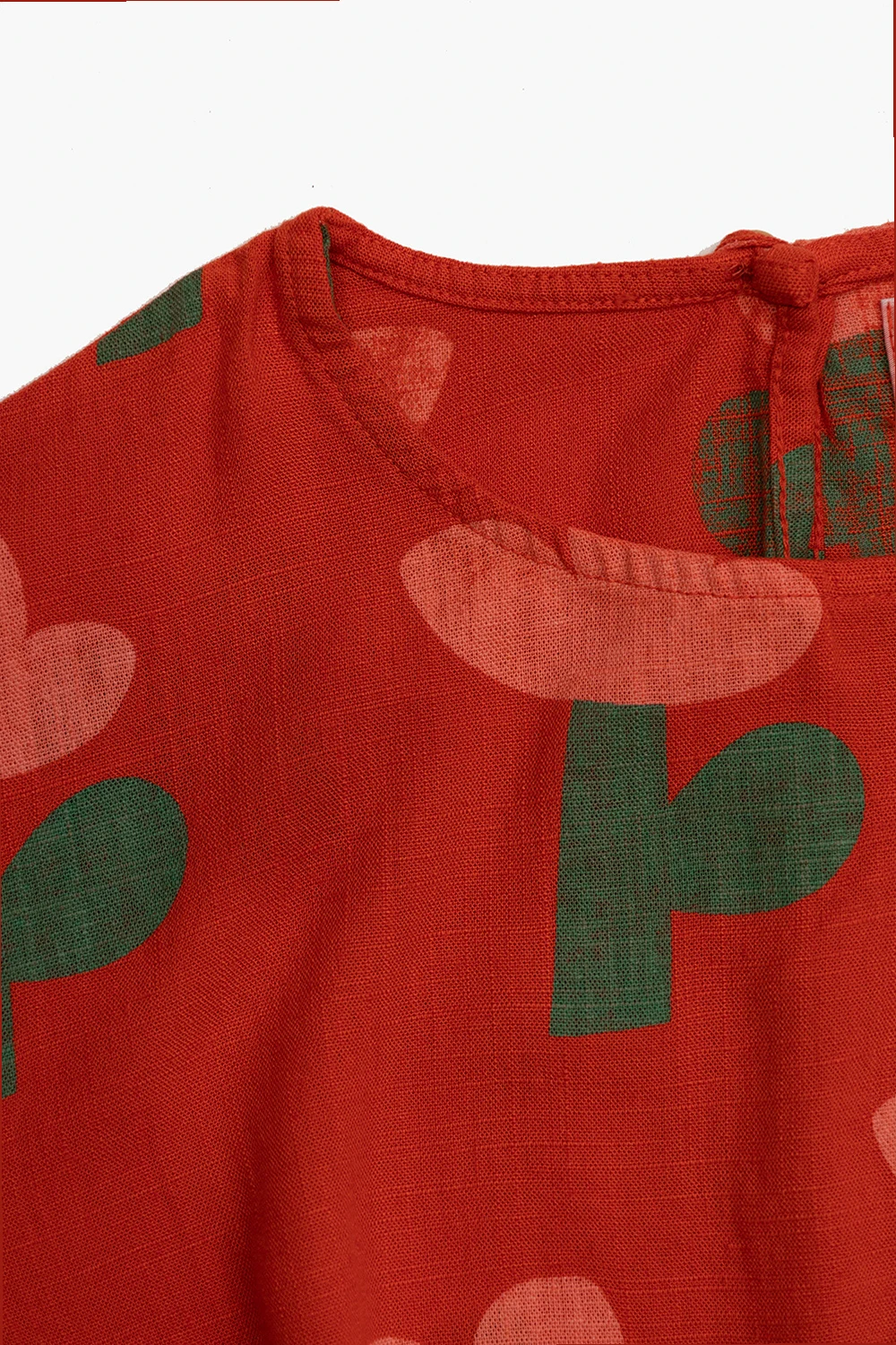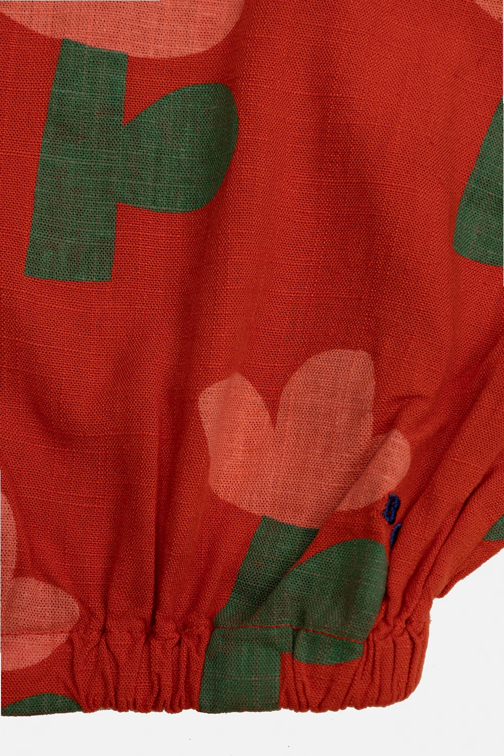 Red top from Bobo Choses. Embellished with a colourful floral print, this style features a relaxed fit, a round neck, a back button closure, an elasticated waistband and short sleeves with turned-up cuffs.