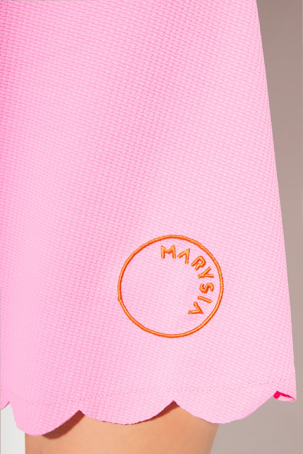 Pink ‘Venus’ slip dress with shorts from Marysia, the ‘SPORTCLEAN’ collection. Made of elastic, textured fabric, this style features a V-neckline, orange logo embroidery on the front and the brand's signature raw edge, hand cut scallops.