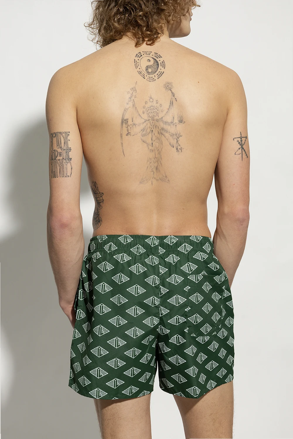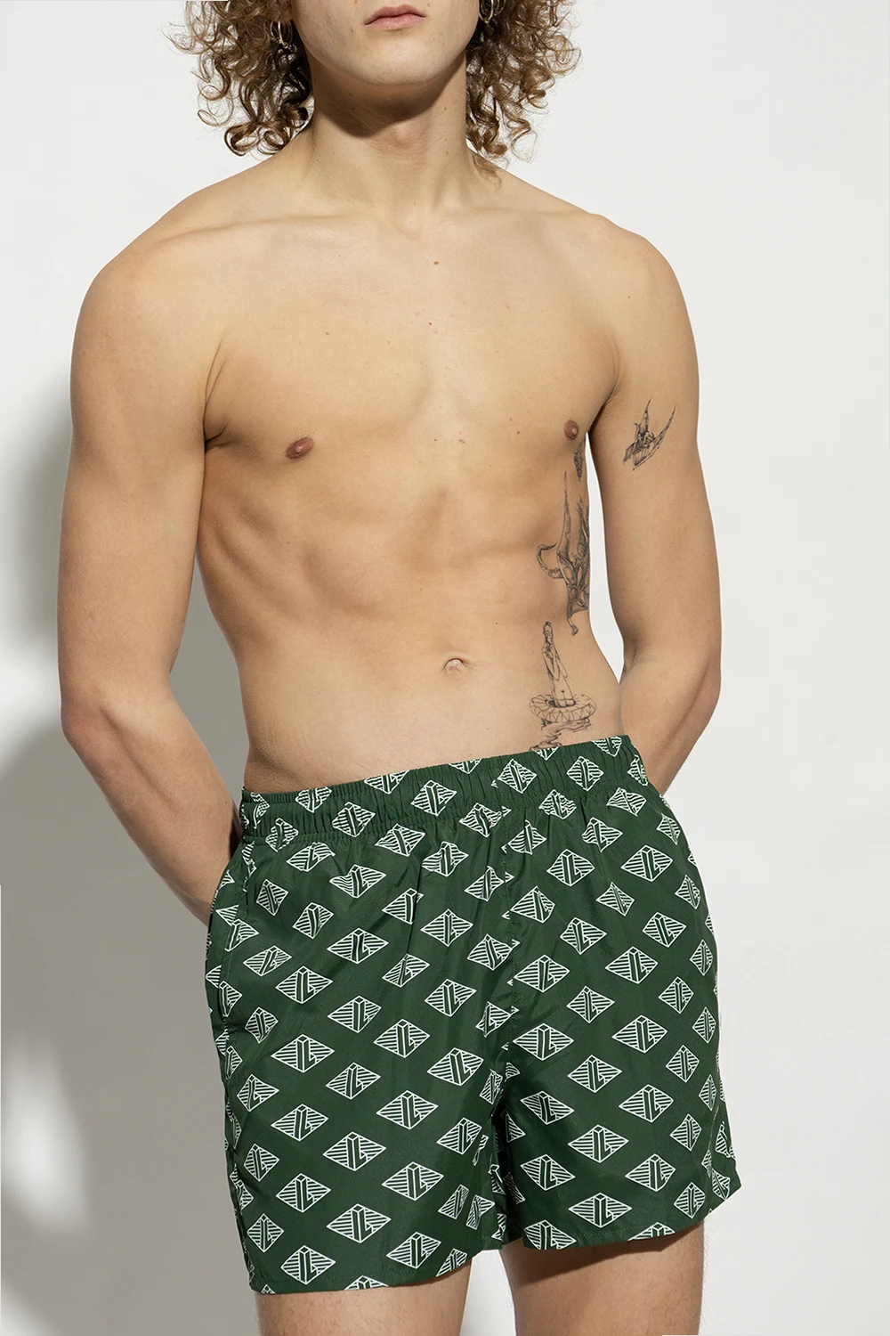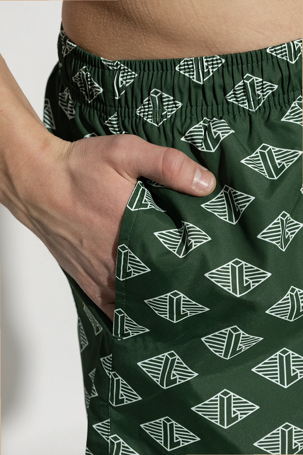 Green swimming shorts from Lacoste. Emblazoned with a graphic pattern, this pair features a logo patch for brand recognition, a drawstring waistband three slip pockets.