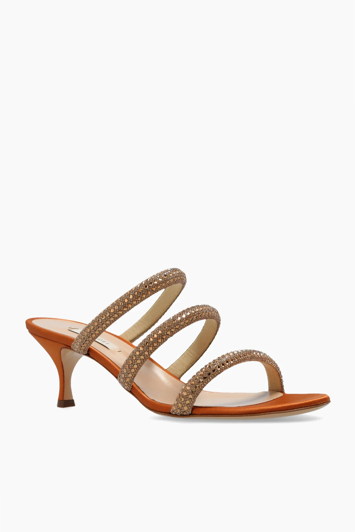 Brown ‘Scarlet Stratosphere’ mules from Casadei. Made from silk satin, this model sits on a beige leather sole and features an almond-shaped toe and sparkling appliqués.