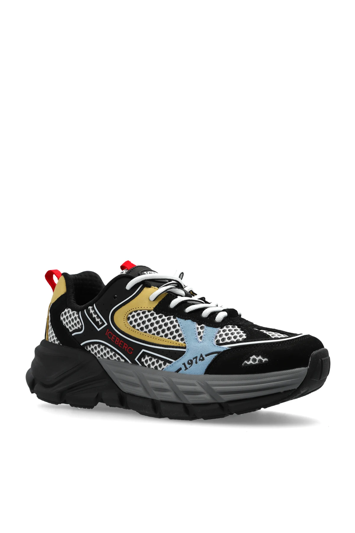 Wir präsentieren exklusive Sportschuhe der Marke Iceberg , die mit ihrem modernen Design und mehrfarbigen Elementen begeistern. Diese Low-Top-SNEAKERS zeichnen sich durch ihre klassische Form sowie ein einzigartiges Muster aus, in dem die Farben Schwarz, Gelb, Rot und Blau dominieren. An den Seiten der Schuhe befinden sich weiße geometrische Muster, die einem Netz ähneln und ihnen einen besonderen Charakter verleihen.