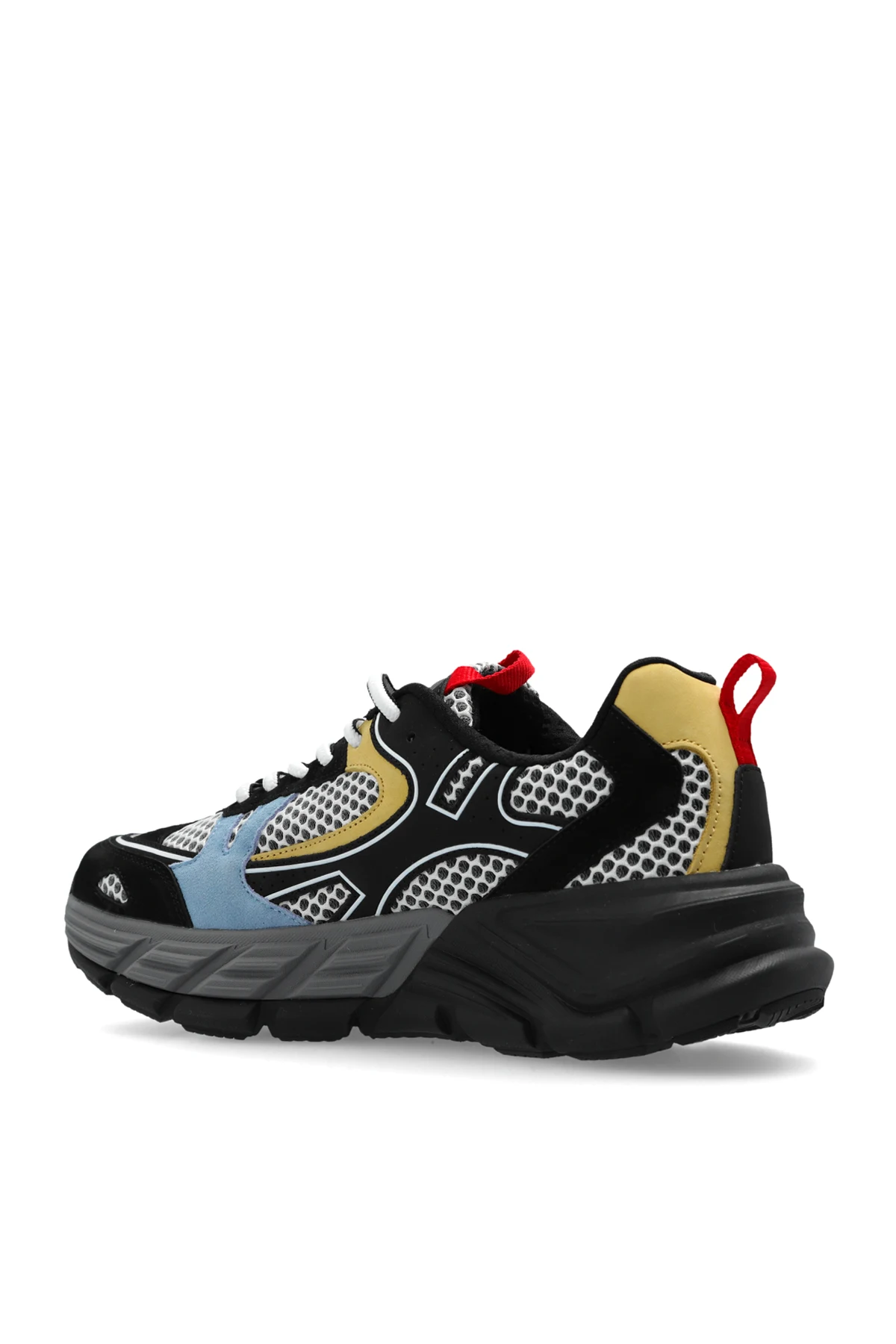 Die Schuhe verfügen über weiße Schnürsenkel und rote Fersenlaschen, die zusätzlich Aufmerksamkeit erregen. Die dominierende Farbe ist Schwarz, aber die mehrfarbigen Akzente verleihen ihnen ein modernes und dynamisches Aussehen.