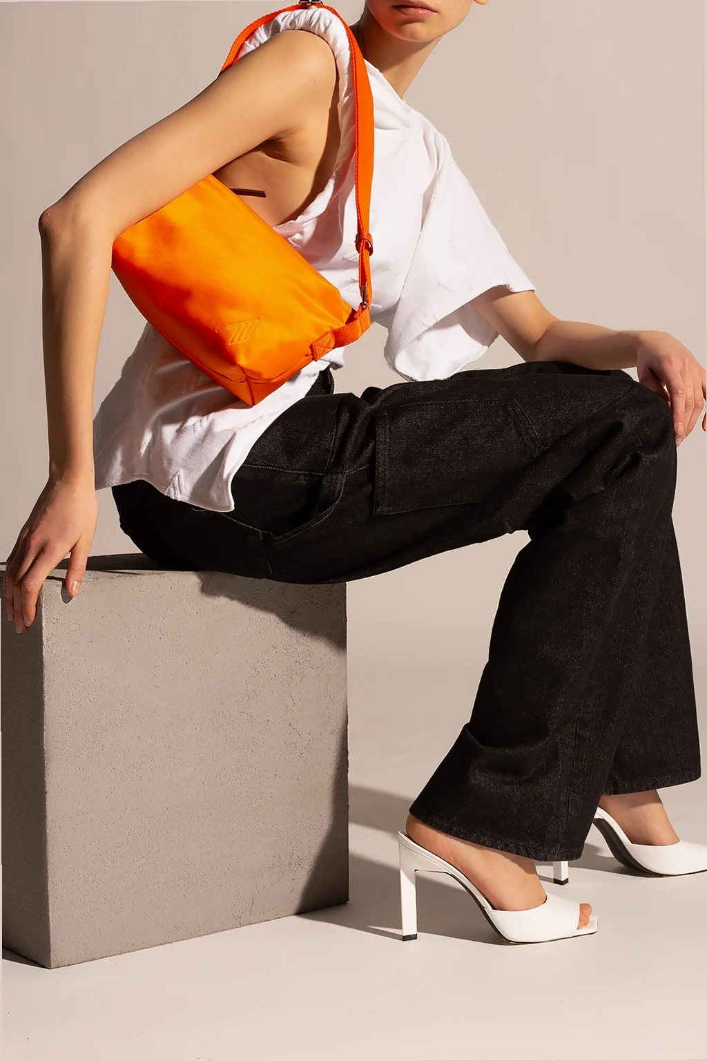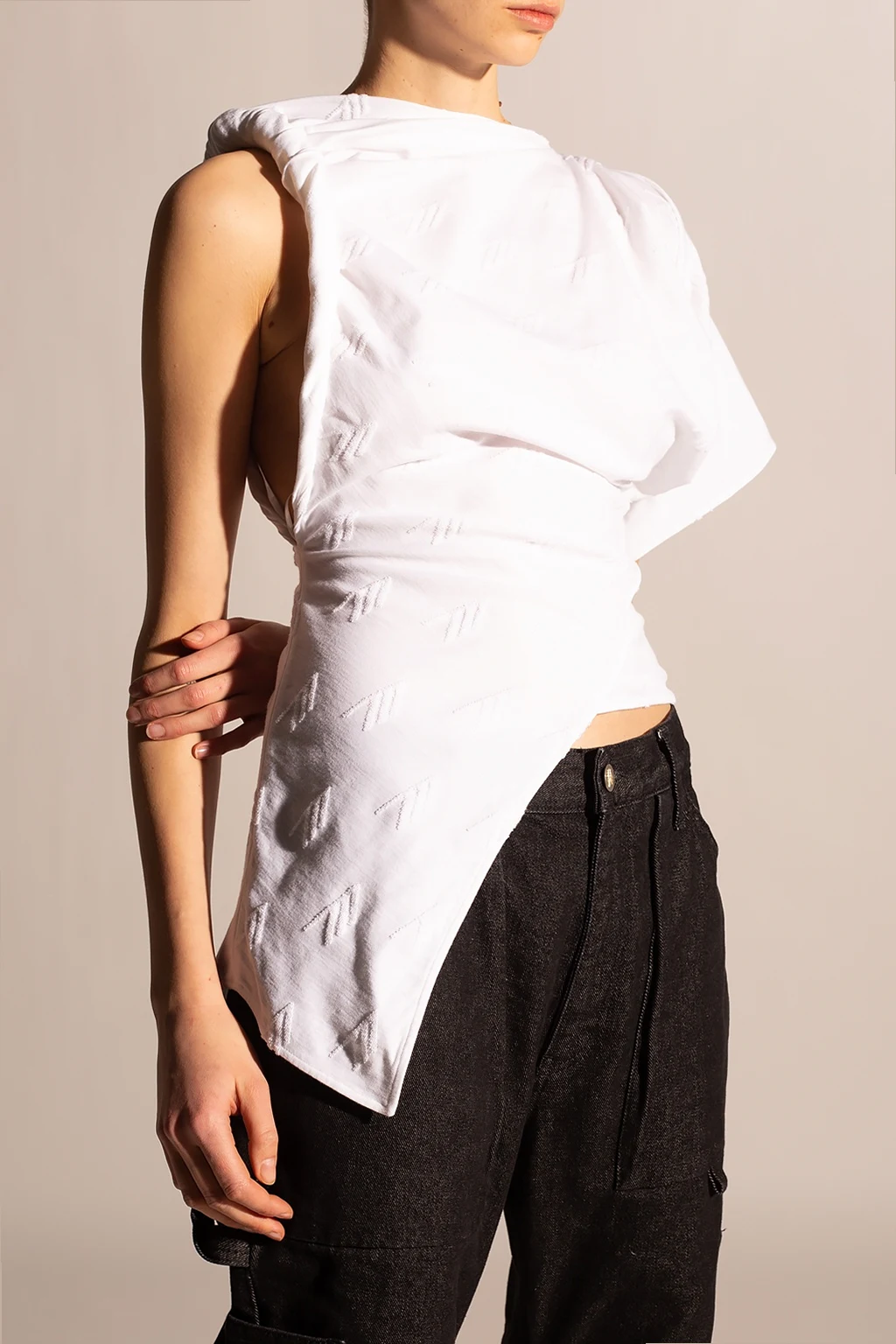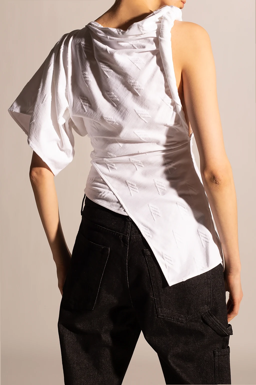 White top from The Attico. Crafted from cotton with an asymmetrical silhouette, this style features a scoop neck, an embroidered logo an one short sleeve.