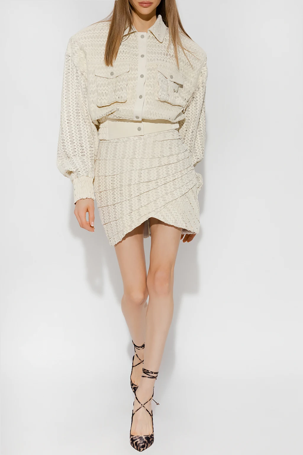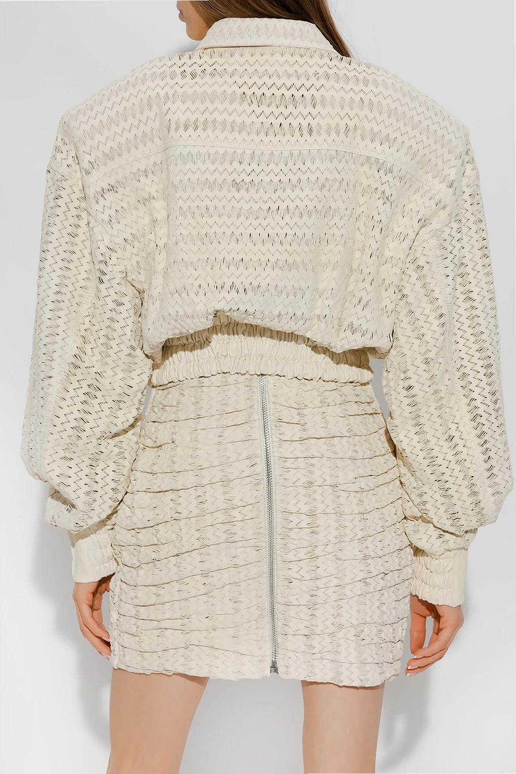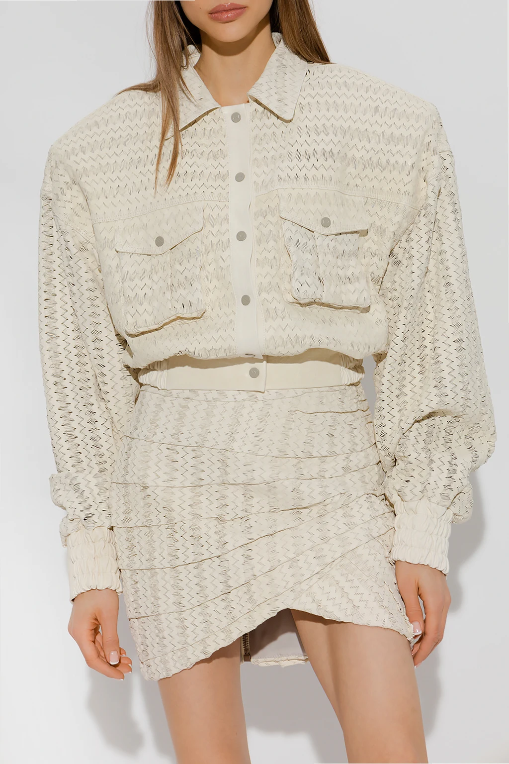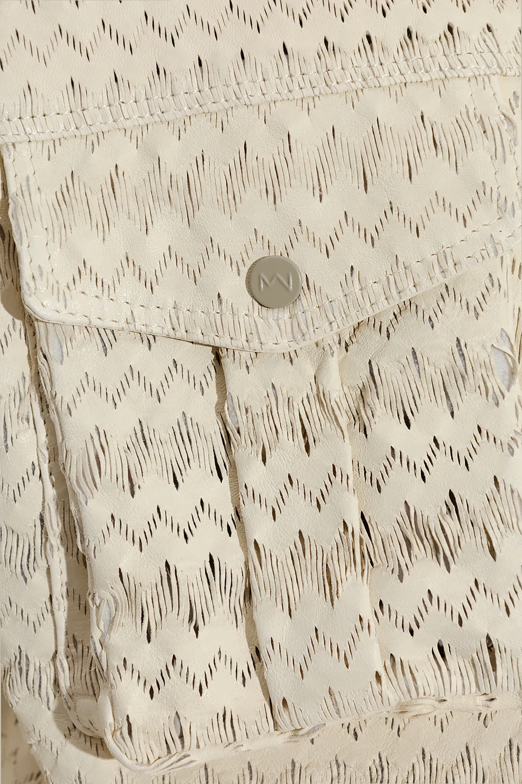 Cream ‘Nice’ jacket from The Mannei. Crafted from perforated leather, this style fastens with black snaps with a logo and features two flapped pockets with snaps and long sleeves.
