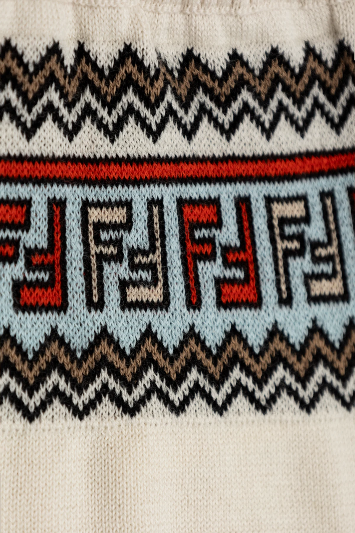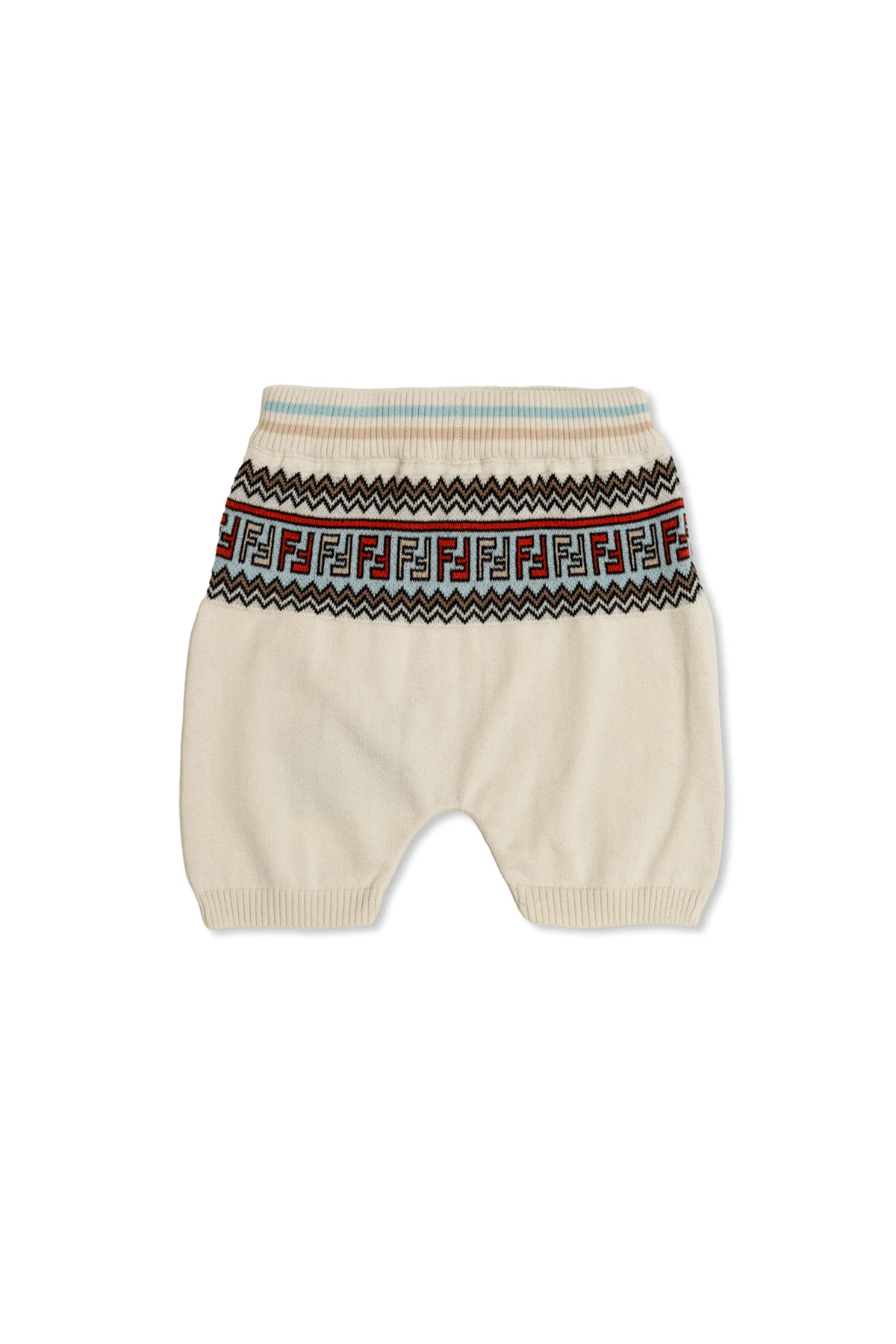 Die Shorts zeichnen sich durch einen dekorativen Bund mit geometrischem Muster aus, bei dem die Buchstaben "FF" in verschiedenen Farben – Rot und Schwarz auf hellblauem Hintergrund – harmonisch mit den Zickzacklinien in Schwarz und Braun zusammenspielen. Dieses charakteristische Motiv verleiht den Shorts einen einzigartigen Charme und unterstreicht ihren luxuriösen Charakter.