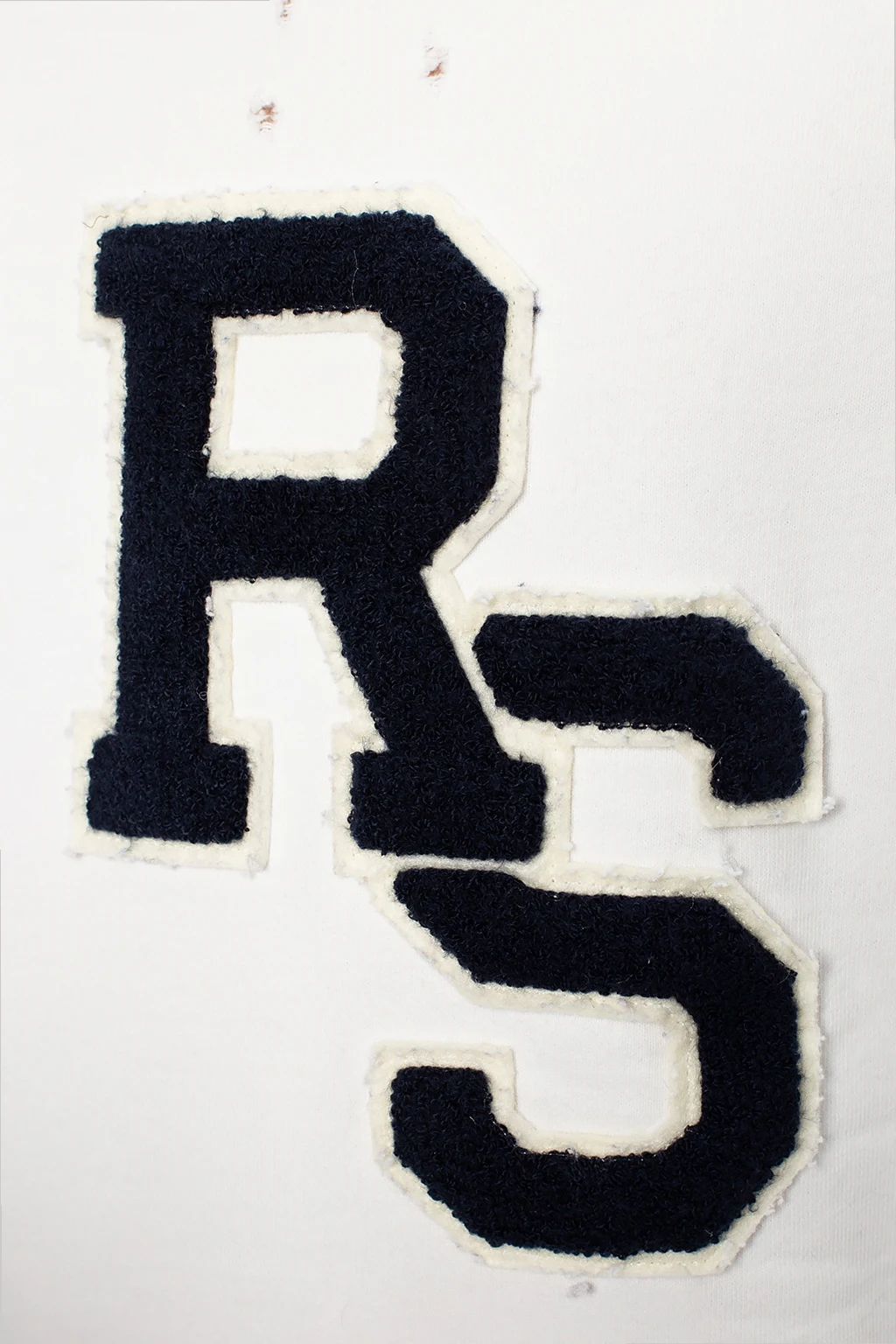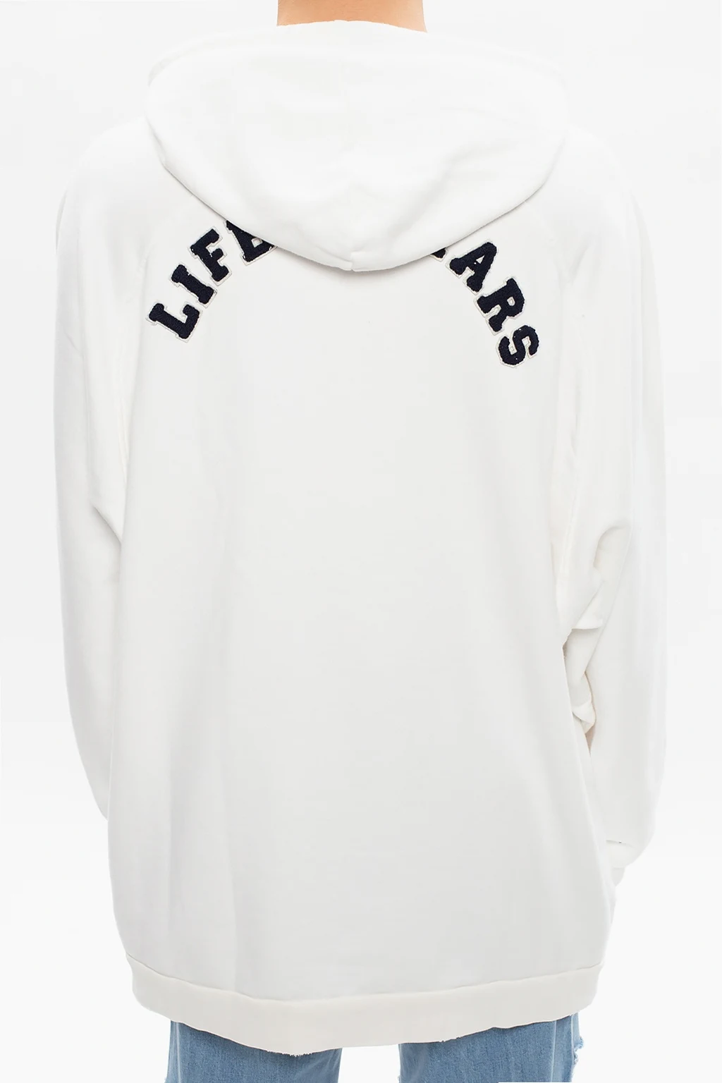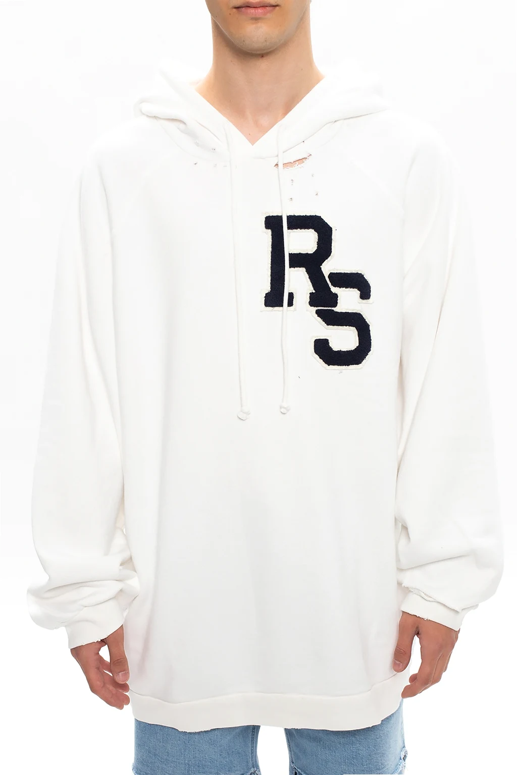 White hoodie from Raf Simons. Crafted from cotton, this design features a drawstring hood, cream and navy logo detail, raw edge and ribbed trims at the hem and cuffs.