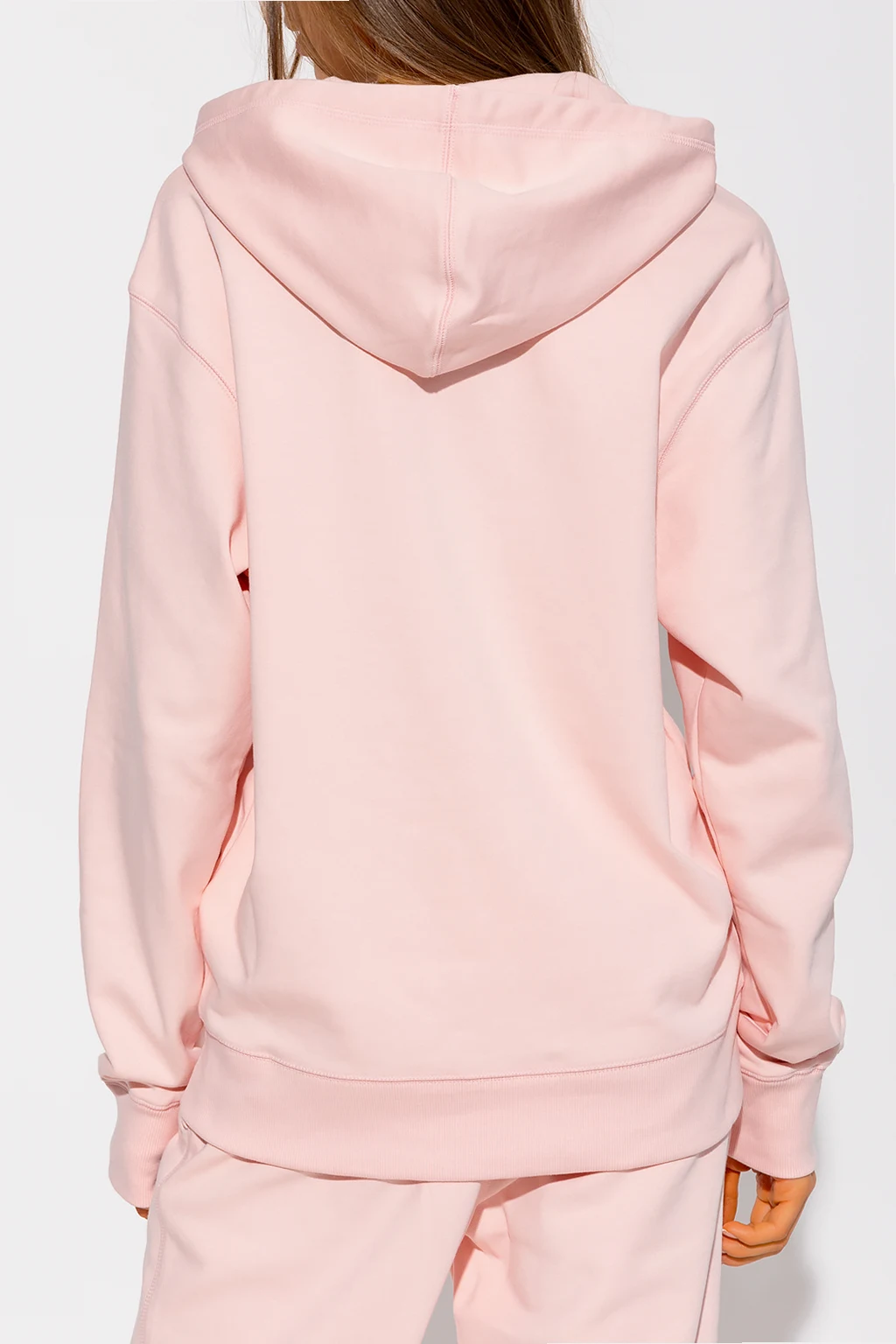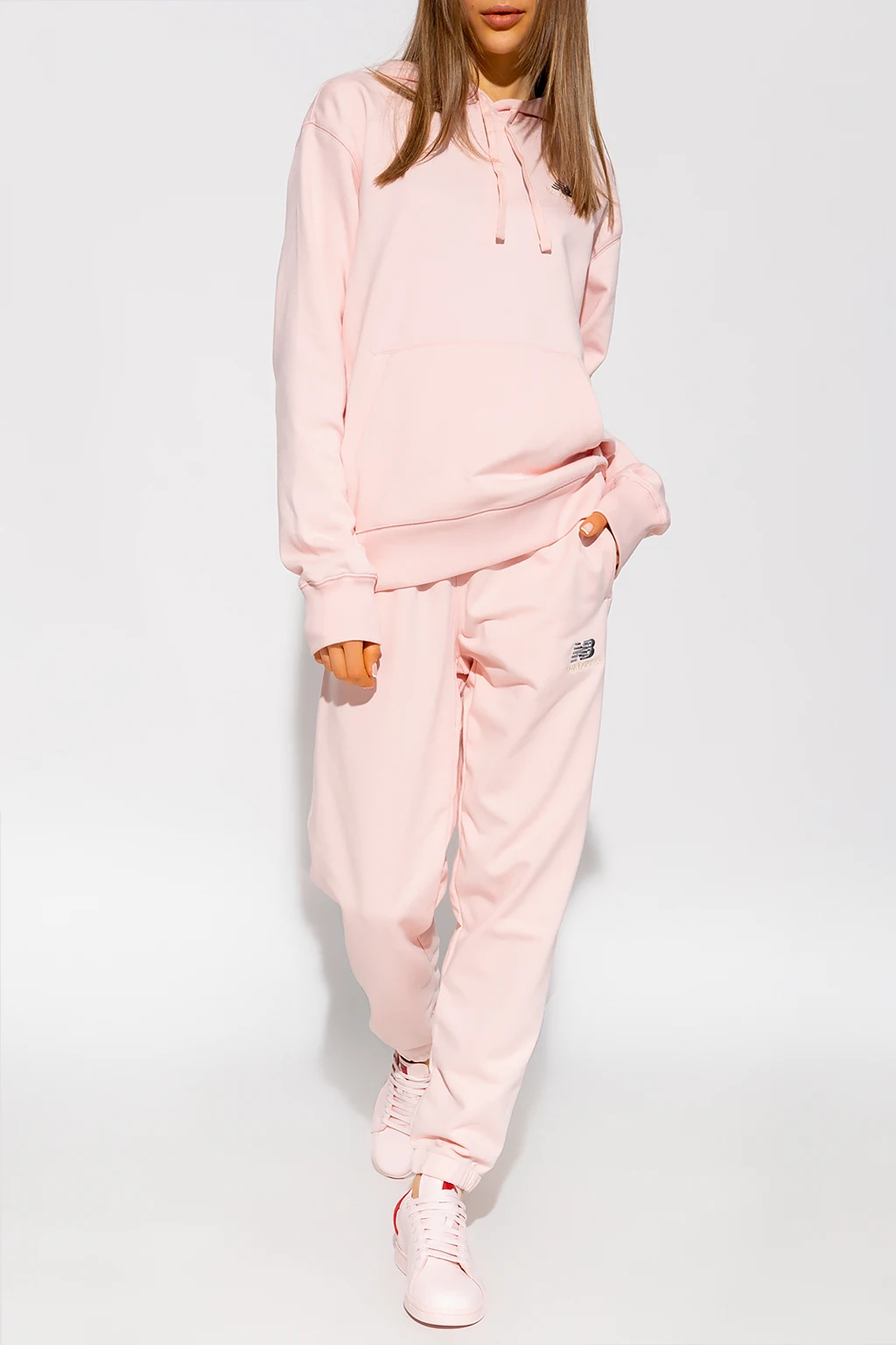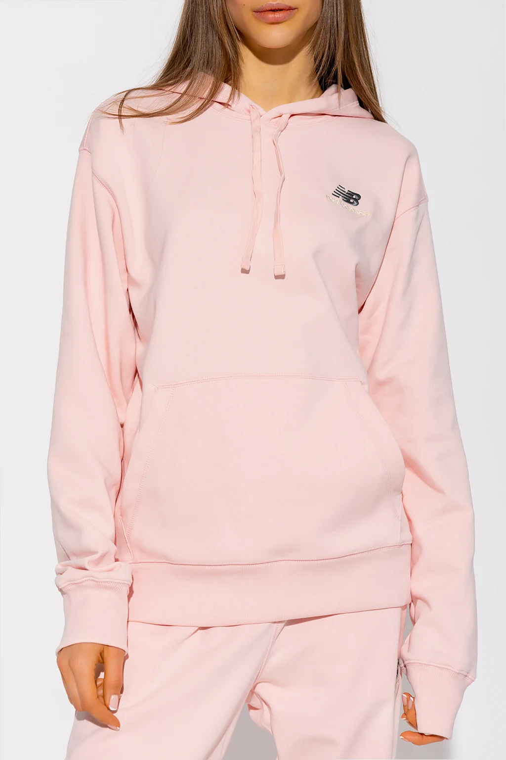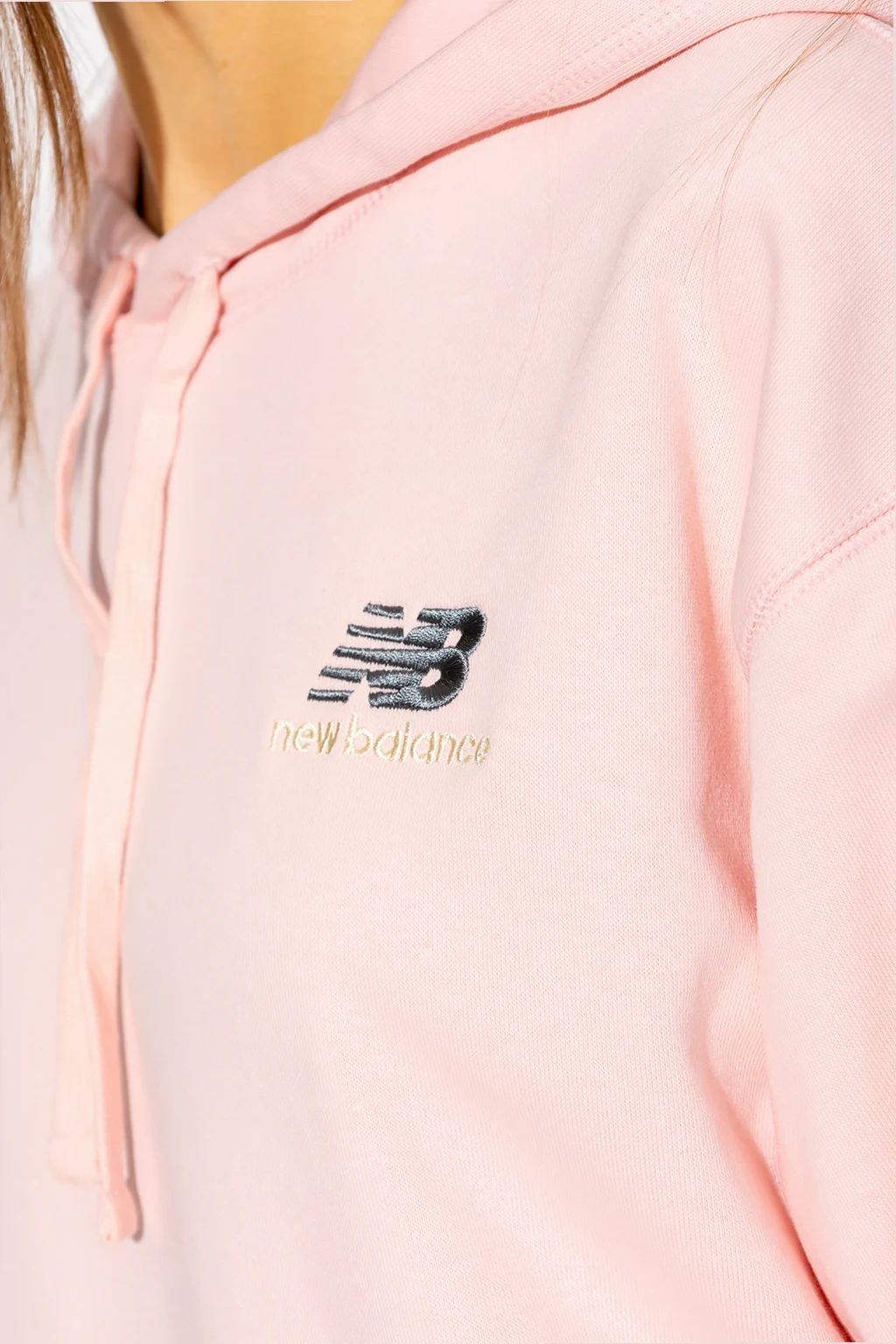 Light pink hoodie from New Balance. This garment features a drawstring hood, grey and cream logo embroidery, slip pocket and ribbed trims at the hem and cuffs.