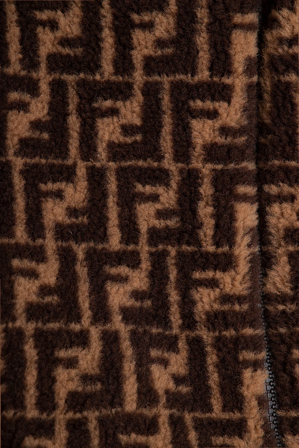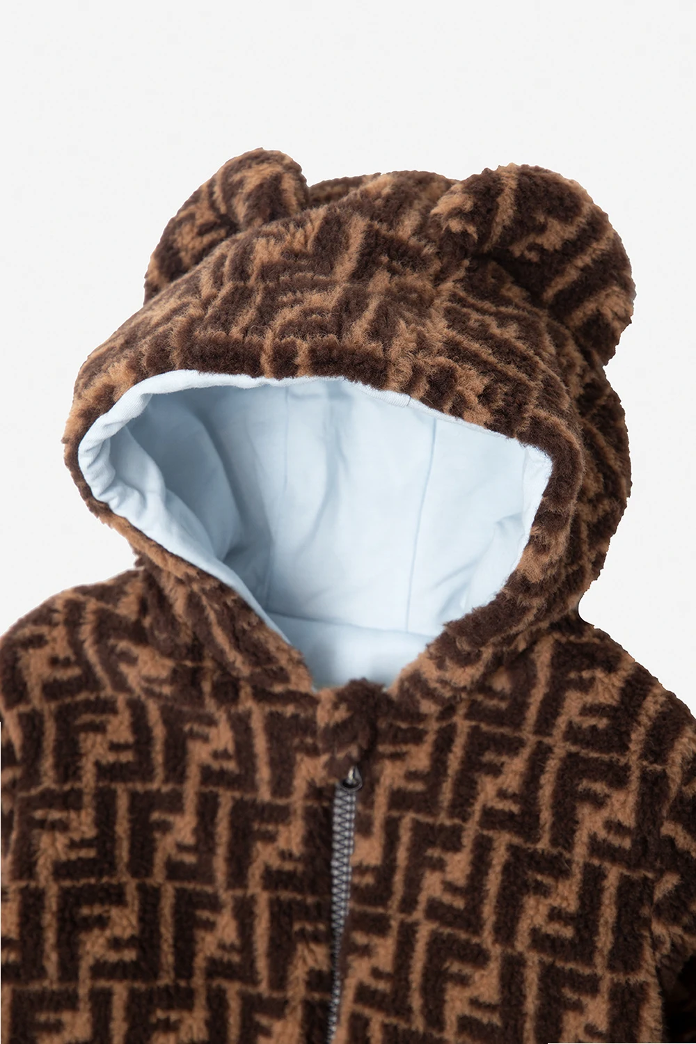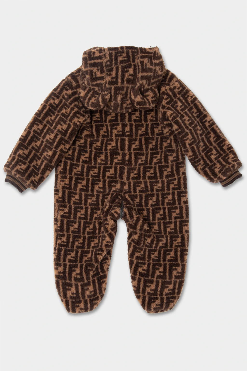 Brown fleece jumpsuit from Fendi Kids. Embellished with a monogram pattern, this style features sewn teddy bear ears on the hood, a zip fastening, long sleeves with elasticated cuffs and a light blue cotton-blend lining.