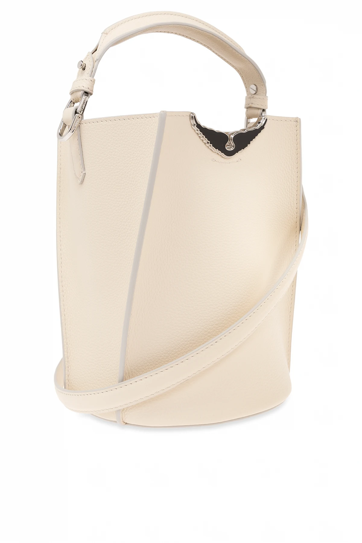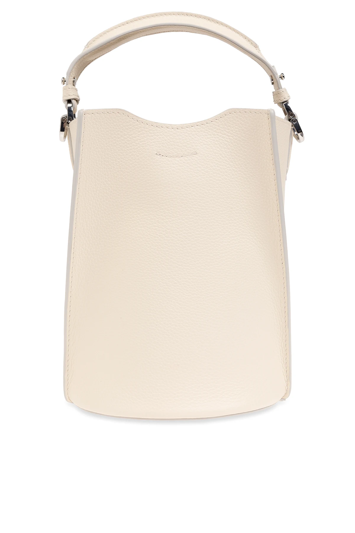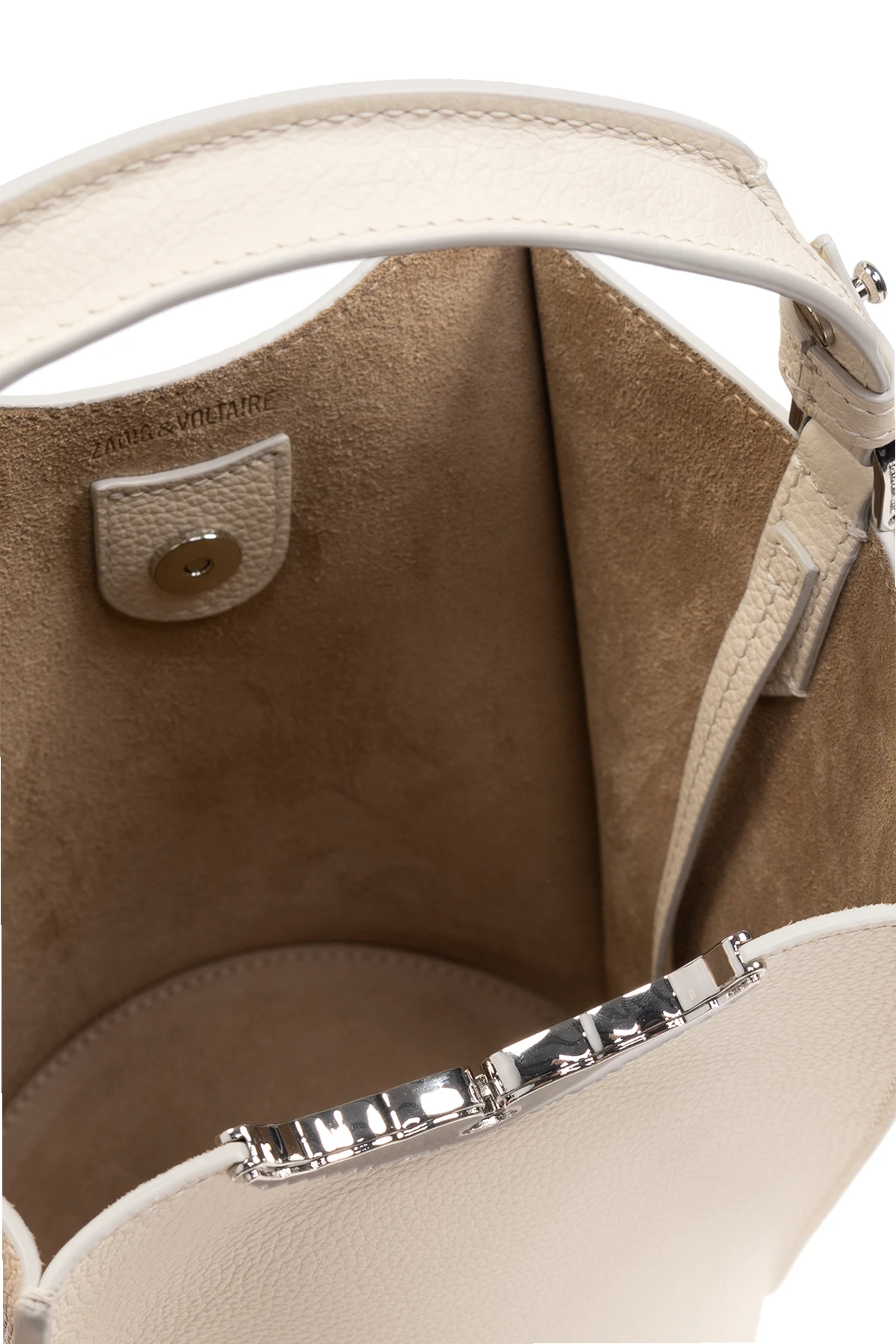 Cream ‘Borderline’ bucket shoulder bag from Zadig & Voltaire. Made from grained leather, this design fastens via a magnetic snap and showcases a silver-tone and black logo application on the front, one half-round handle, one internal compartment, gold-tone metal hardware and a detachable and adjustable shoulder strap.