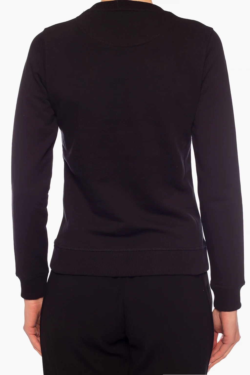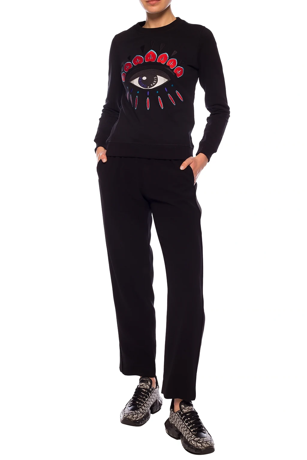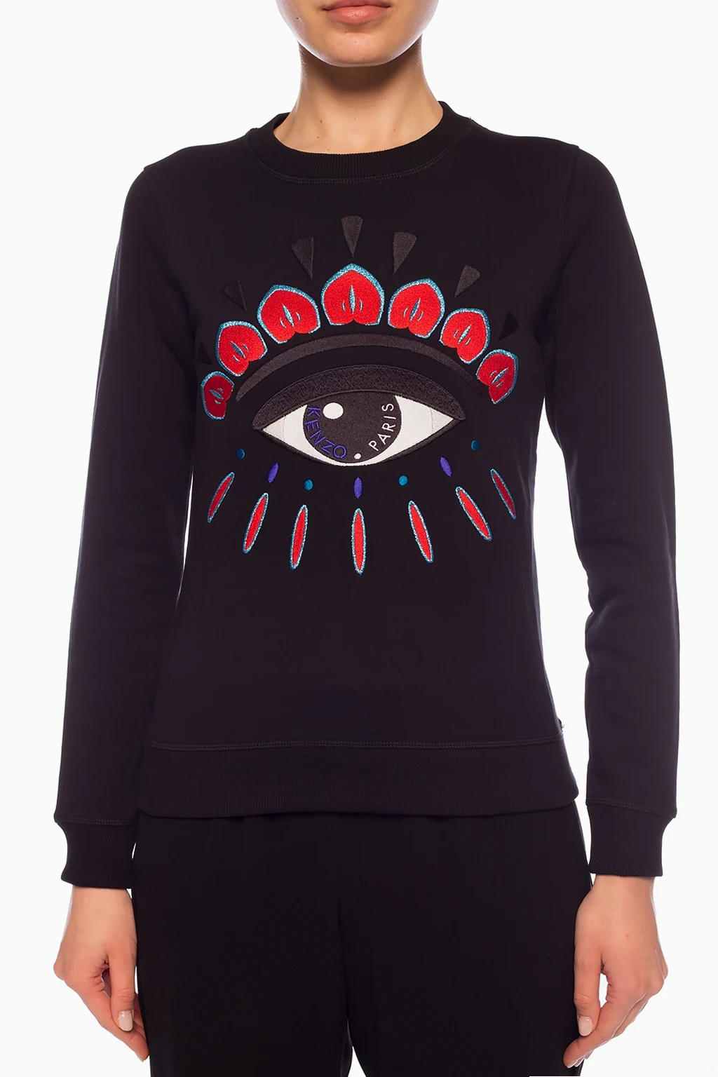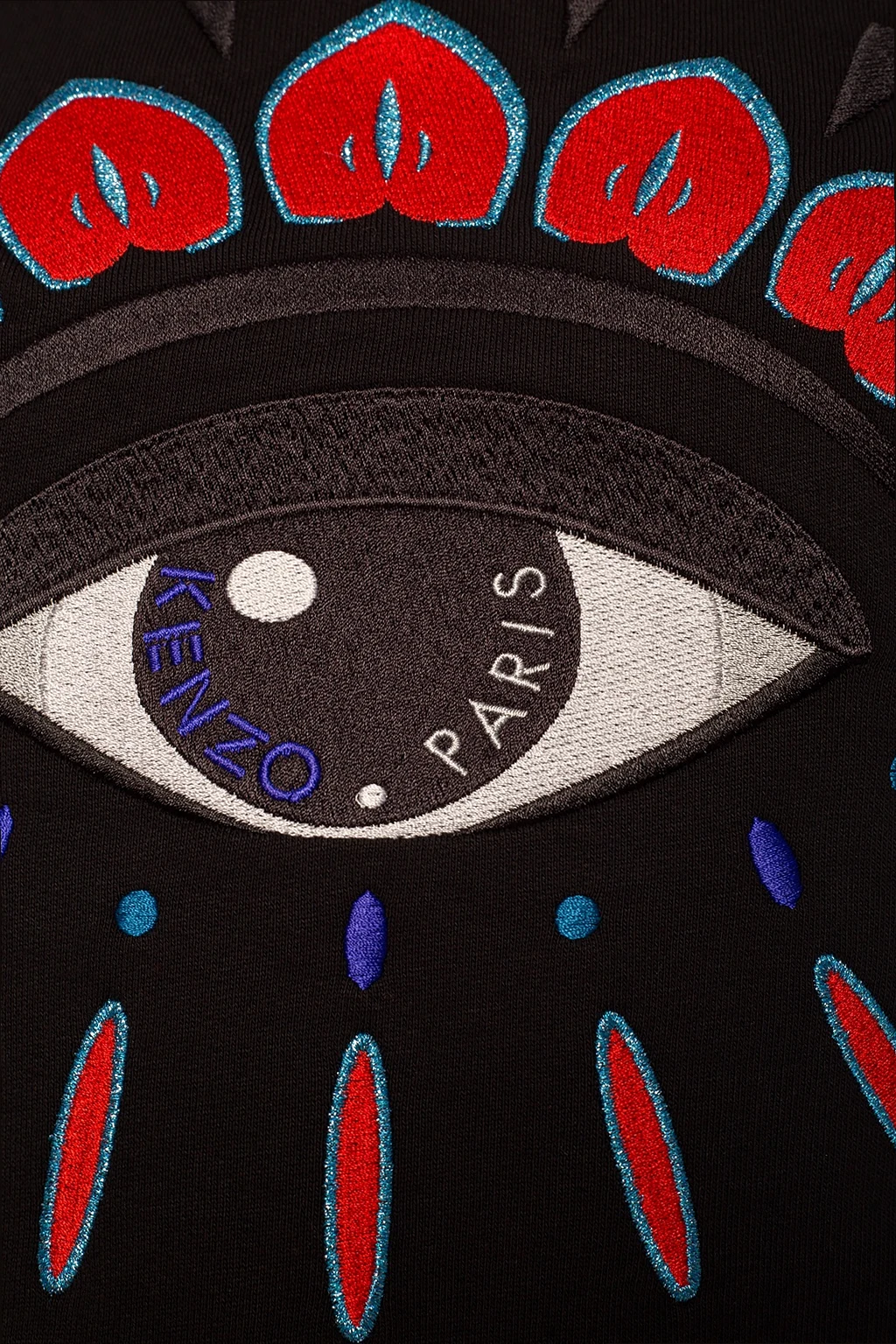 Black crewneck sweatshirt from Kenzo. Made of cotton. Inlaid with silver-tone lurex yarn. Embellished with a colourful graphic print with a motif of eye across the front. Finished with ribbed trims at the bottom hem and cuffs.