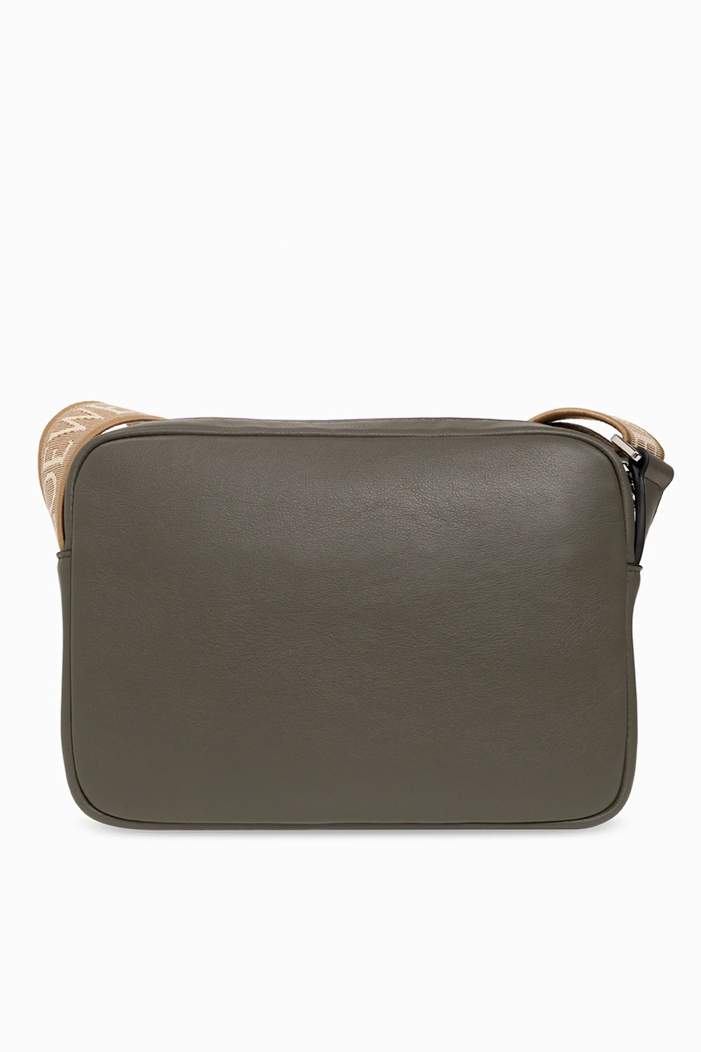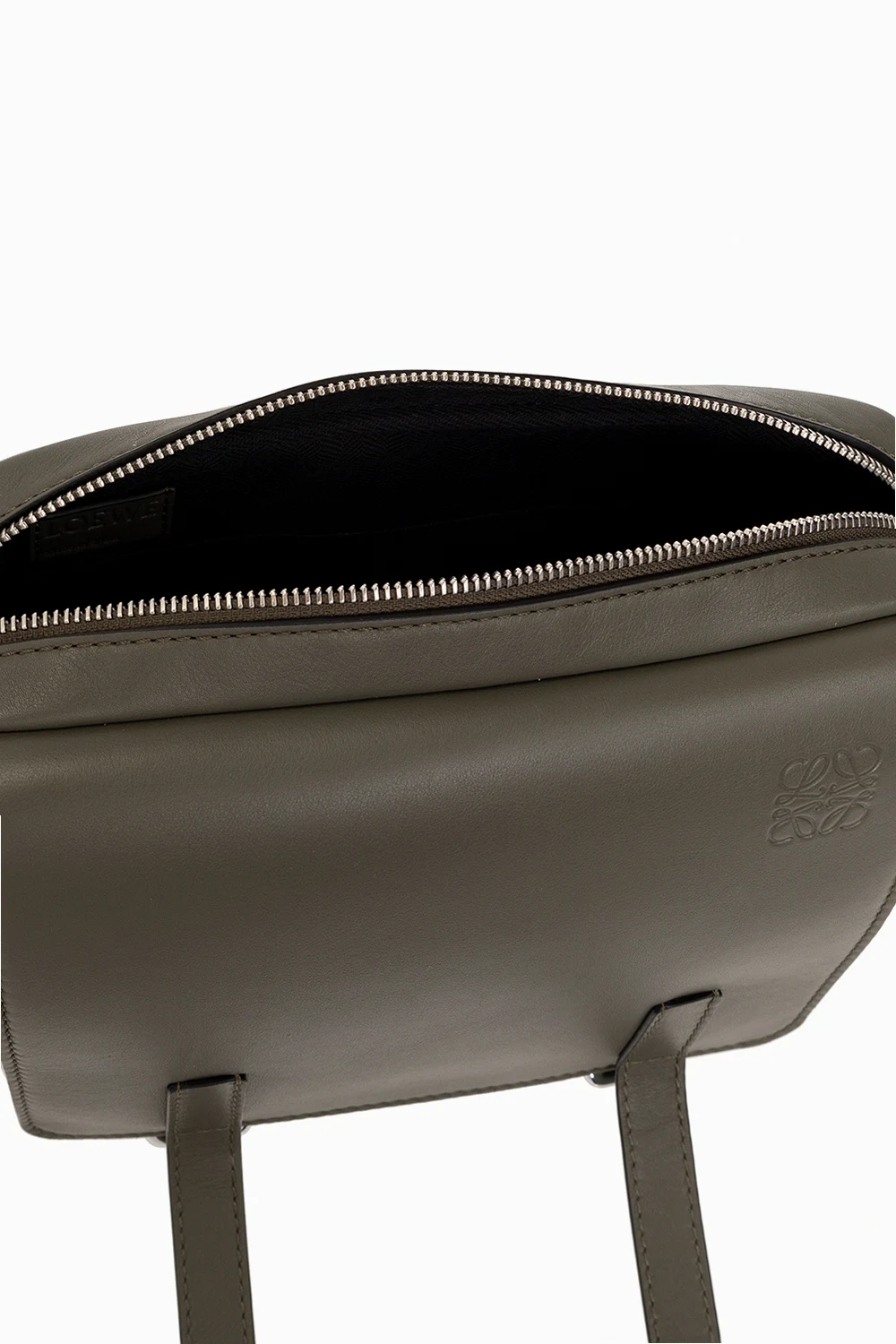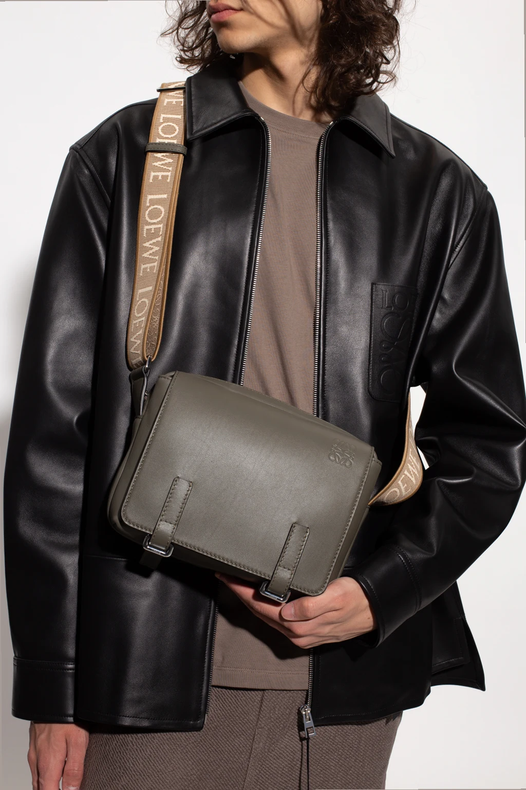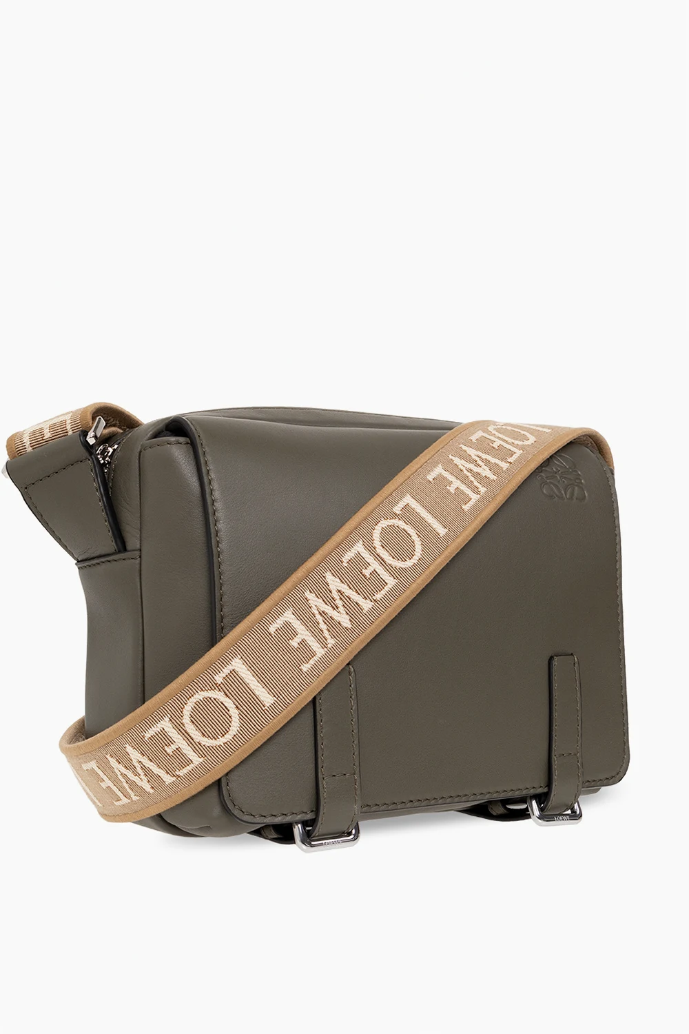 Greenish grey ‘Military’ shoulder bag from Loewe. Made of calf leather, this model features a zip fastening, logo-embroidered shoulder strap, front pocket with buckle straps, silver-tone metal hardware and one internal compartment with one slip pocket.