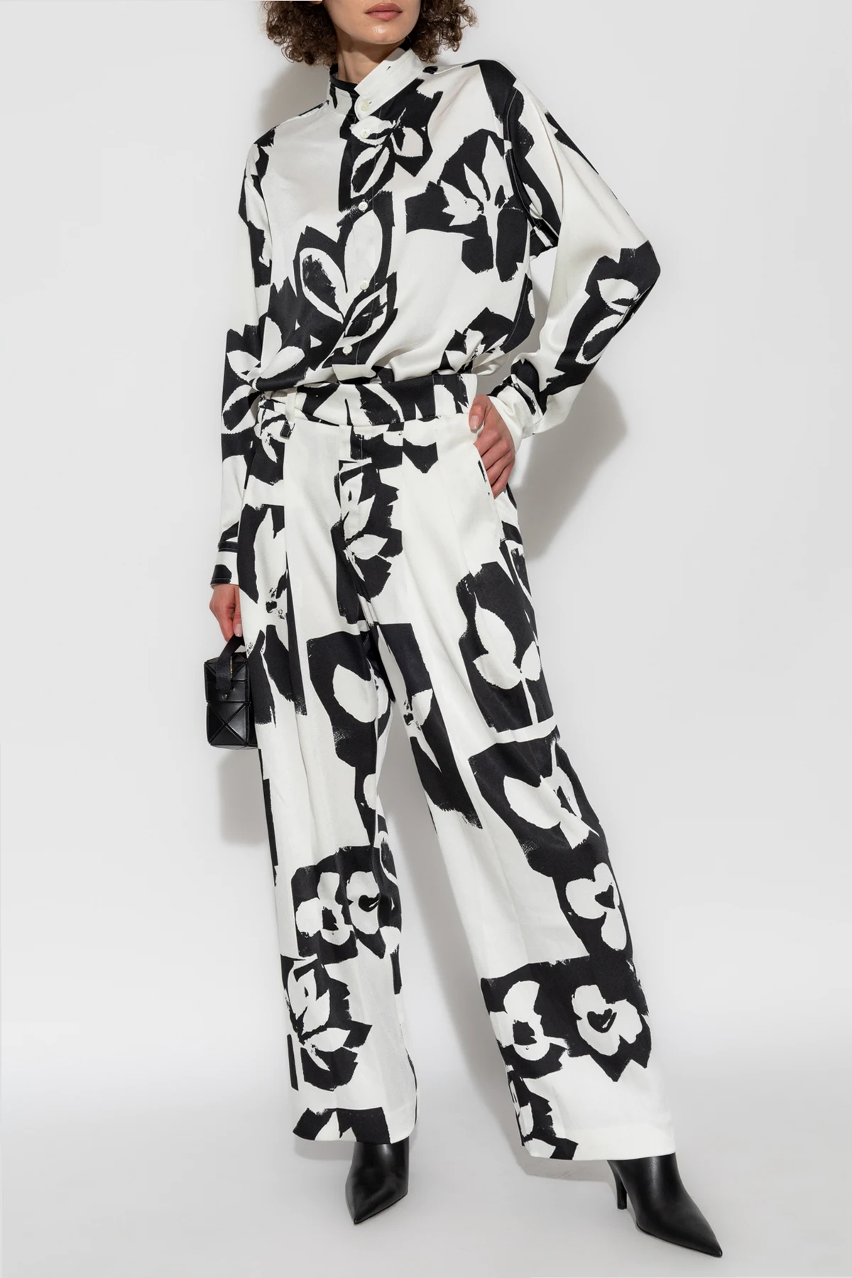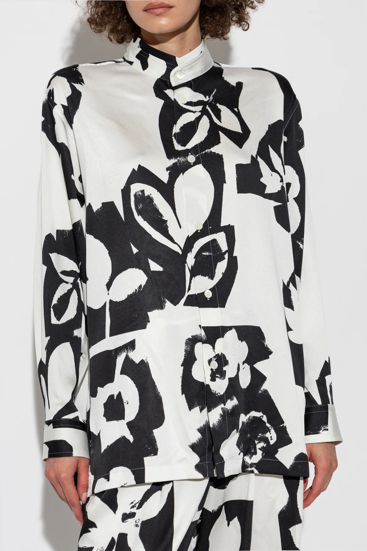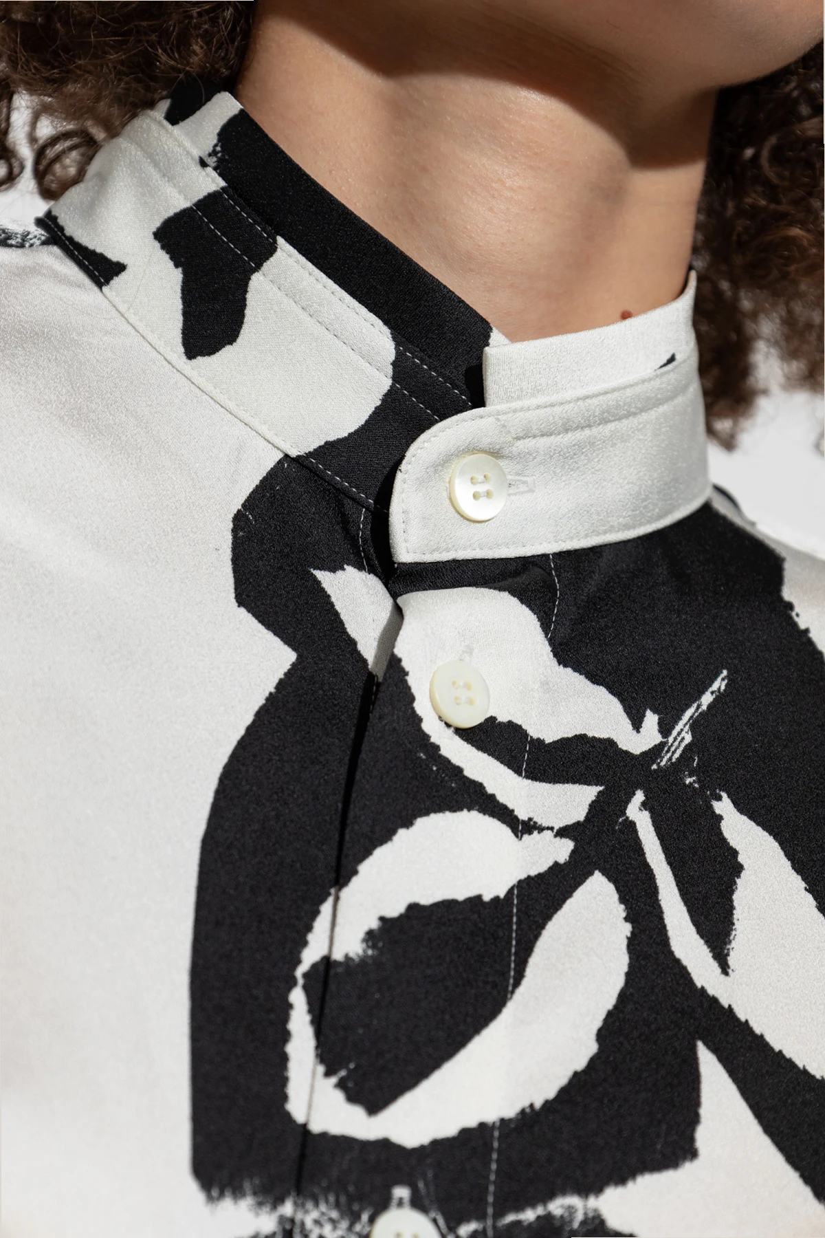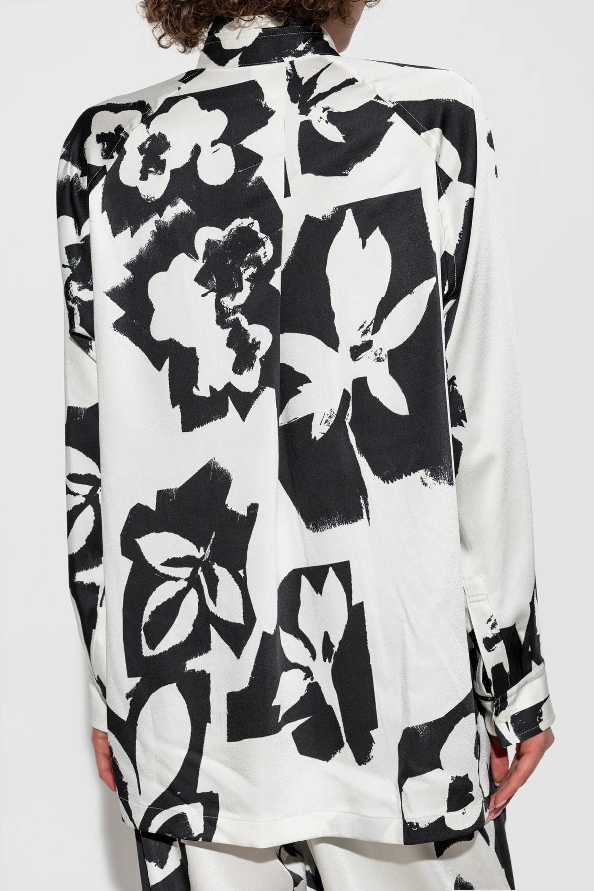 Auf dem weißen Hintergrund des Hemdes befindet sich ein markanter, abstrakter Druck in Schwarz, bestehend aus großen, unregelmäßigen Formen, die an Blumen und Blätter erinnern. Das Ganze ist aus leichtem und atmungsaktivem Material gefertigt, was auf die Verwendung hochwertiger Stoffe hinweist, die typisch für exklusive Marken sind.