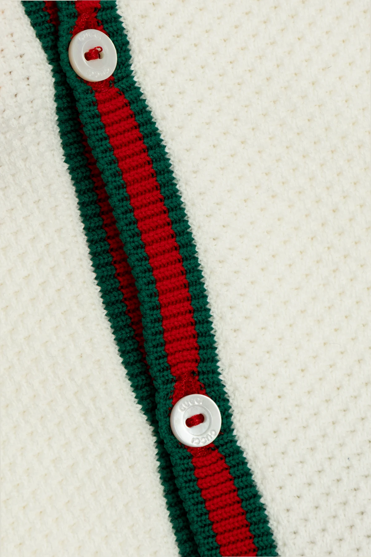 Das Design besticht durch einen zweifarbigen Streifen in Rot- und Grüntönen, der entlang des Verschlusses und um den Ausschnitt verläuft und ihm einen klassischen Charakter verleiht. Weiße Knöpfe mit subtilen Aufschriften sowie die in passenden Farben gehaltenen Kanten betonen seine Exklusivität.
