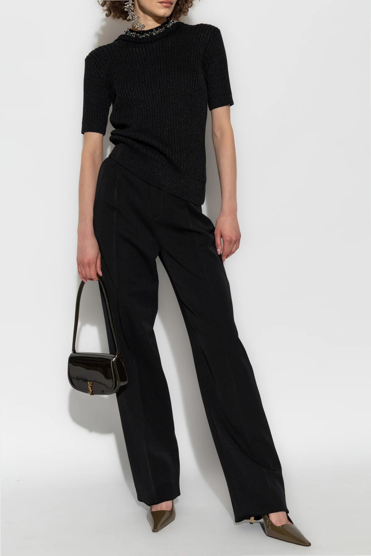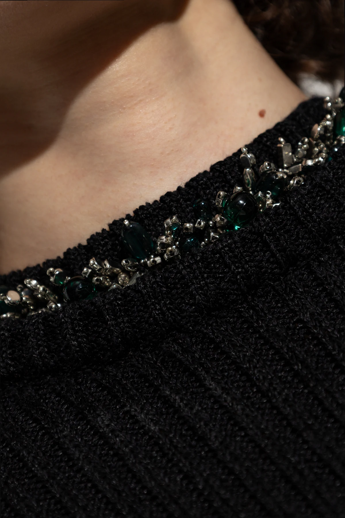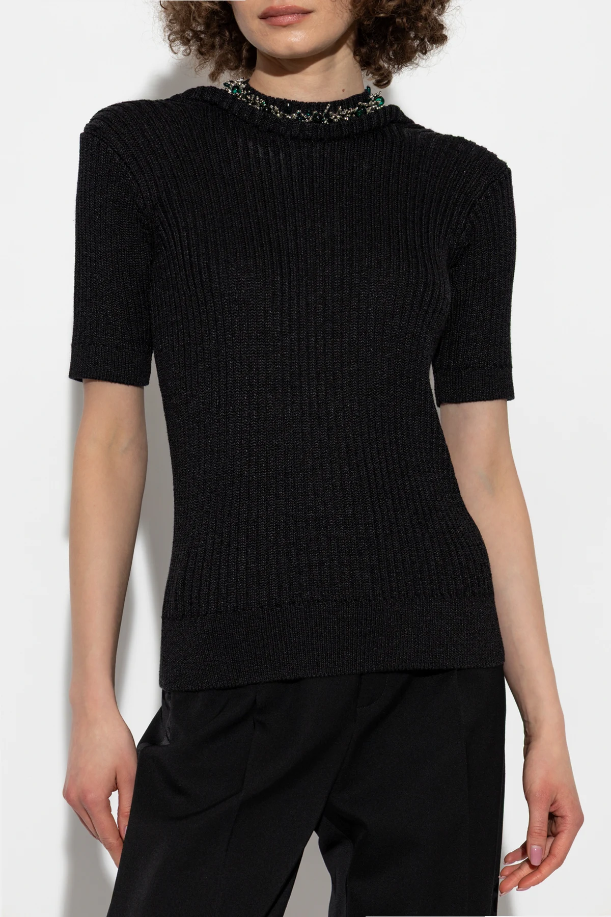 Entdecken Sie unvergleichliche Eleganz mit dem Top mit schimmernden Applikationen aus der exklusiven Kollektion, kreiert von Dries Van Noten, einem der Mitglieder der berühmten Antwerpener Sechs. Dieses außergewöhnliche schwarze Top, gefertigt aus luxuriösem Viskose-Baumwollstrick, besticht durch seine ausgeprägte Textur und den figurbetonten Schnitt, der die Silhouette dezent betont.