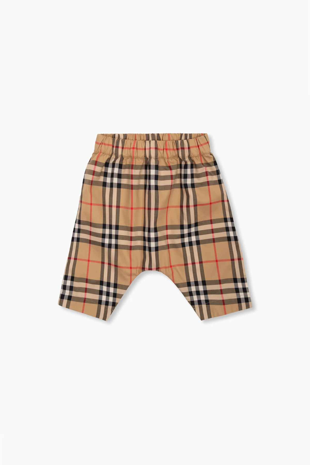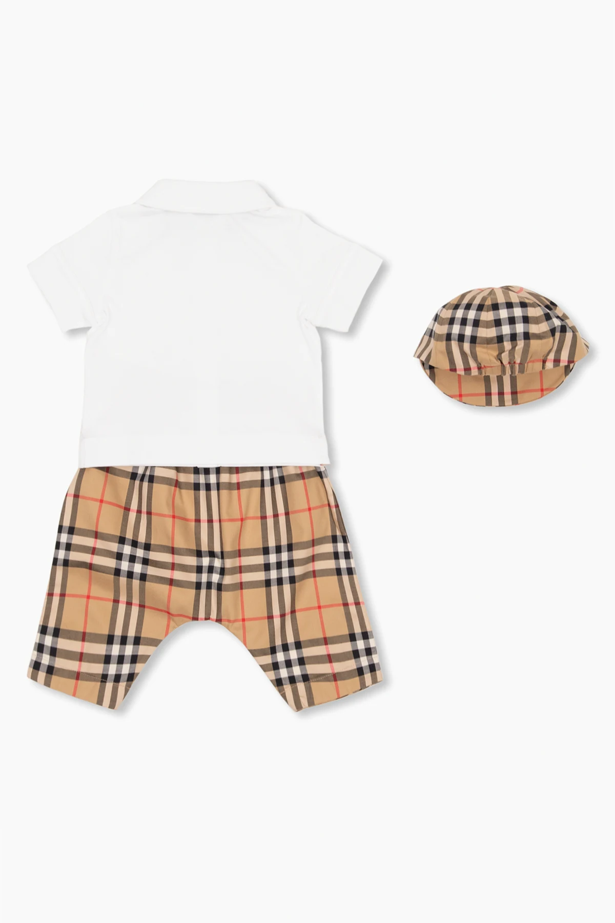 Three-piece baby gift set from Burberry Kids. Made of cotton, it includes a white shirt with button closures and short sleeves and beige trousers and baseball cap flaunting the brand's signature check pattern in red, white and black.
