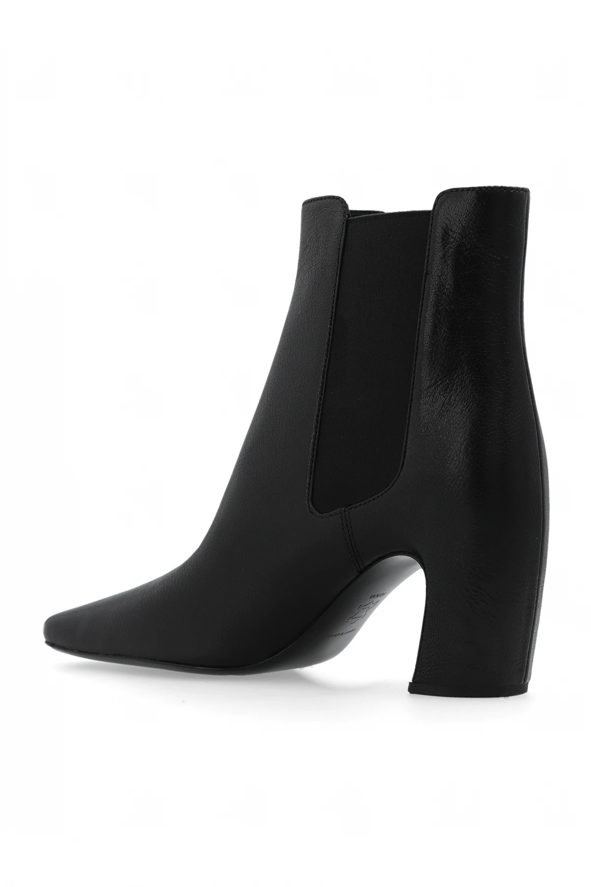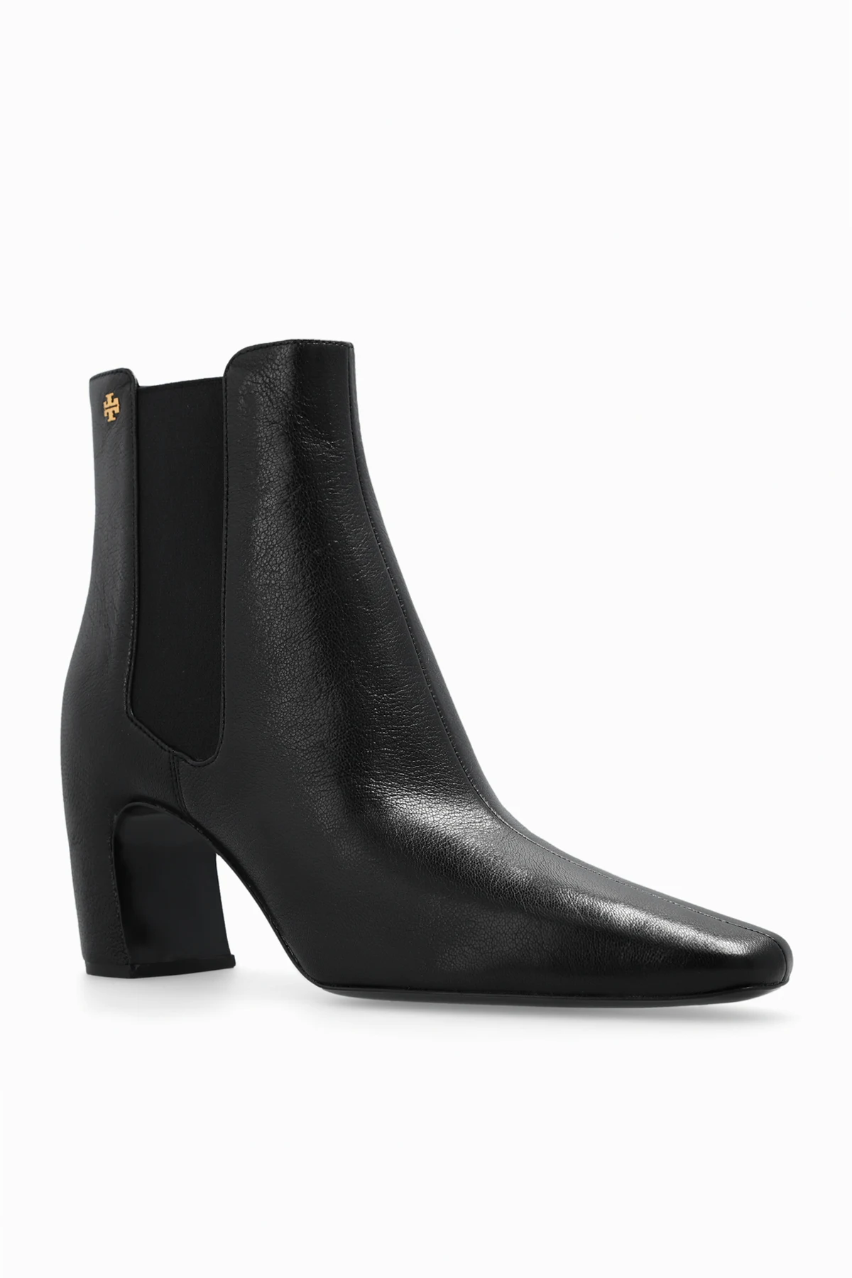 Black heeled ankle boots from Tory Burch. Made of aged leather with a tapered toe, this model sits on a black leather sole and features a gold-tone metal logo plaque and elastic panels on the sides.