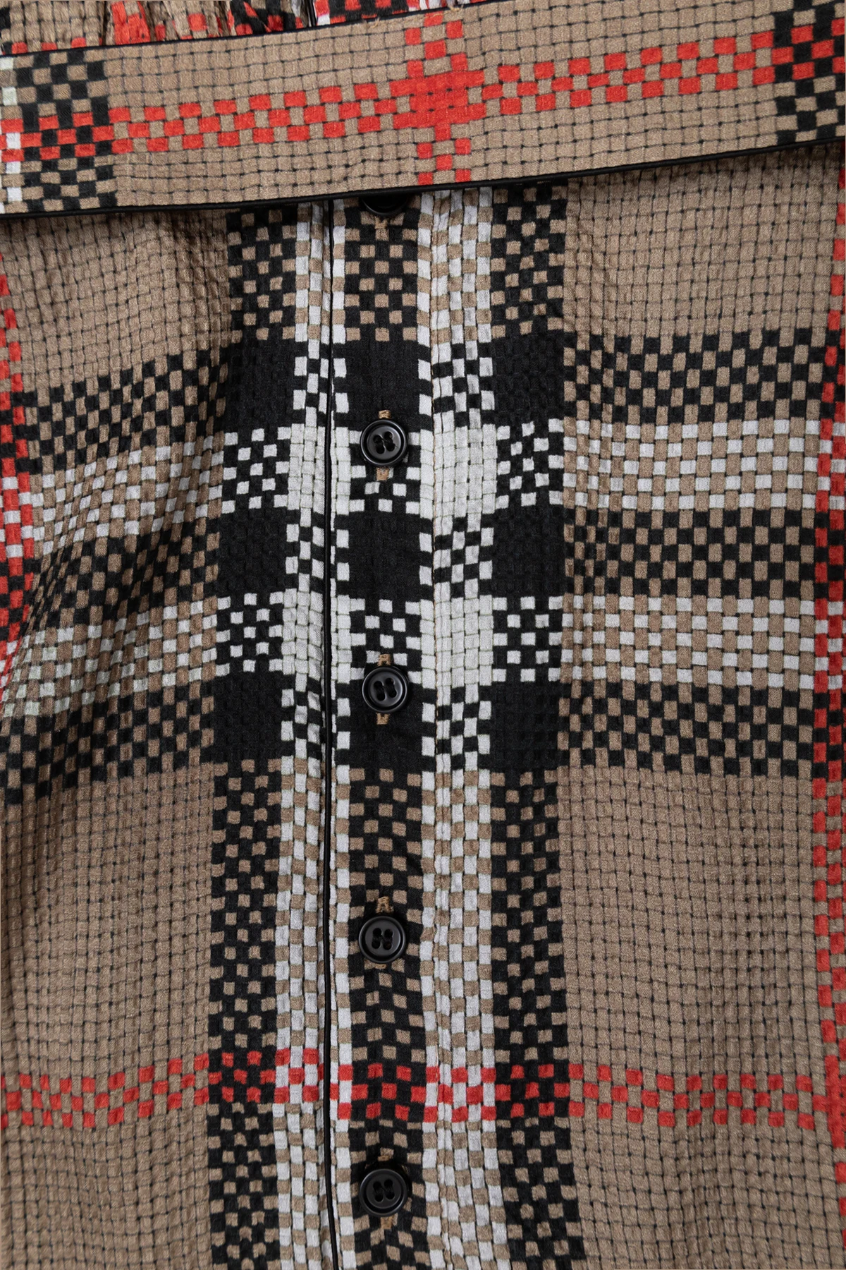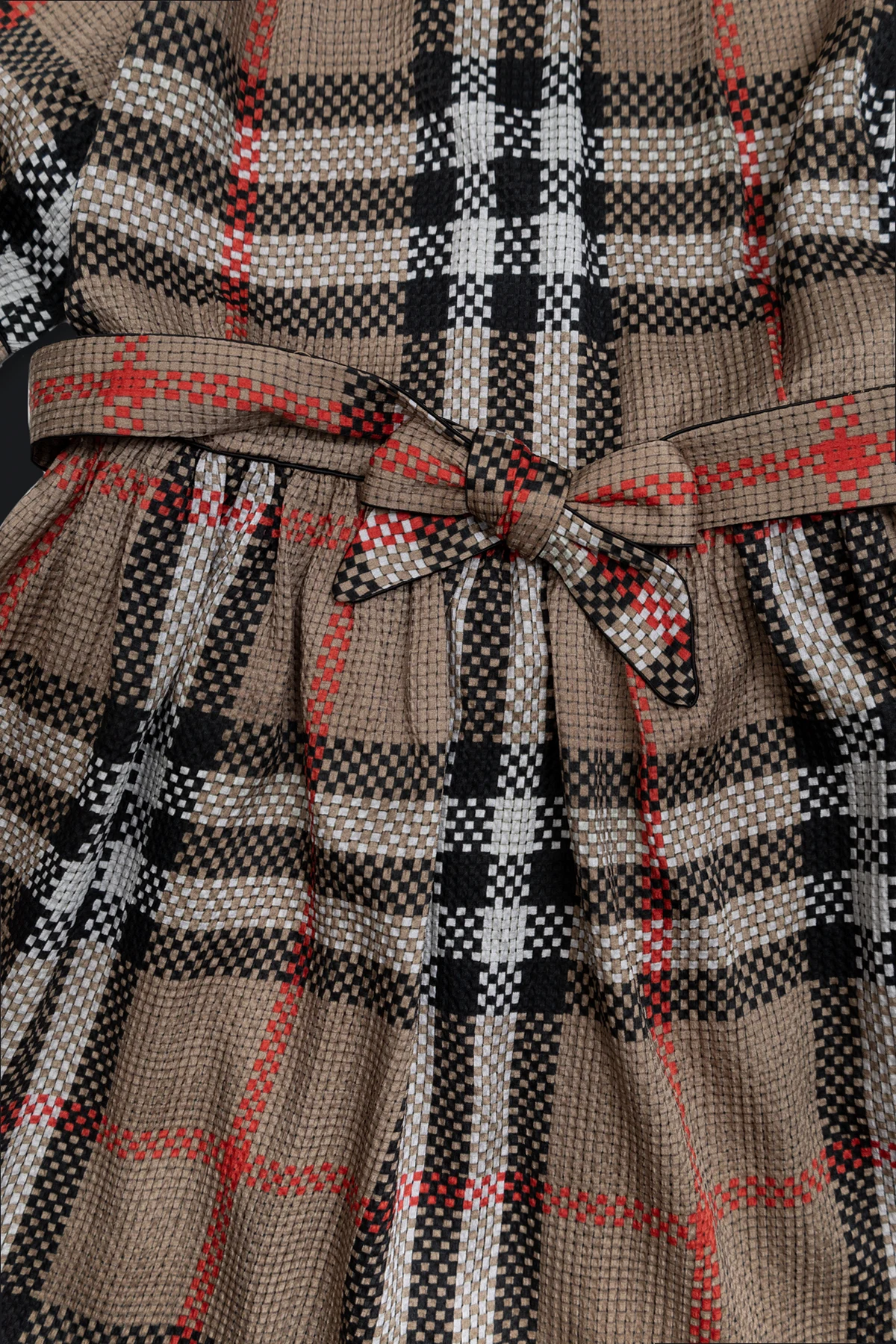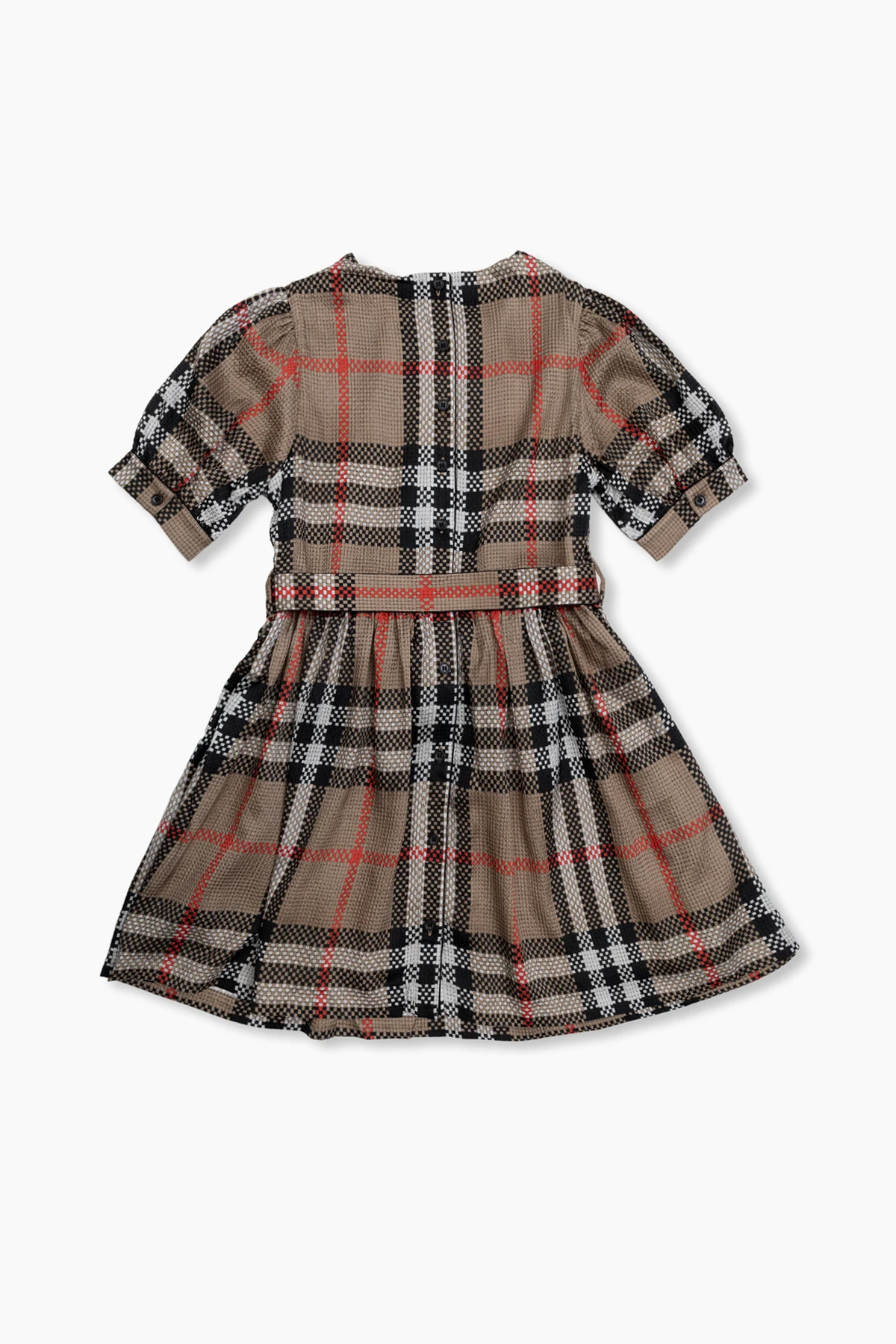 Beige, white and black dress from Burberry Kids. Made of silk, this style is cinched with a tie belt at the waist and showcases a round neck, short sleeves and the brand's signature ‘Nova Check’ motif.