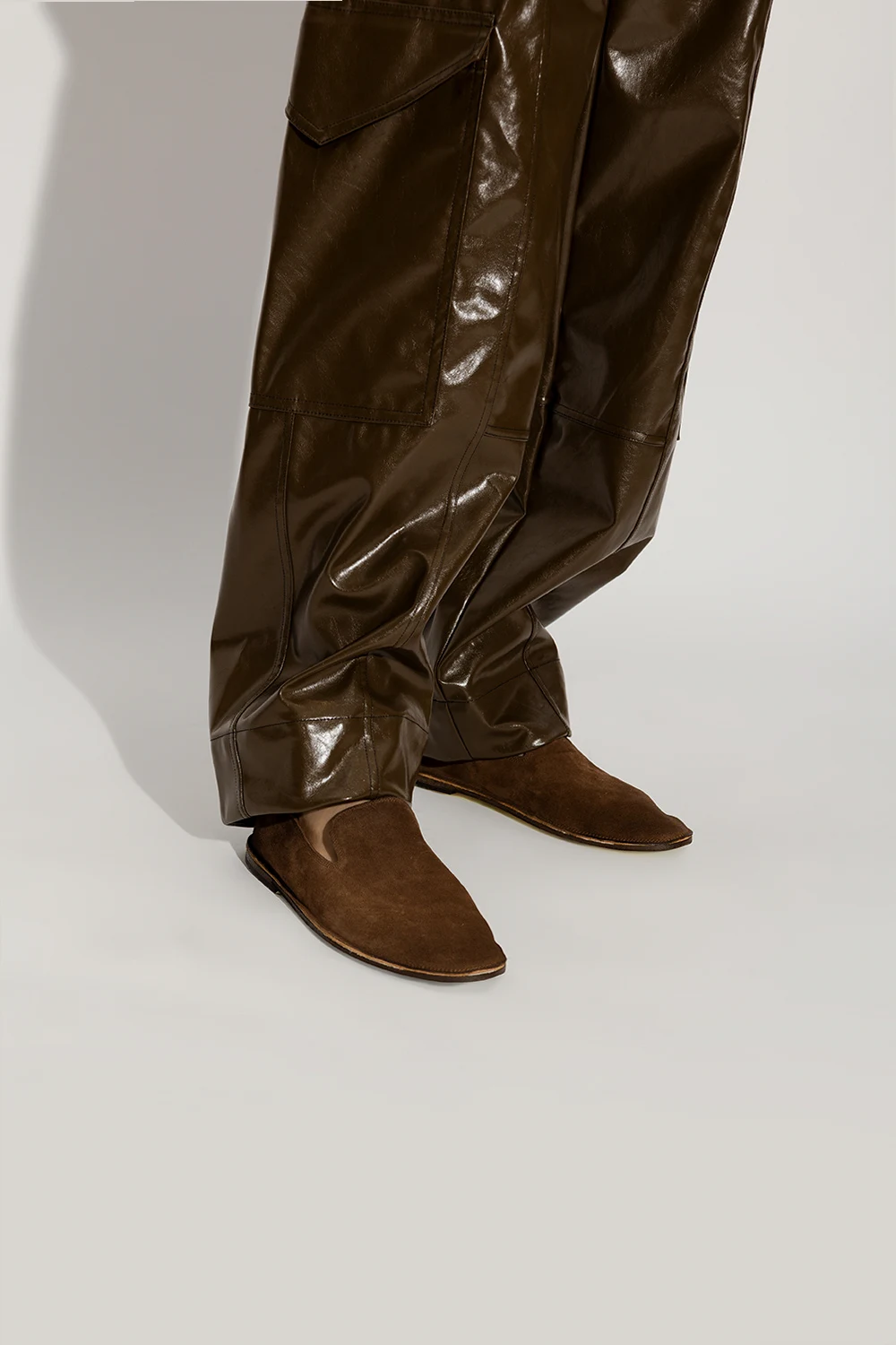 Brown ‘Strasacco’ shoes from Marsell. Crafted from suede with a slip-on silhouette, this model features an almond-shaped toe and a brown leather sole with a rubber trim.